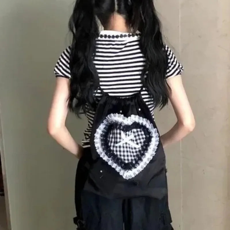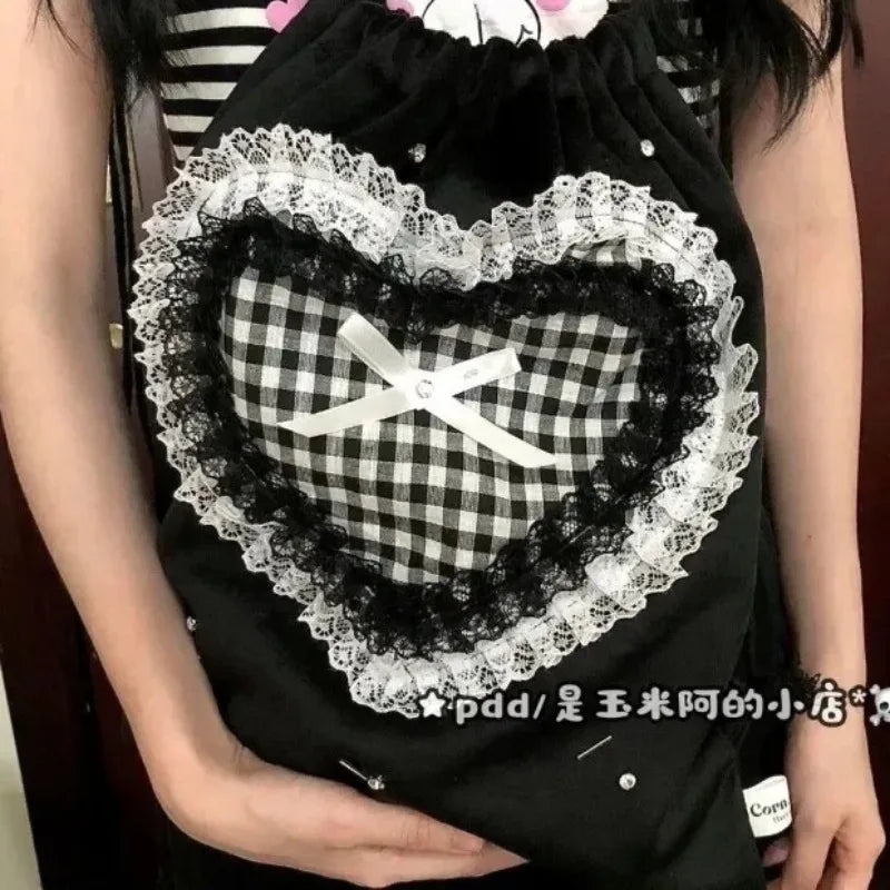 KYLETHOMASW - Lace Plaid Love Heart Mochilas Mujer Sweet Cute Bow Mochila Drawstring Bag Portable Lightweighte Backpack Y2k Bags for Woman