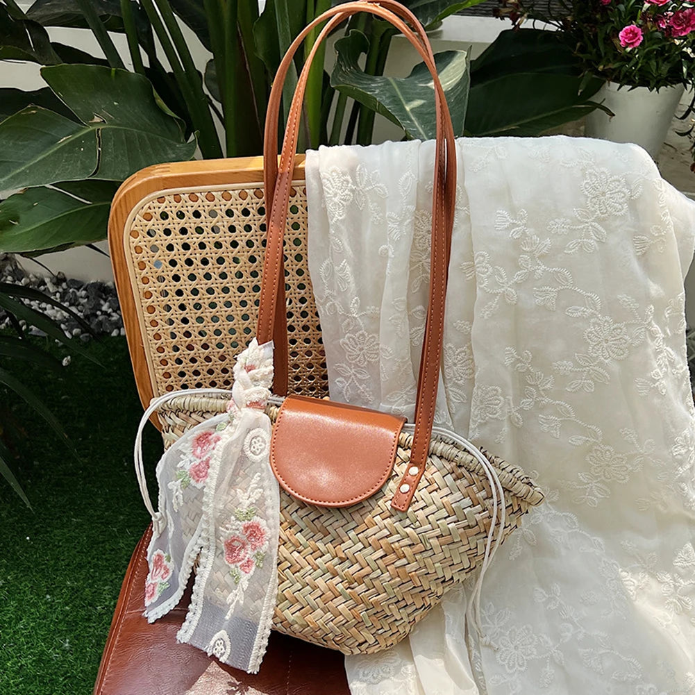 KYLETHOMASW - Women Straw Woven Tote Bag Summer Beach Bags Large Capacity Tote Clutch Bags with Ribbon Chic Hobo Bag for Party Vacation