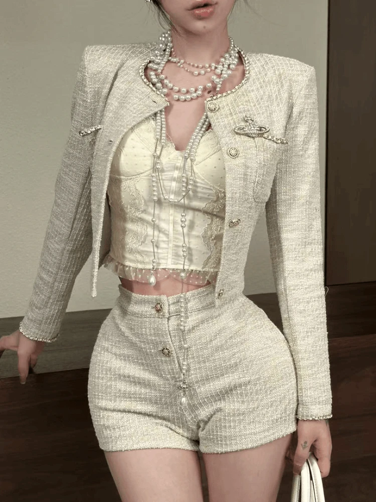 KYLETHOMASW - Autumn Korean Elegant Slim Outfits 2 Piece Set Women Y2k Office Lady Long Sleeve Short Coat + Sexy Bodycon Higt Waist Shorts New
