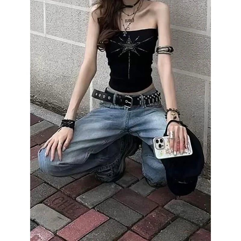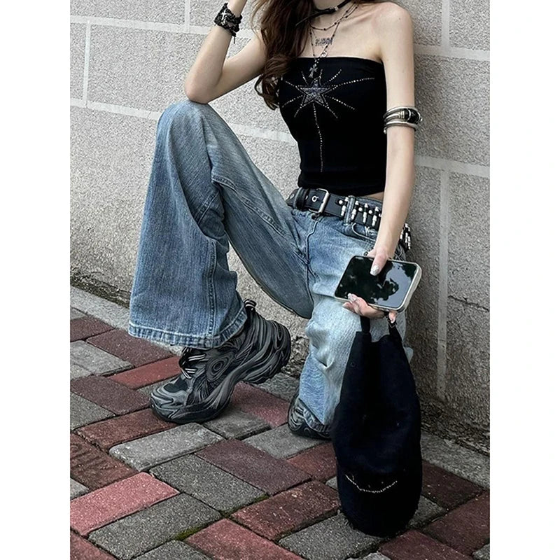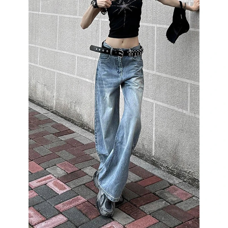 KYLETHOMASW - Blue Womens Jeans High Waist Vintage Design Hip Hop Straight Baggy Denim Pants Street Y2K American Style Wide Leg Denim Trouser