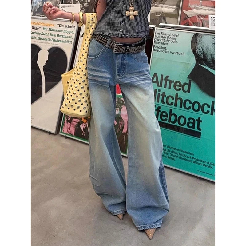 KYLETHOMASW - Blue Womens Jeans High Waist Vintage Design Hip Hop Straight Baggy Denim Pants Street Y2K American Style Wide Leg Denim Trouser