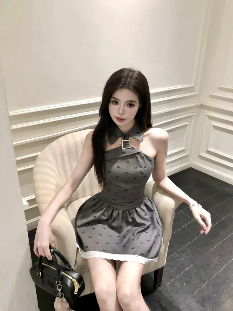 KYLETHOMASW - Bow Printed Halter Neck Dress Women's Summer Strapless Slim Fit A-line Short Dress Fashion Female Clothes