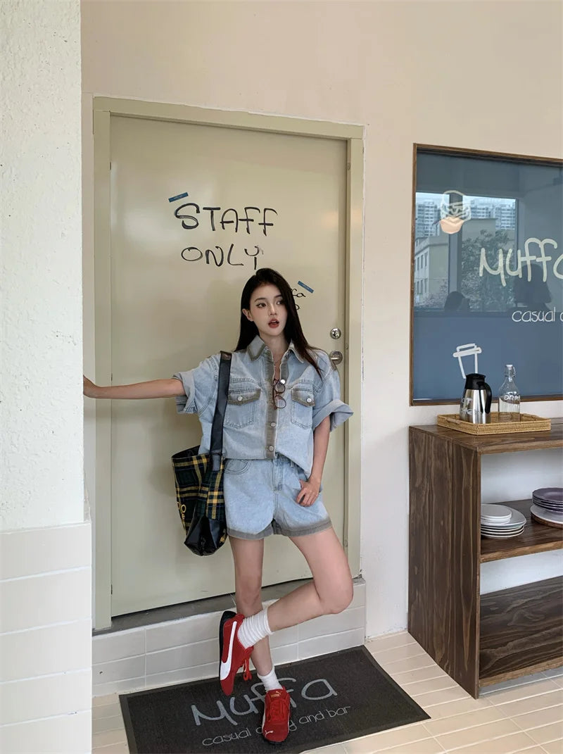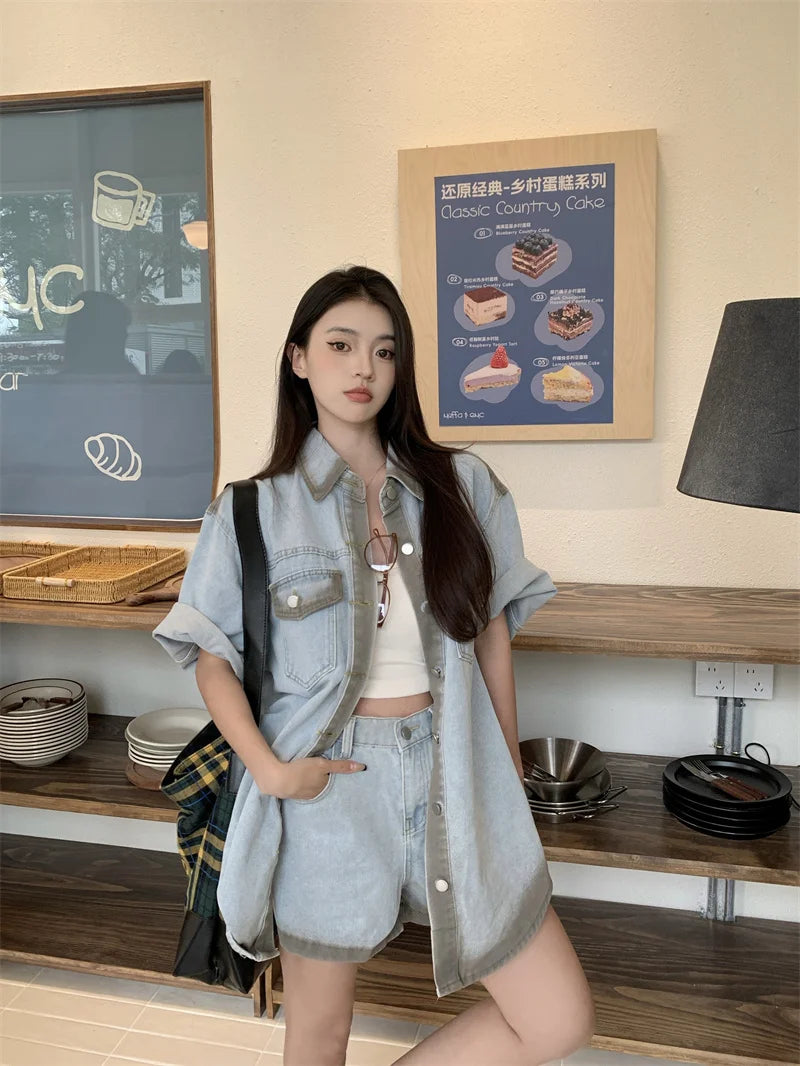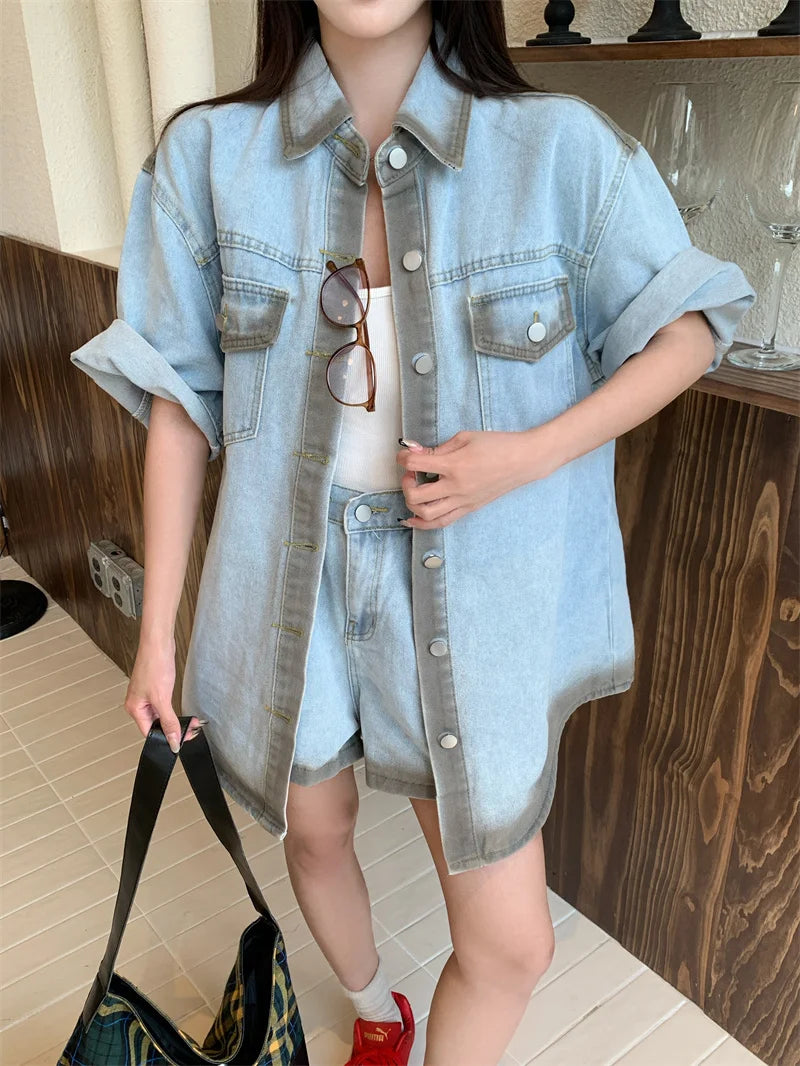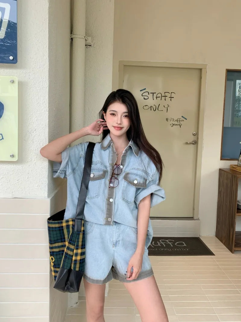 KYLETHOMASW - Casual Denim Suit Women's Summer Turn-down Collar Short-sleeved Shirt High Waisted Shorts Two-piece Set Fashion Female Clothes