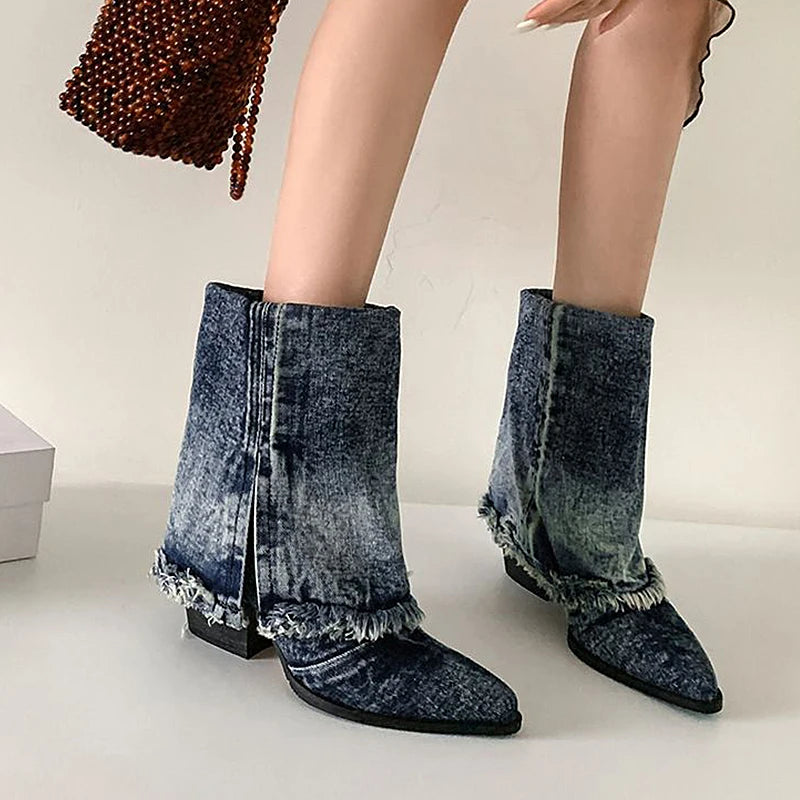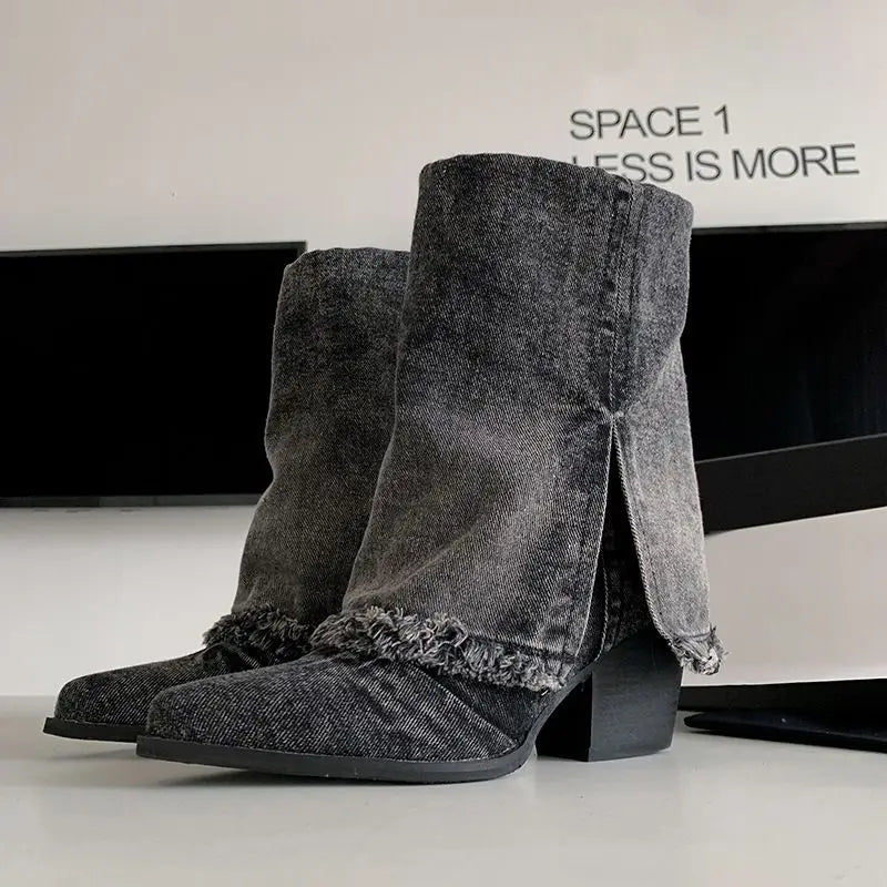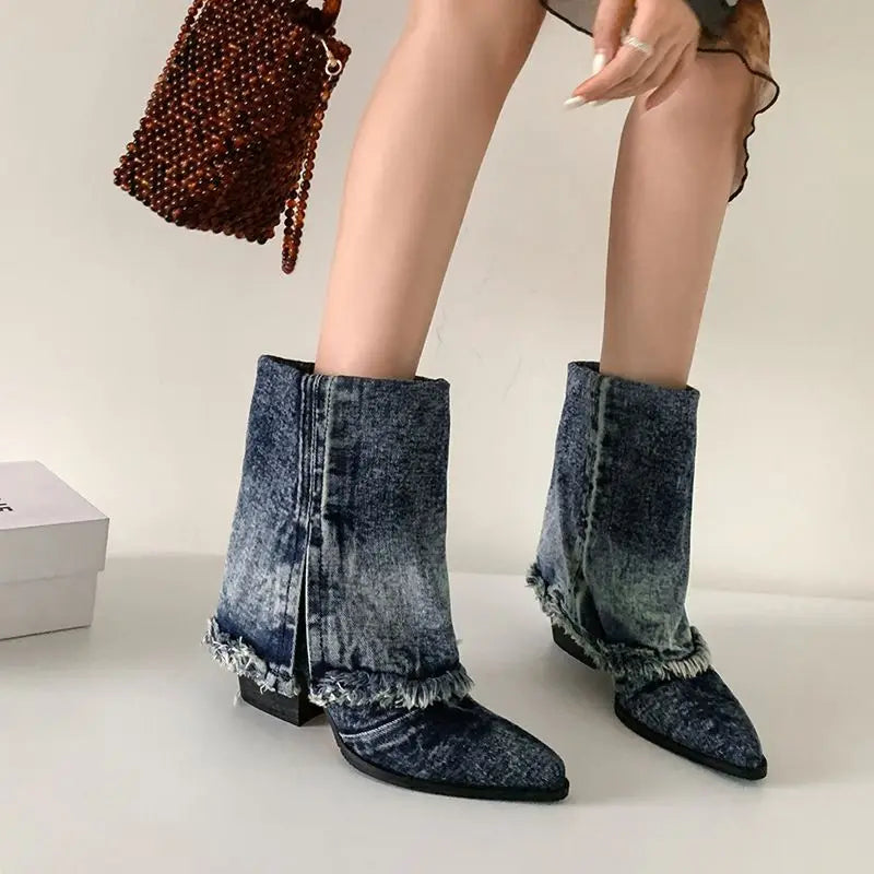 KYLETHOMASW - Designer Lapel Denim Women Ankle Boots Autumn and Winter Pointed Toe Korean Version Cowboy Boots Sexy Hottie Short Single Botas