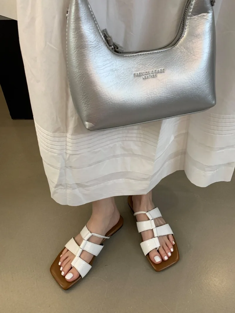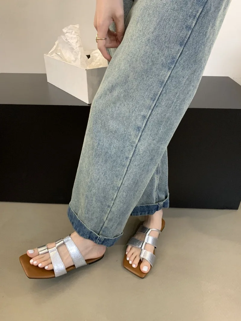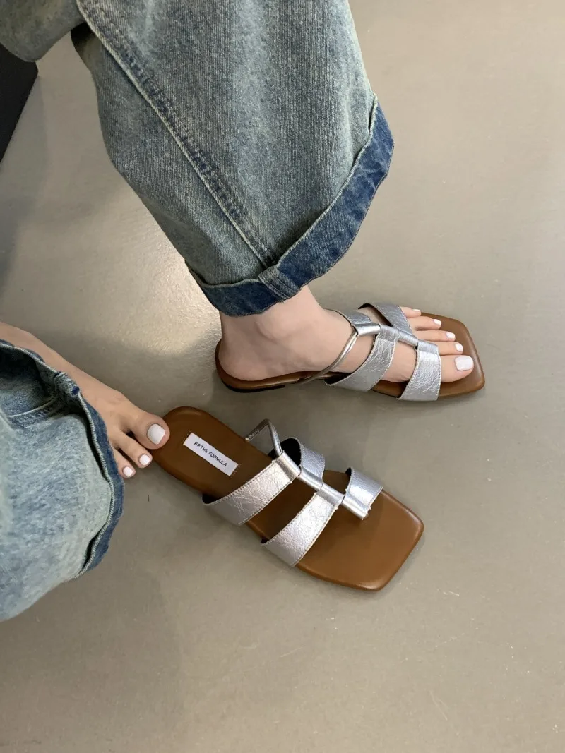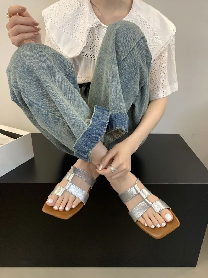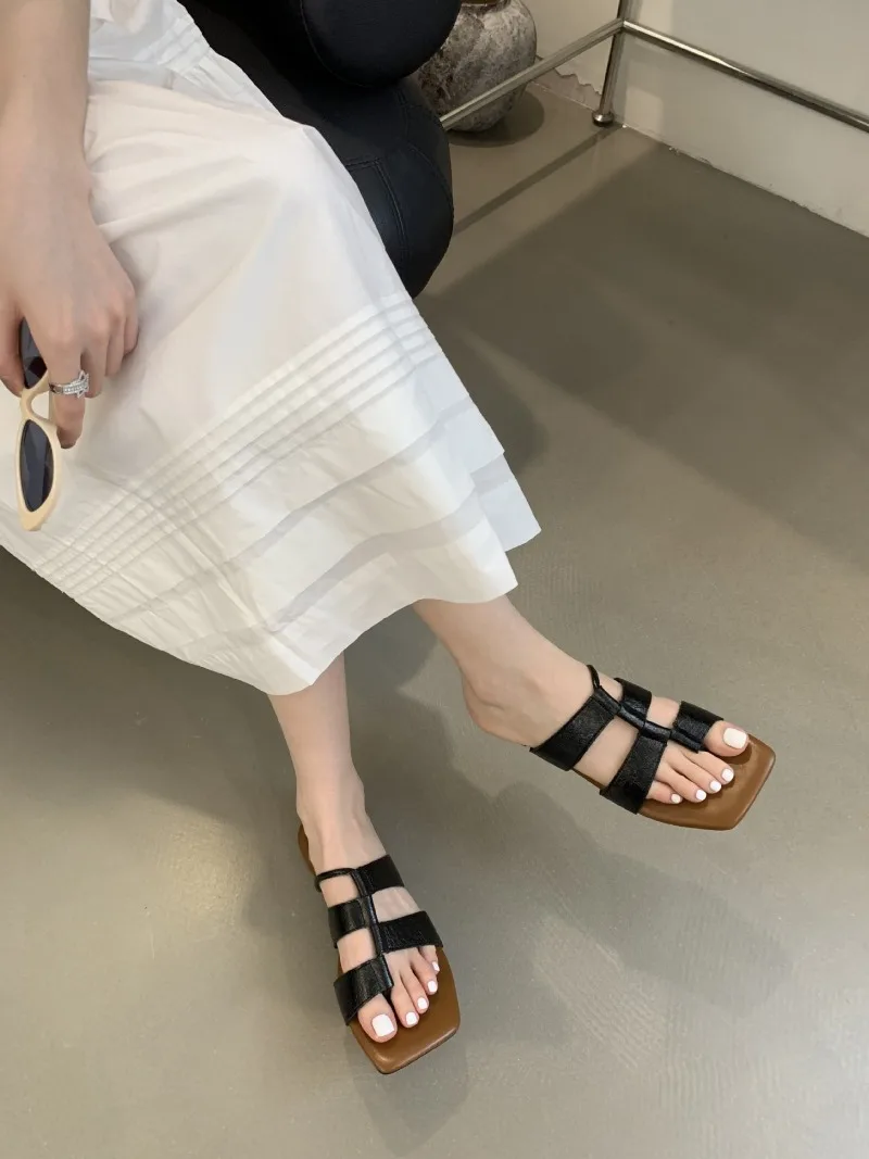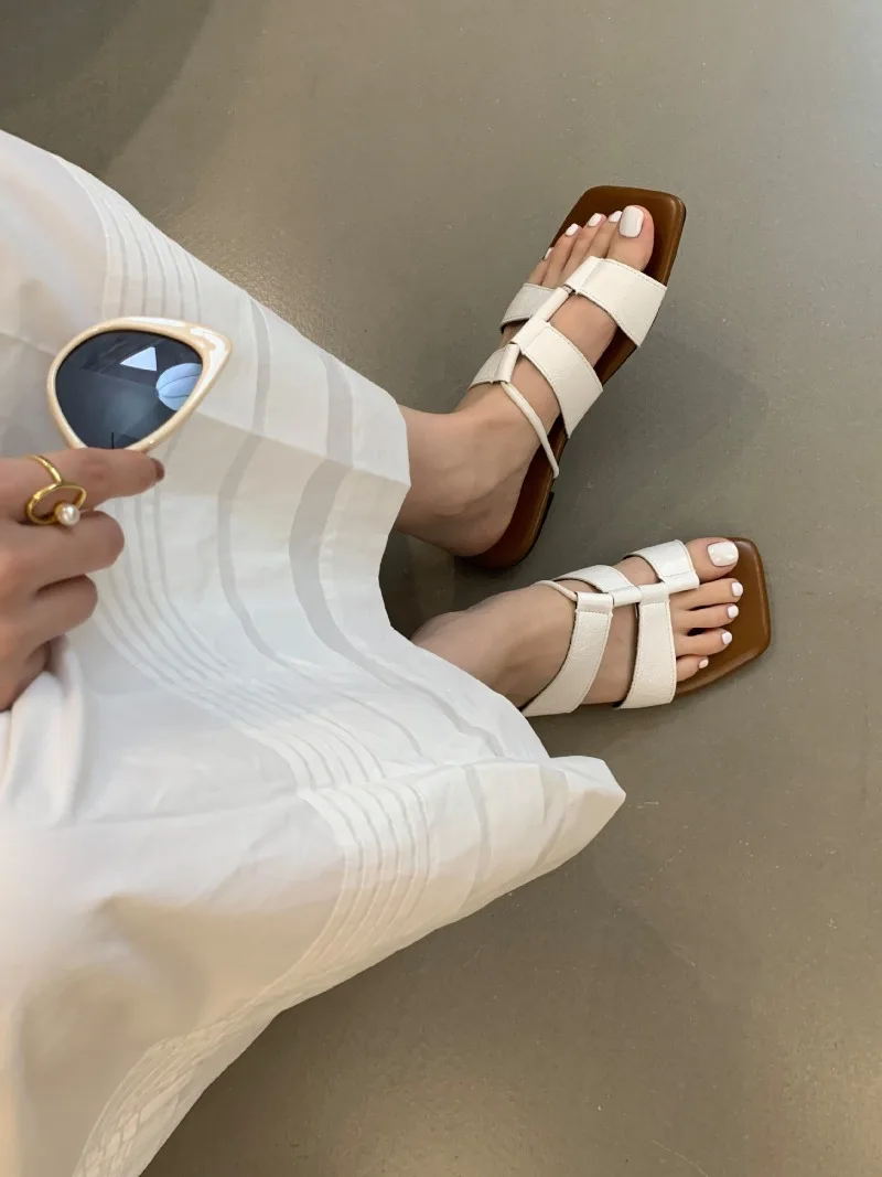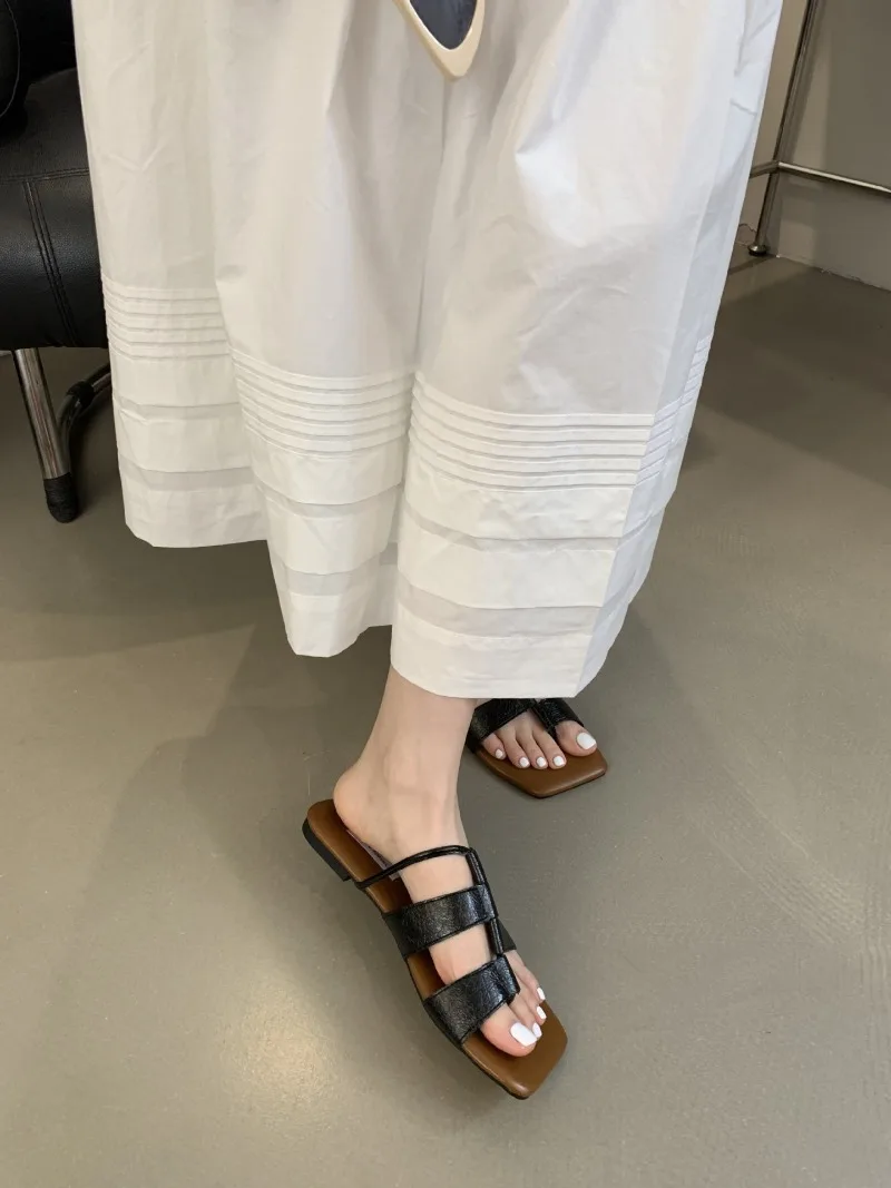 KYLETHOMASW  -  Designer Set Toe Flat Sandals Women Fashion Square Head Hollow Slippers Summer Party Soft Bottom Beach Shoes Flip Flops Women