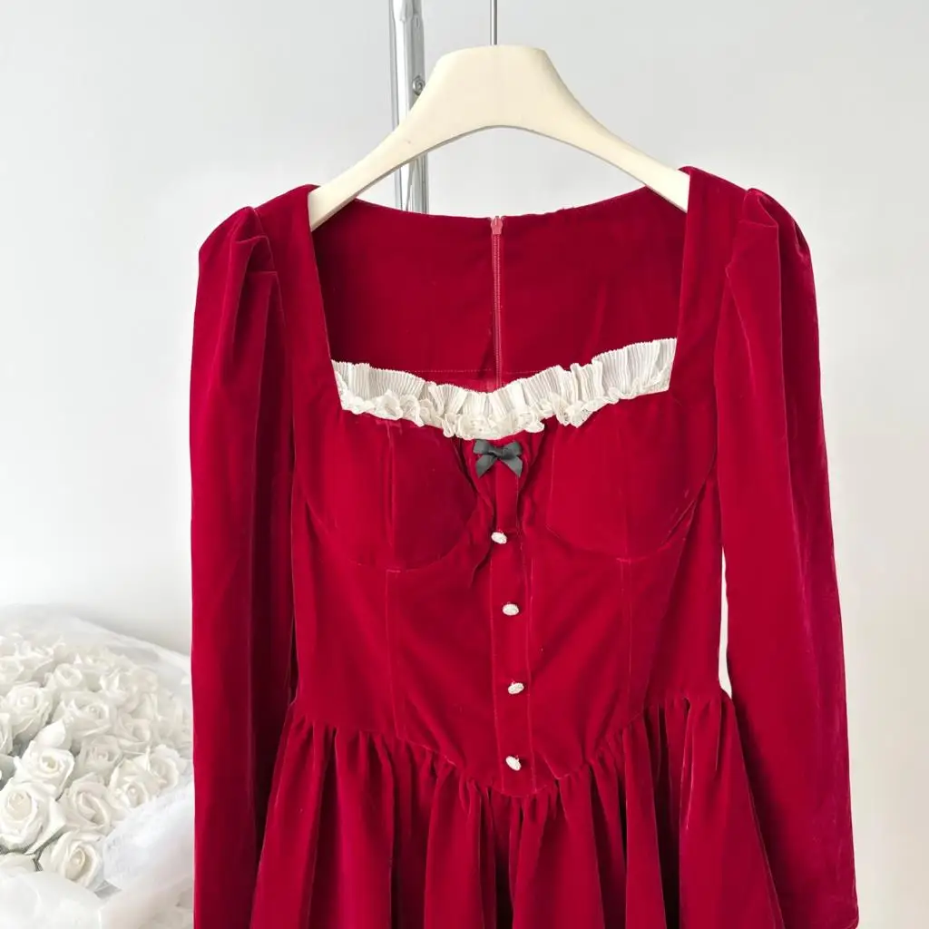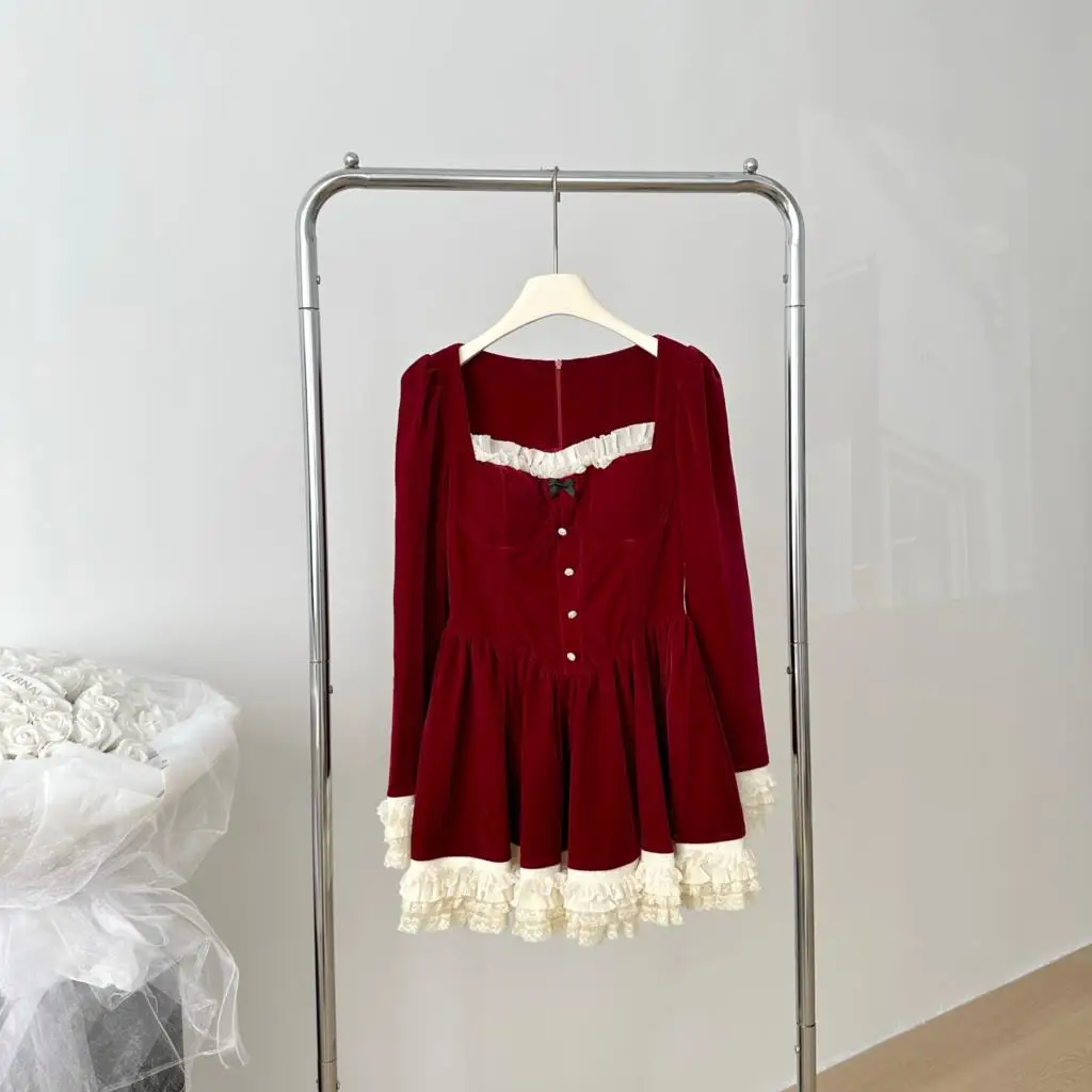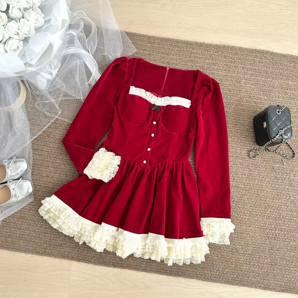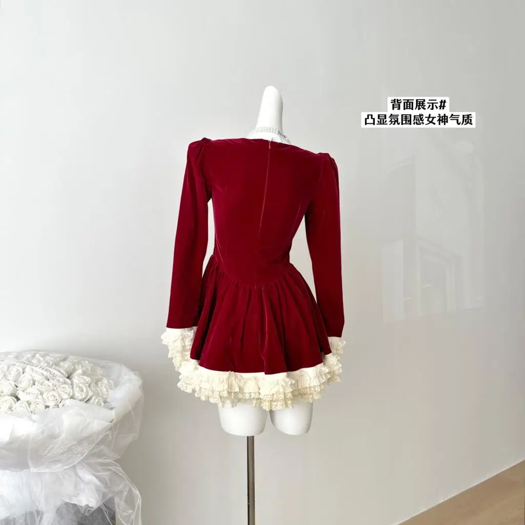 KYLETHOMASW - Elegant Velvet Lace Ruffles Patchwork Short Dresses for Women Long Sleeve A-line Korean Fashion Christmas Birthday Party Dress