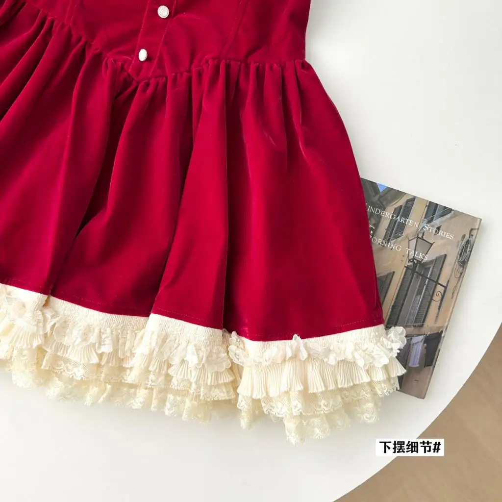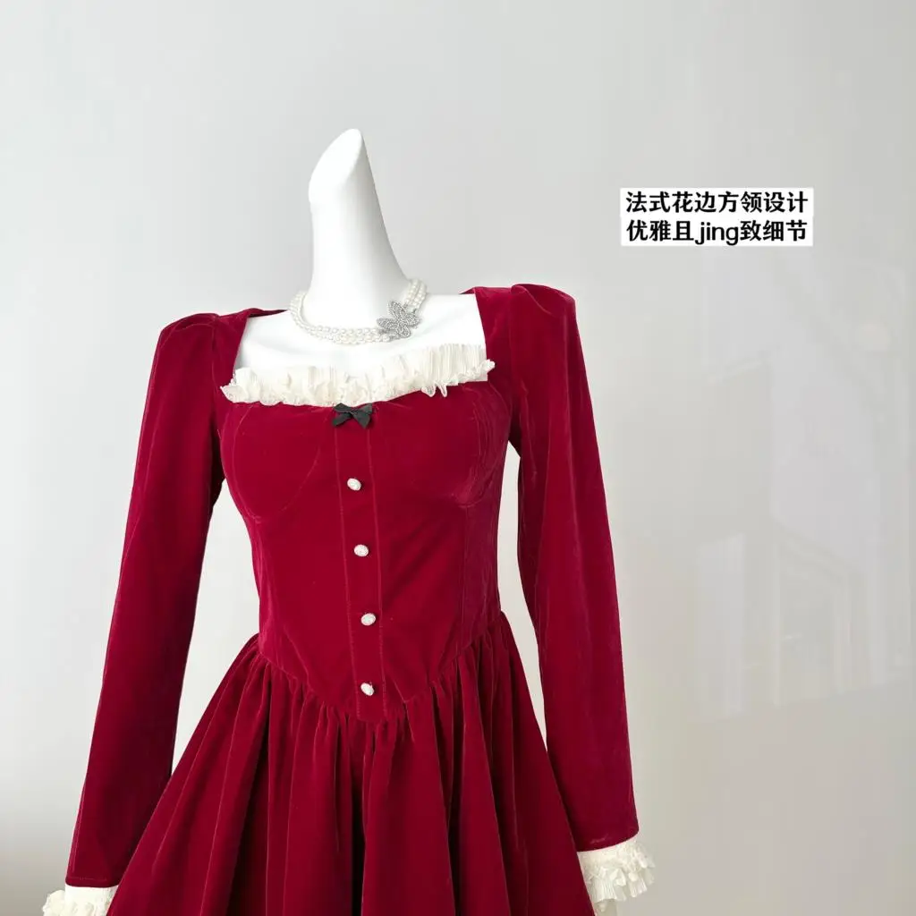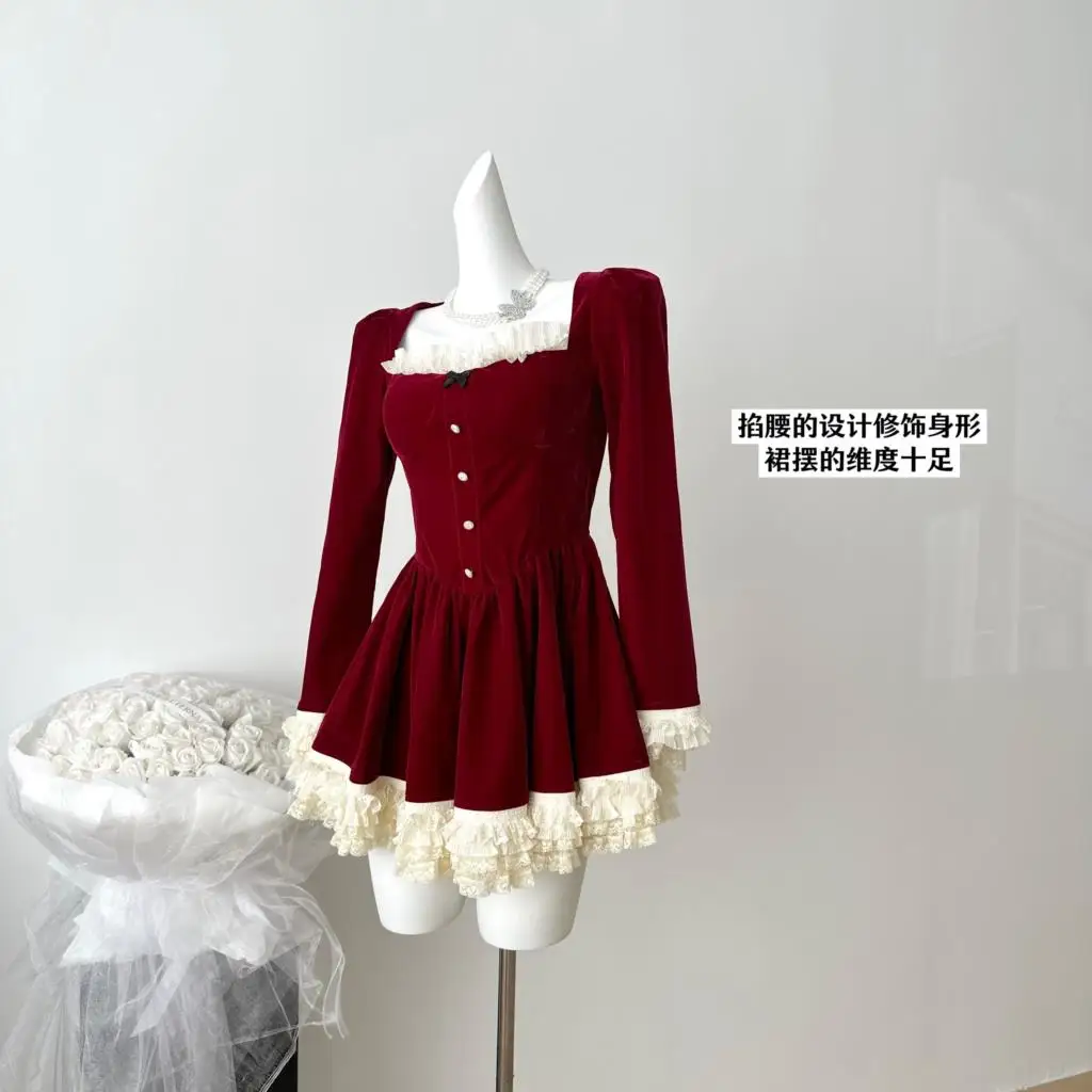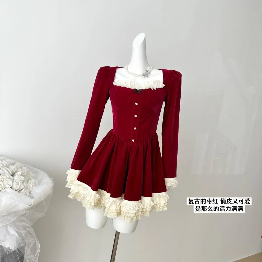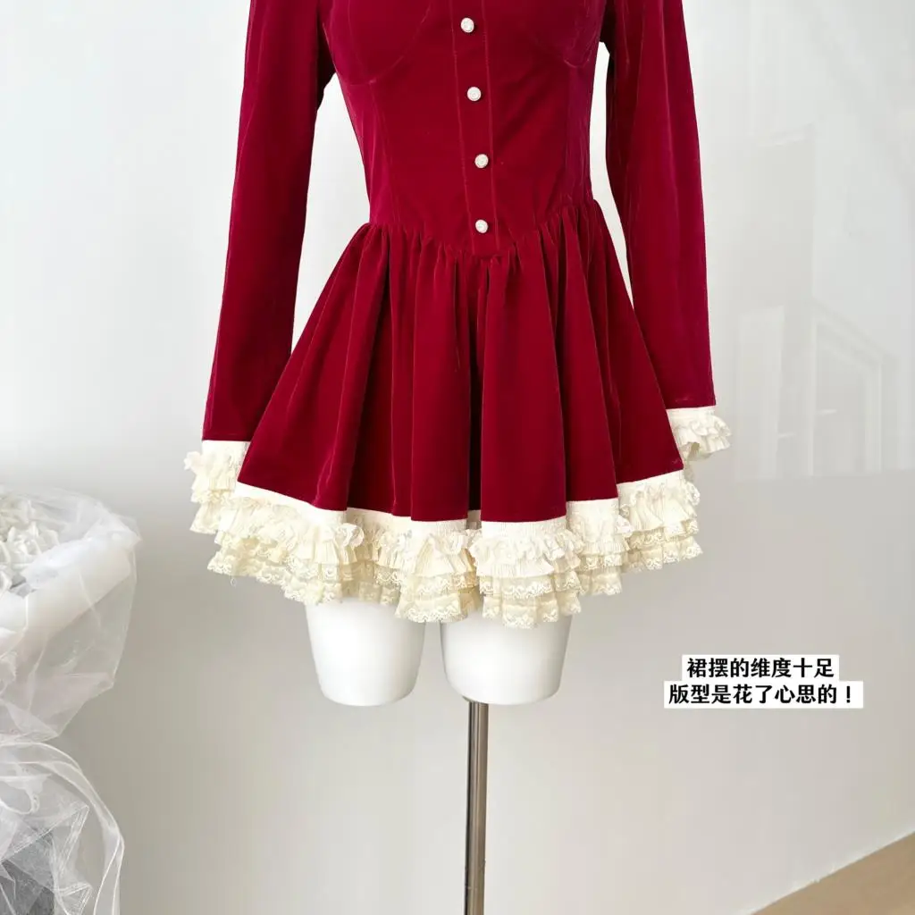 KYLETHOMASW - Elegant Velvet Lace Ruffles Patchwork Short Dresses for Women Long Sleeve A-line Korean Fashion Christmas Birthday Party Dress