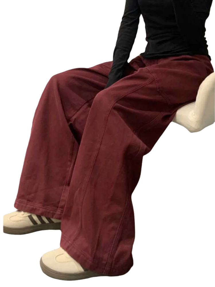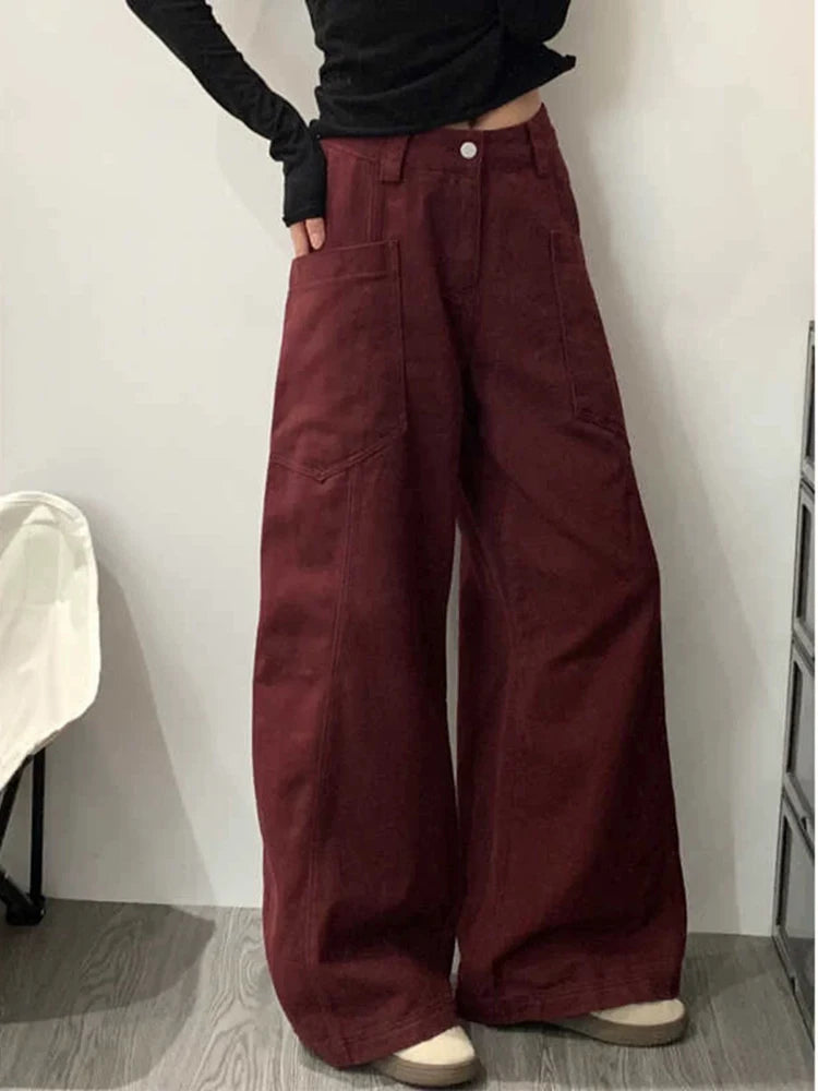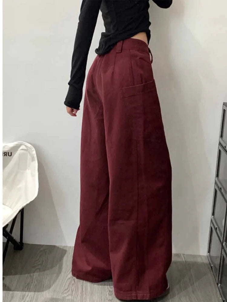 KYLETHOMASW  -  Female Solid Color Slim Casual Women Pants Autumn High Waist Loose Cargo Pants Red Simple Basic Fashion Pants Female Chicly