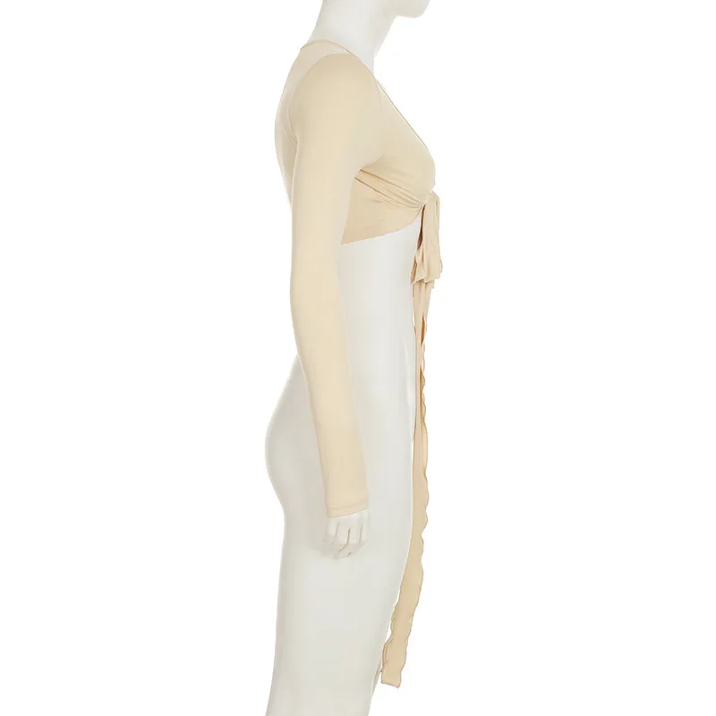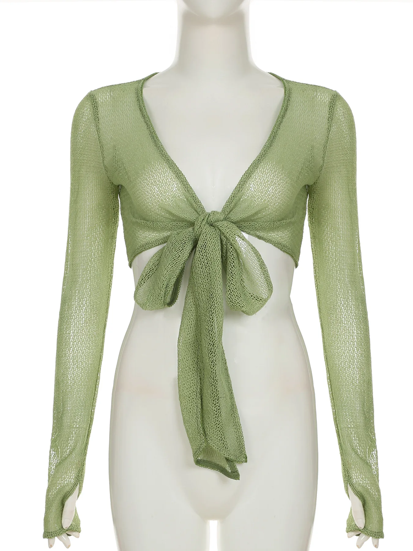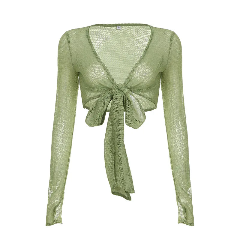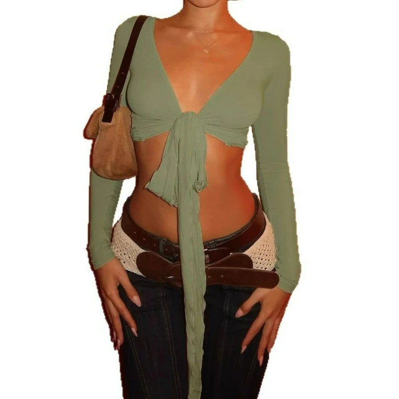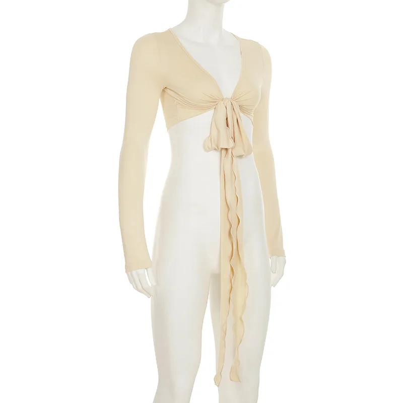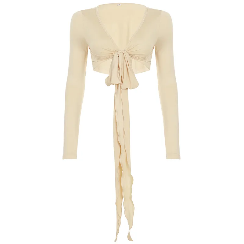 KYLETHOMASW - Ins niche design irregular deep V-knot tied long sleeved cover shirt solid color basic versatile temperament short cardigan