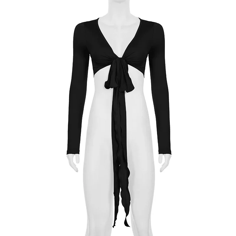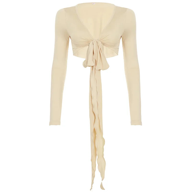 KYLETHOMASW  -  Ins niche design irregular deep V-knot tied long sleeved cover shirt solid color basic versatile temperament short cardigan