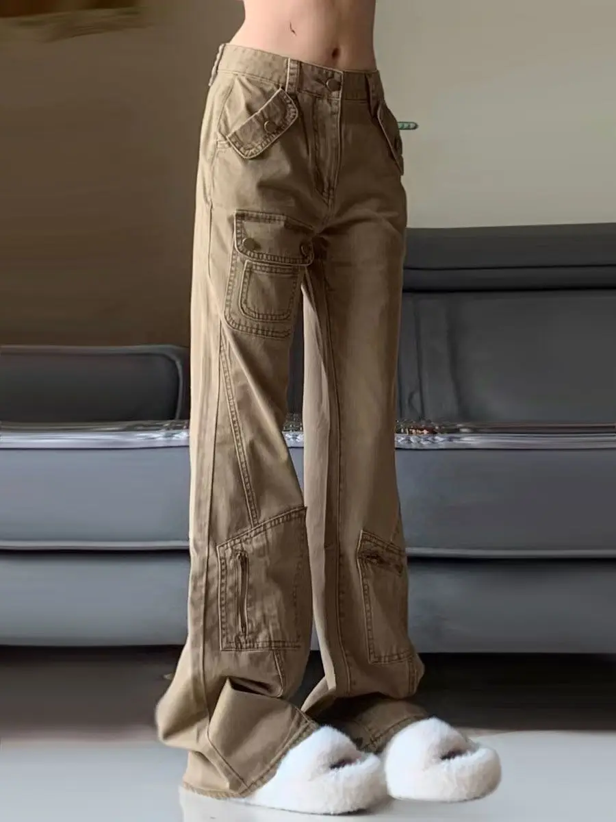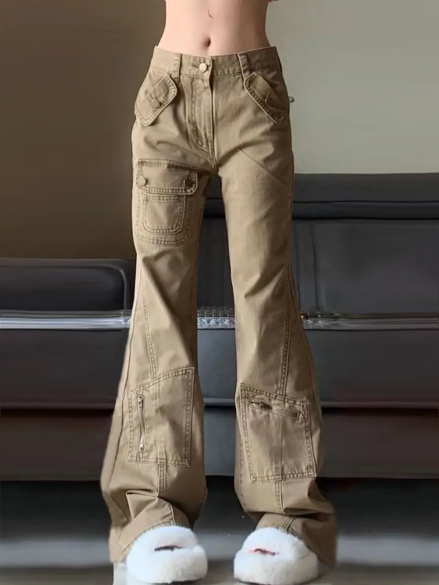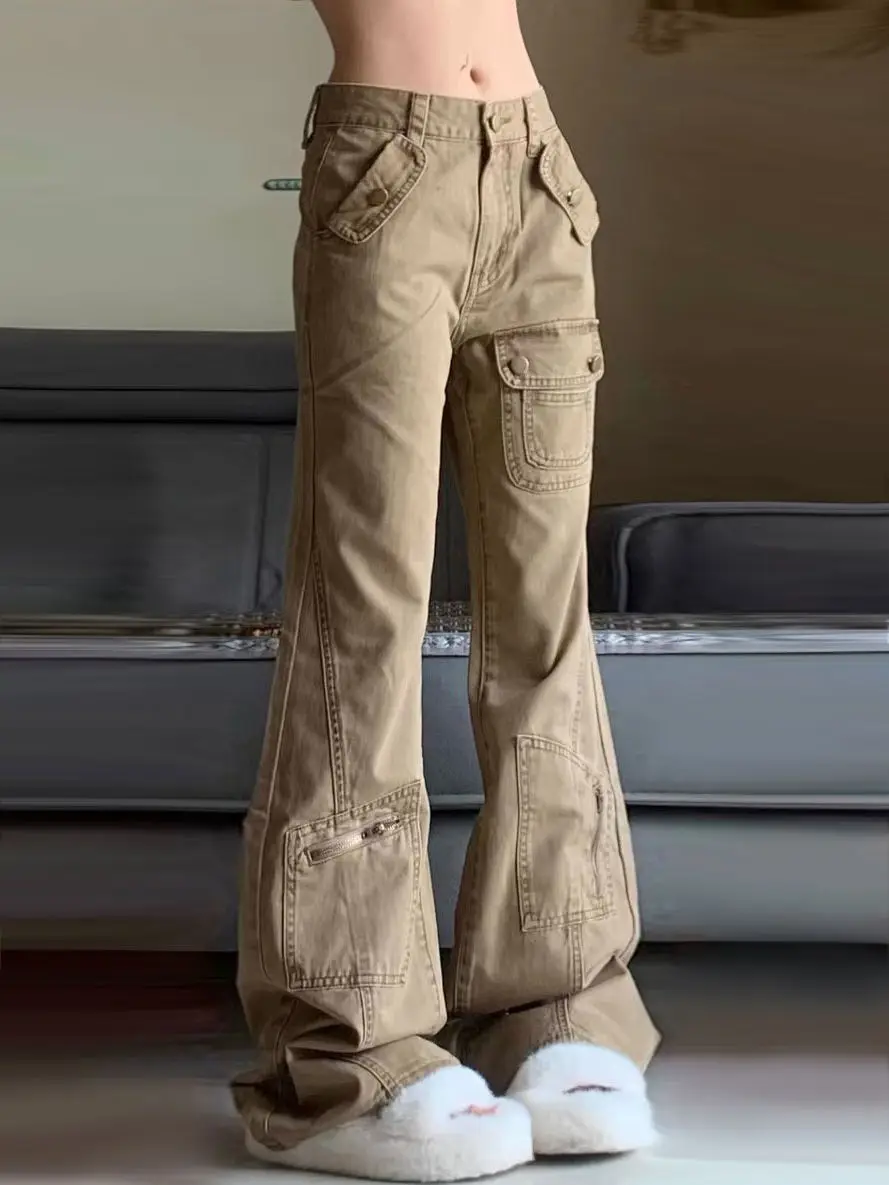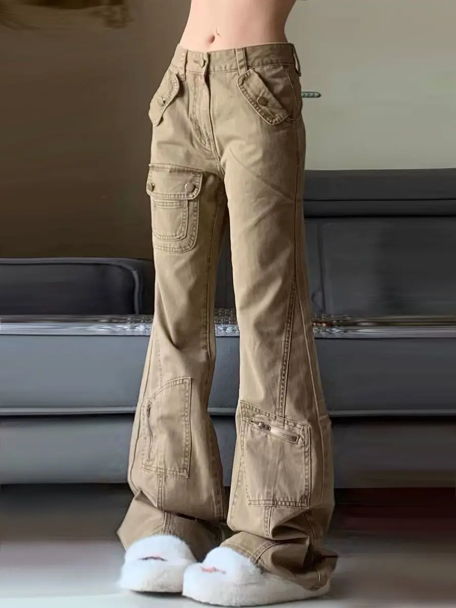 Kylethomasw Khaki Denim Cargo Pants Women Y2k Hip Hop Retro Baggy Low Waist Korean Boot Cut Jeans Harajuku Streetwear Causal Trouser