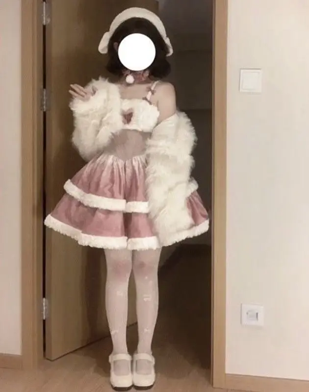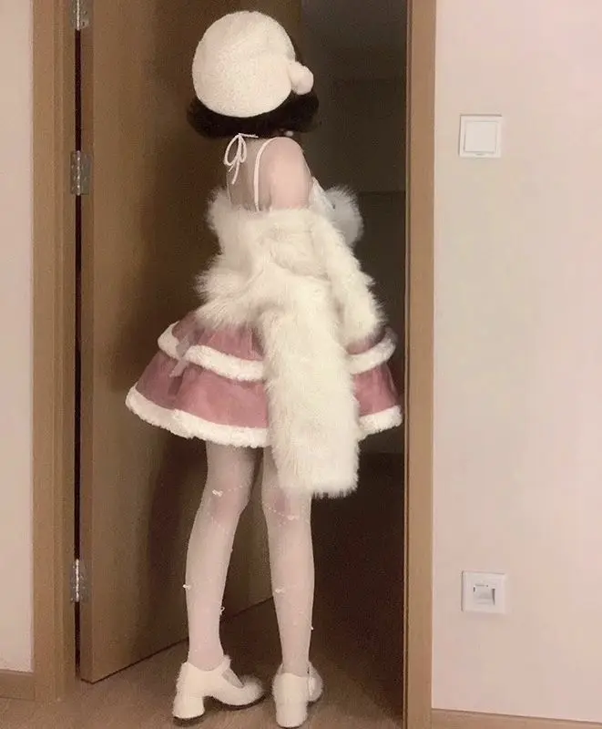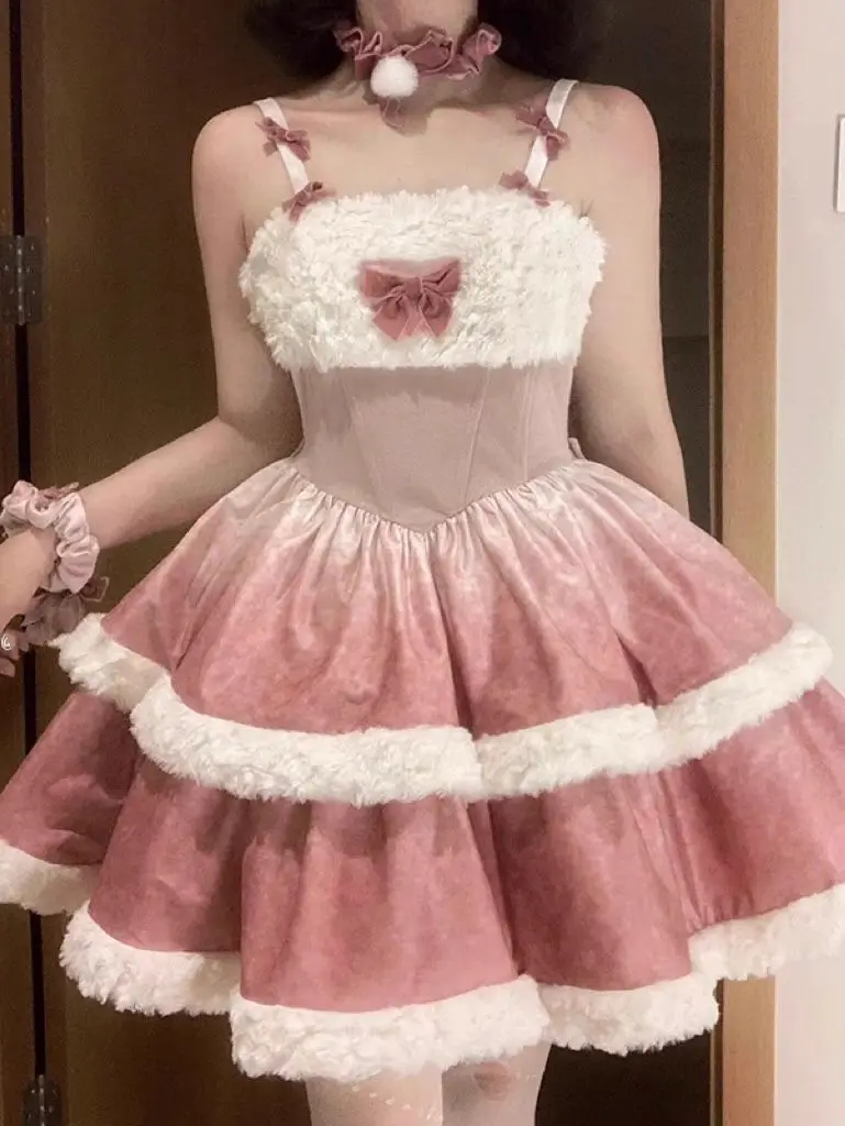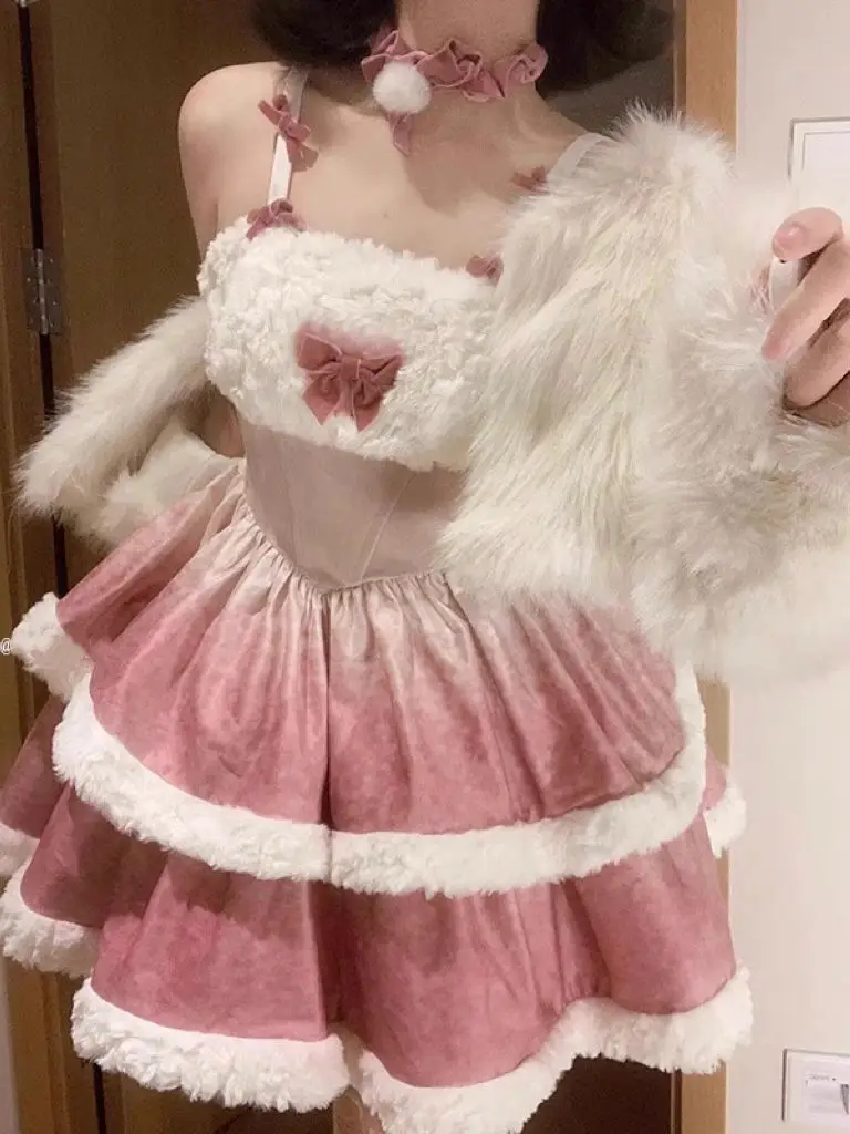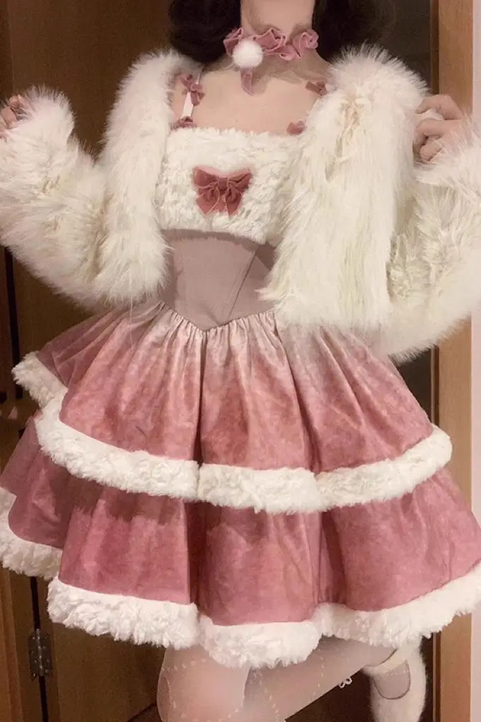 KYLETHOMASW - Plush Short Coat Waist Cinched A-line Puffy Lolita Dress Sweet Bow Gradient Mini Camisole Dress Set Two Piece Set Women Outfits