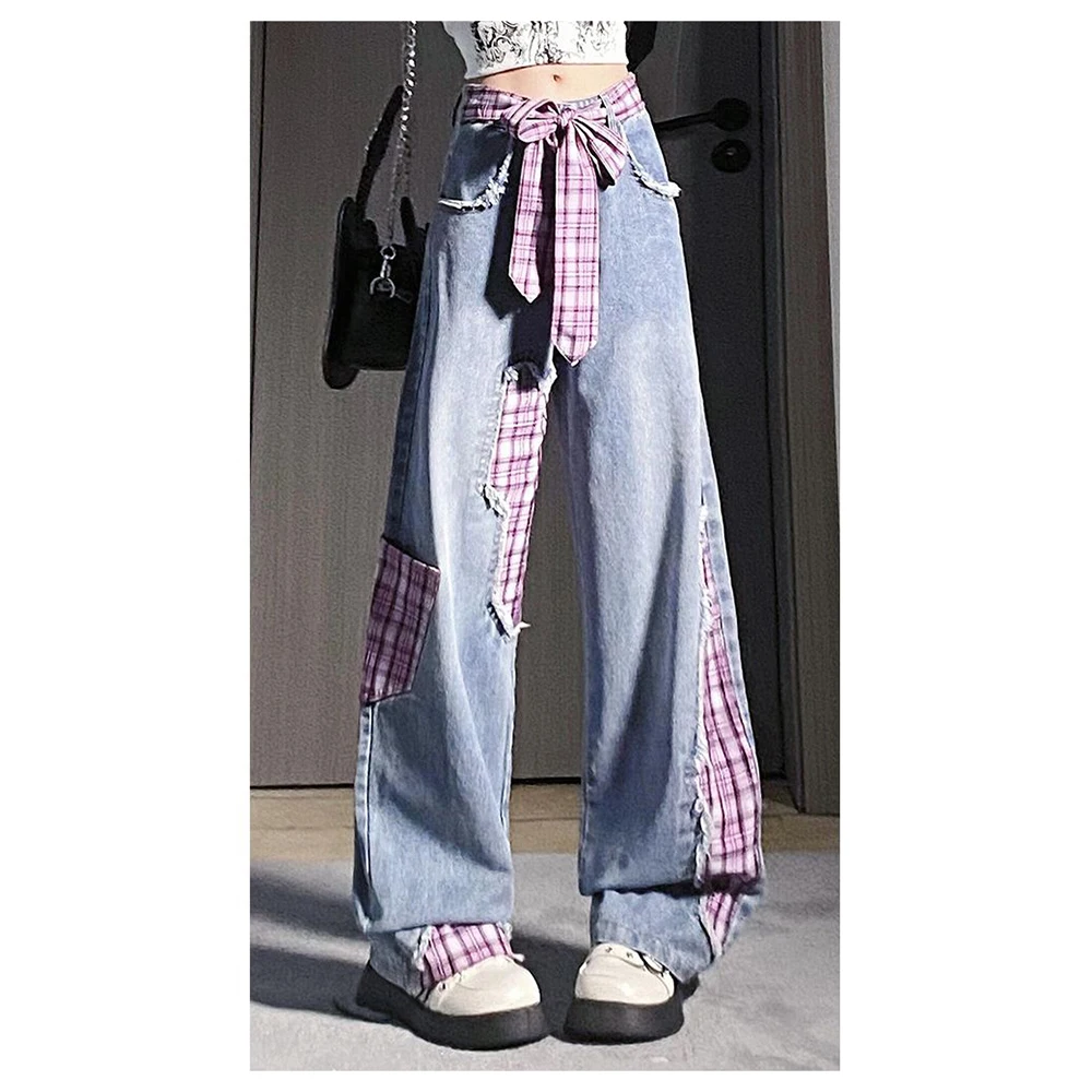 KYLETHOMASW - Retro black bow strap checkered patchwork jeans for women's autumn and winter design, niche loose wide leg pants