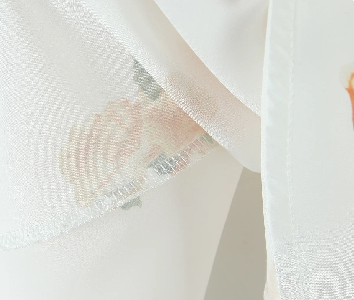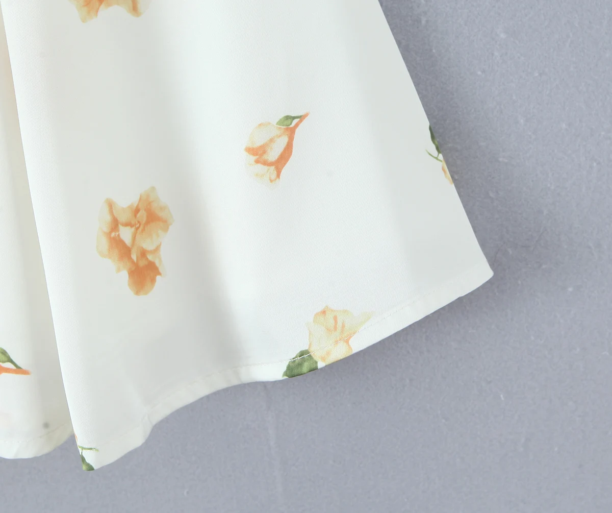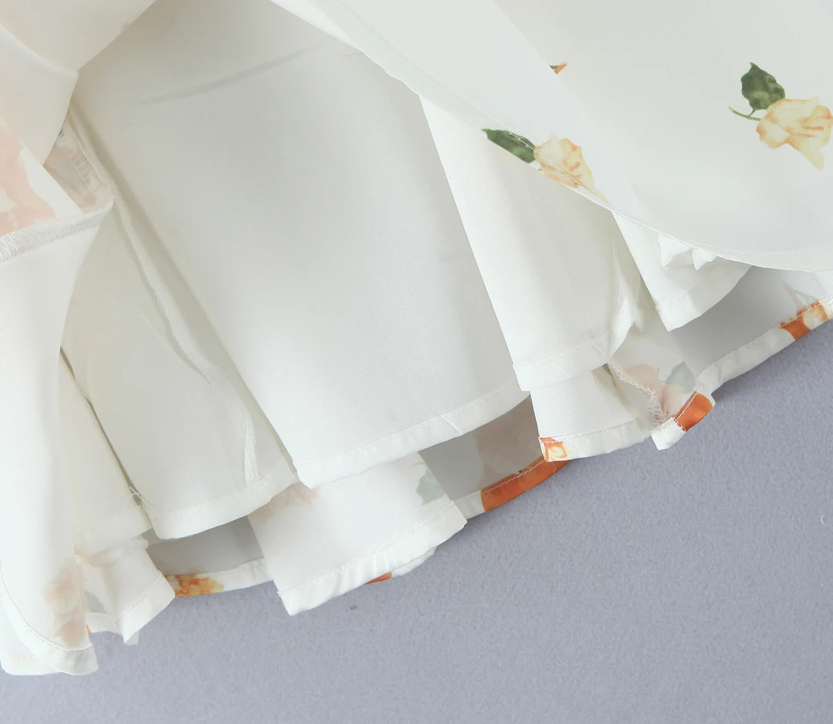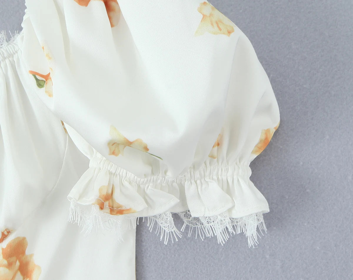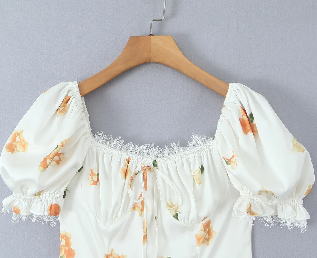 KYLETHOMASW - Retro White Flower Bow Ruched Chest Lace Slash Collar Satin Mini Dress Women Short Puff Sleeve Low Waist Swing Dresses Robe