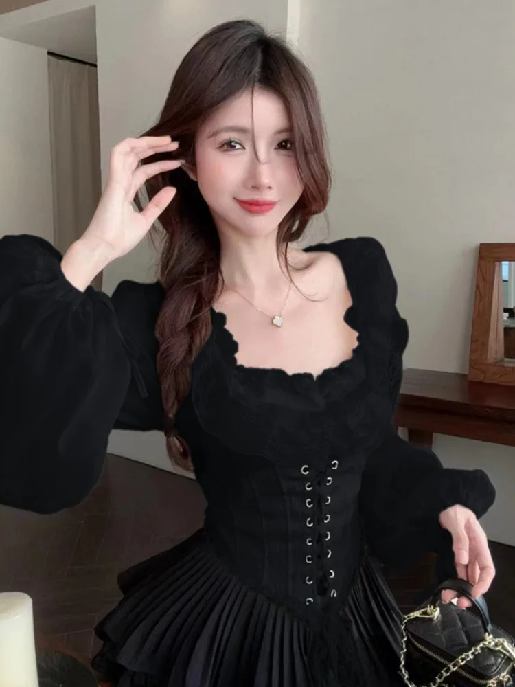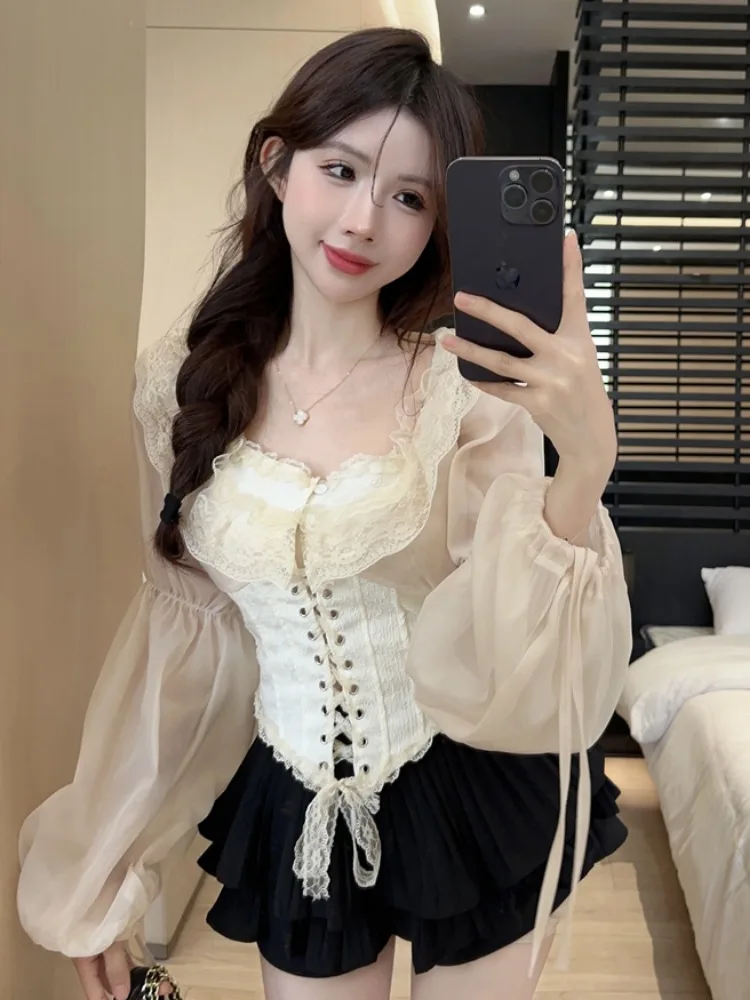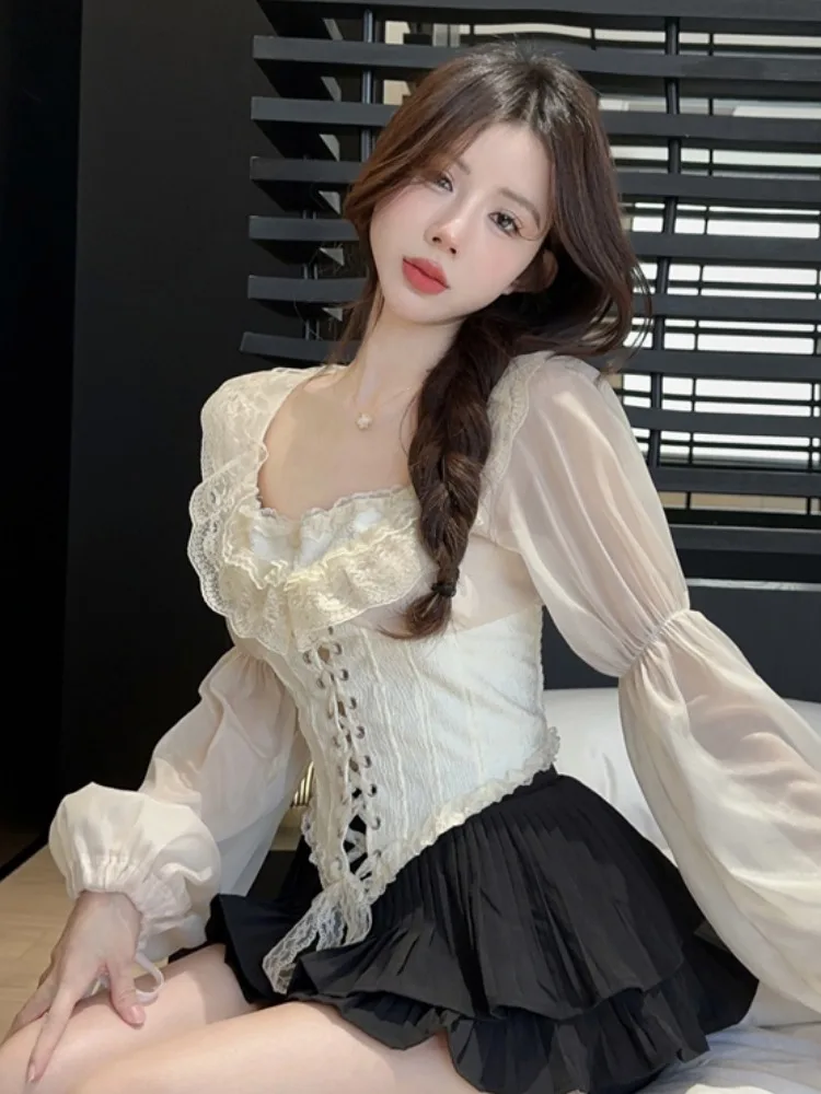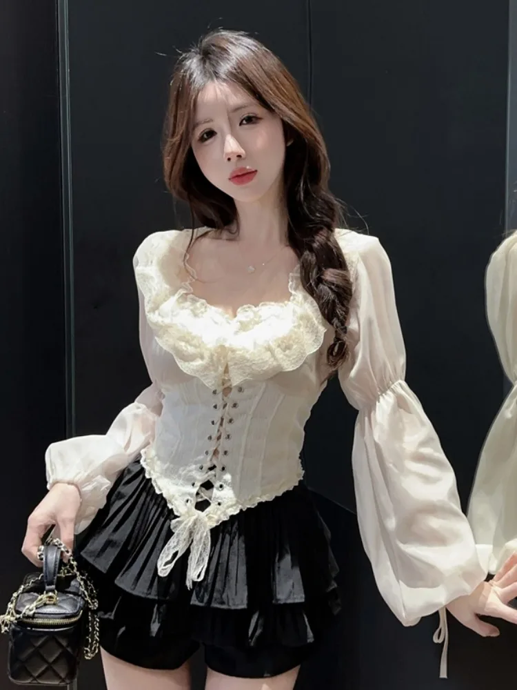 KYLETHOMASW - Sexy Shirts Women Korean Fashion Lace Shirt 2024 Spring New Lantern Sleeve Slim Waist Irregular Short Camisas De Mujer