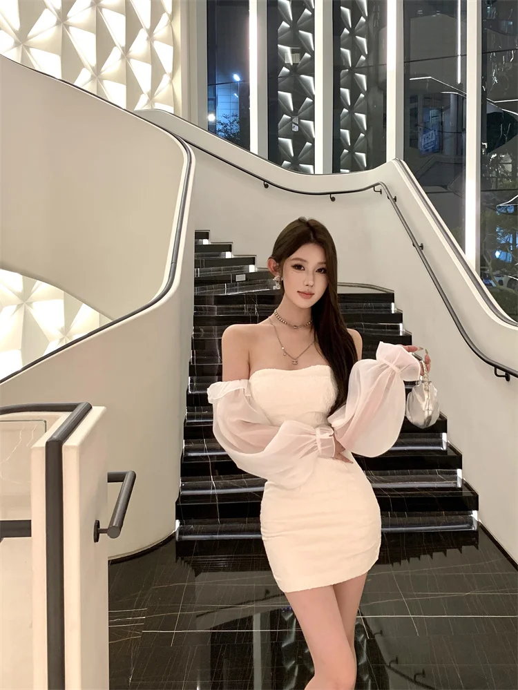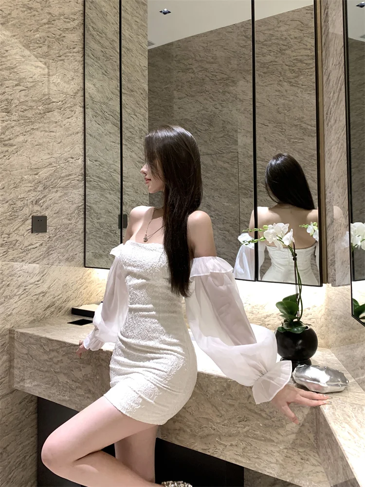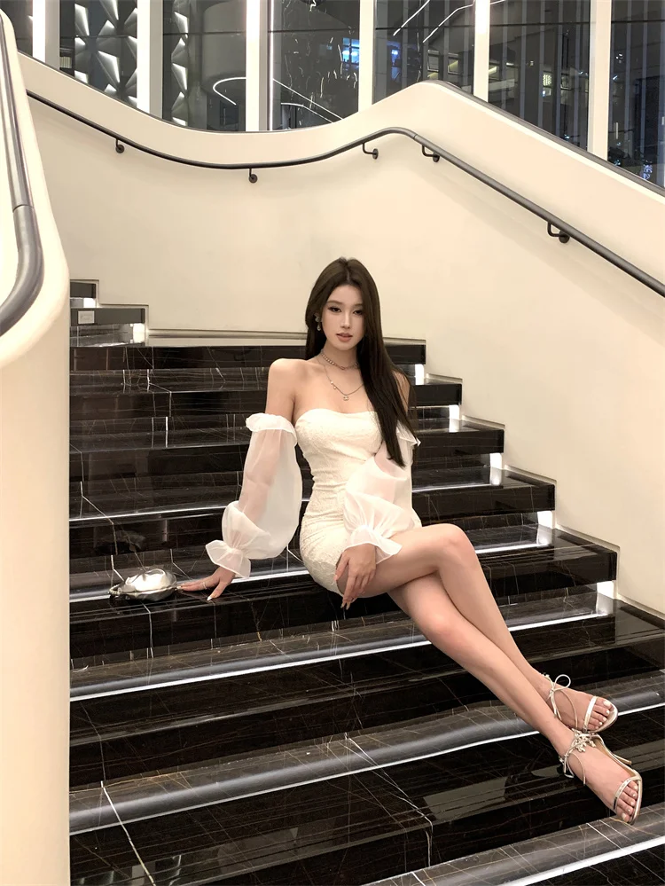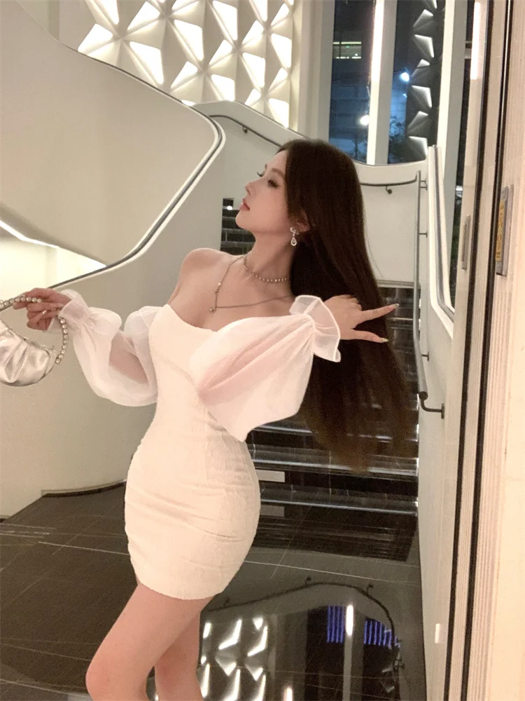 KYLETHOMASW - Sexy Short Shoulder One-Piece Dress Women Slim High Waist Long Sleeve Lantern Sleeve Street Style Pure Color Embroidered Dress
