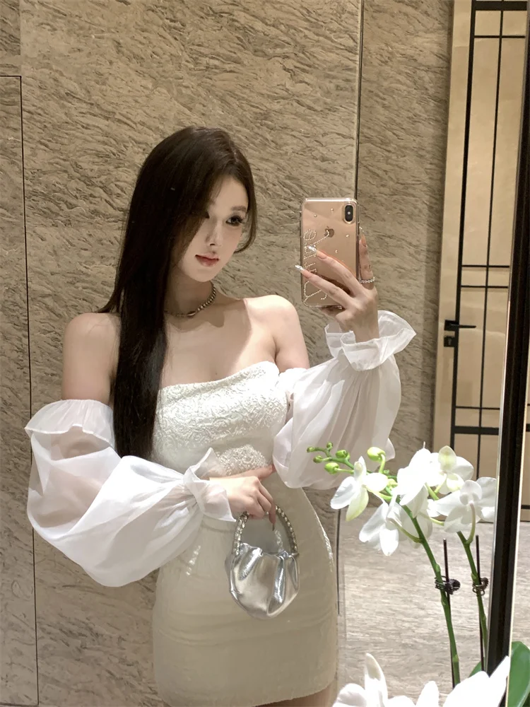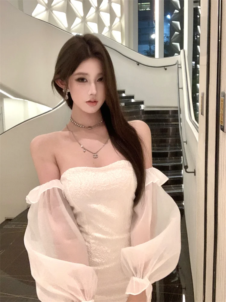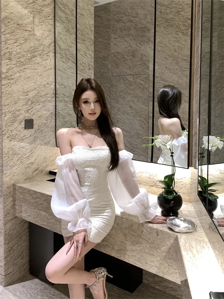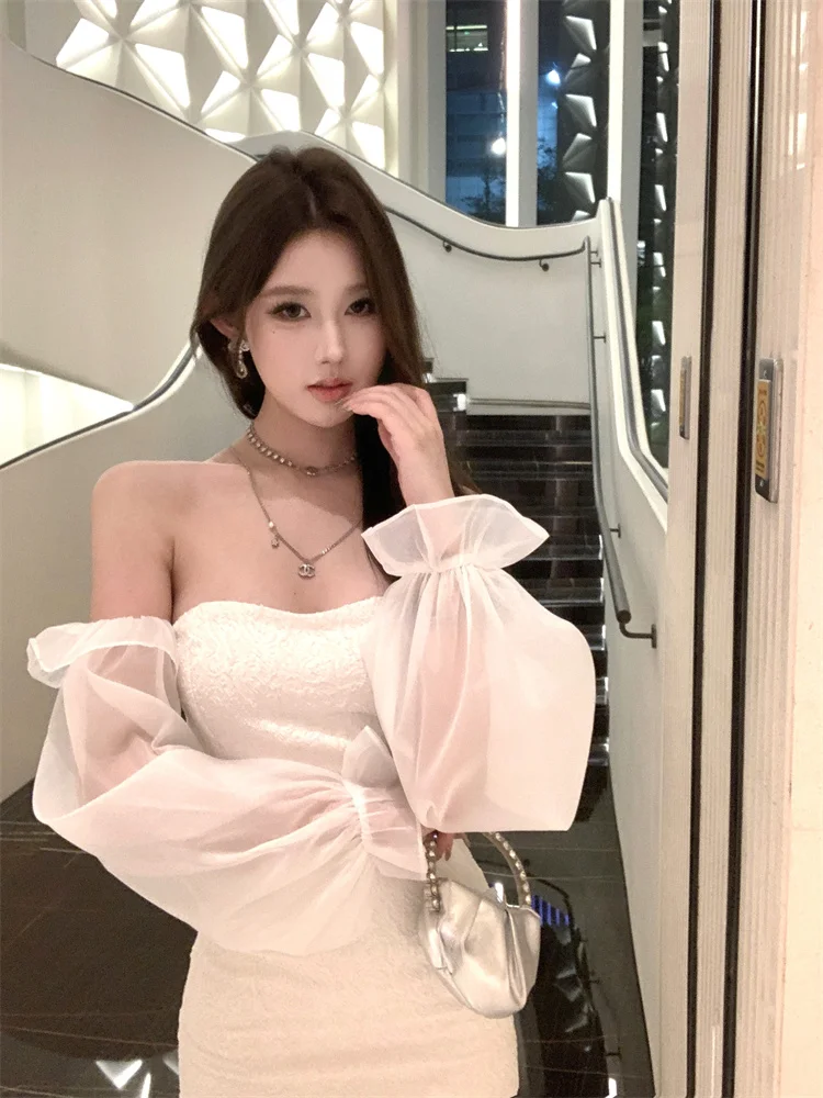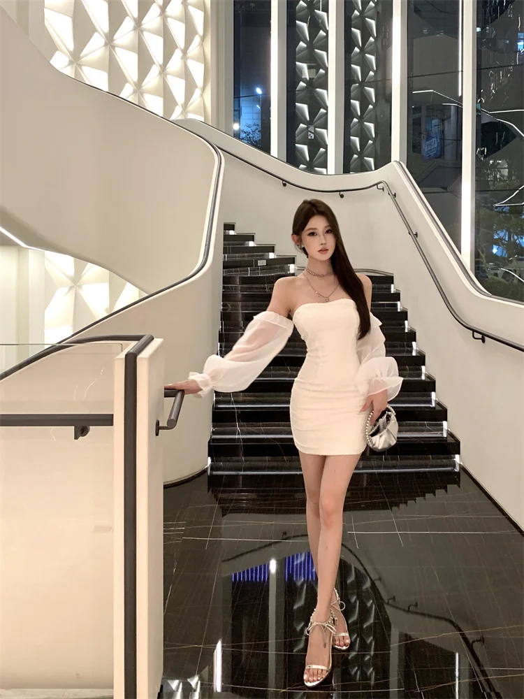 KYLETHOMASW - Sexy Short Shoulder One-Piece Dress Women Slim High Waist Long Sleeve Lantern Sleeve Street Style Pure Color Embroidered Dress