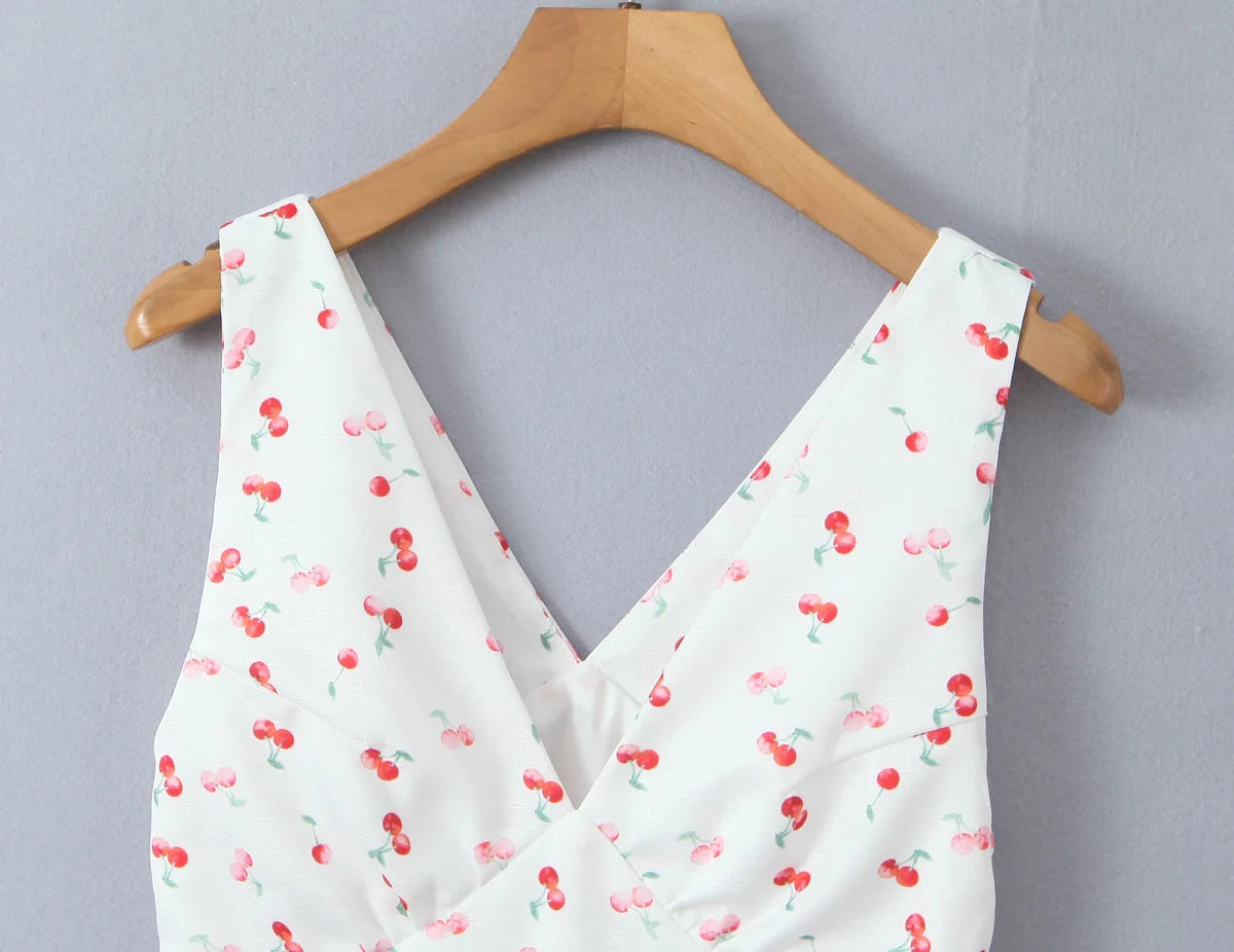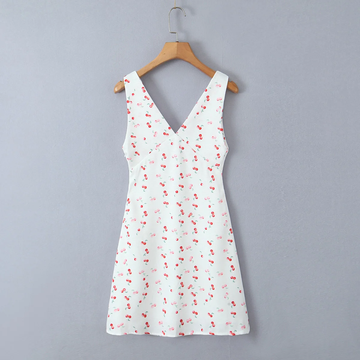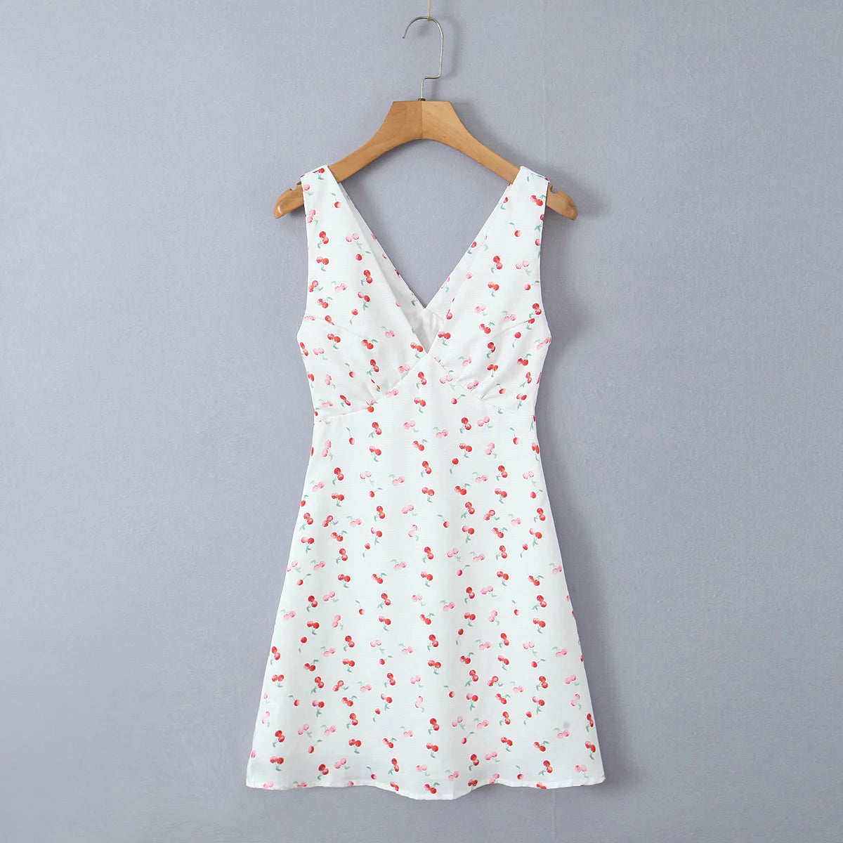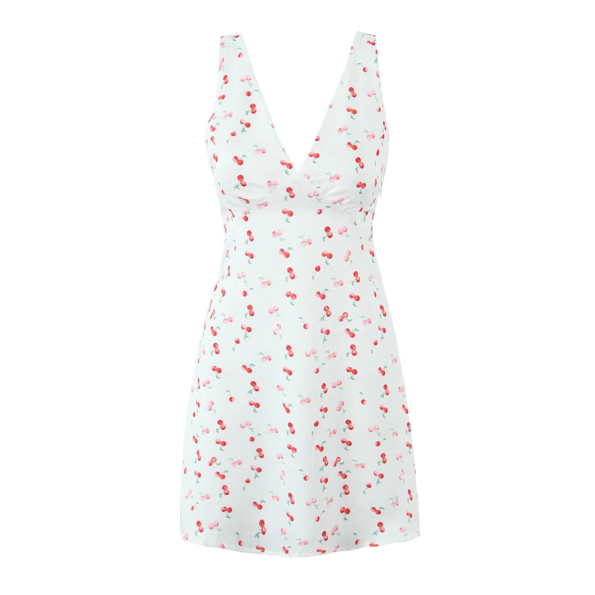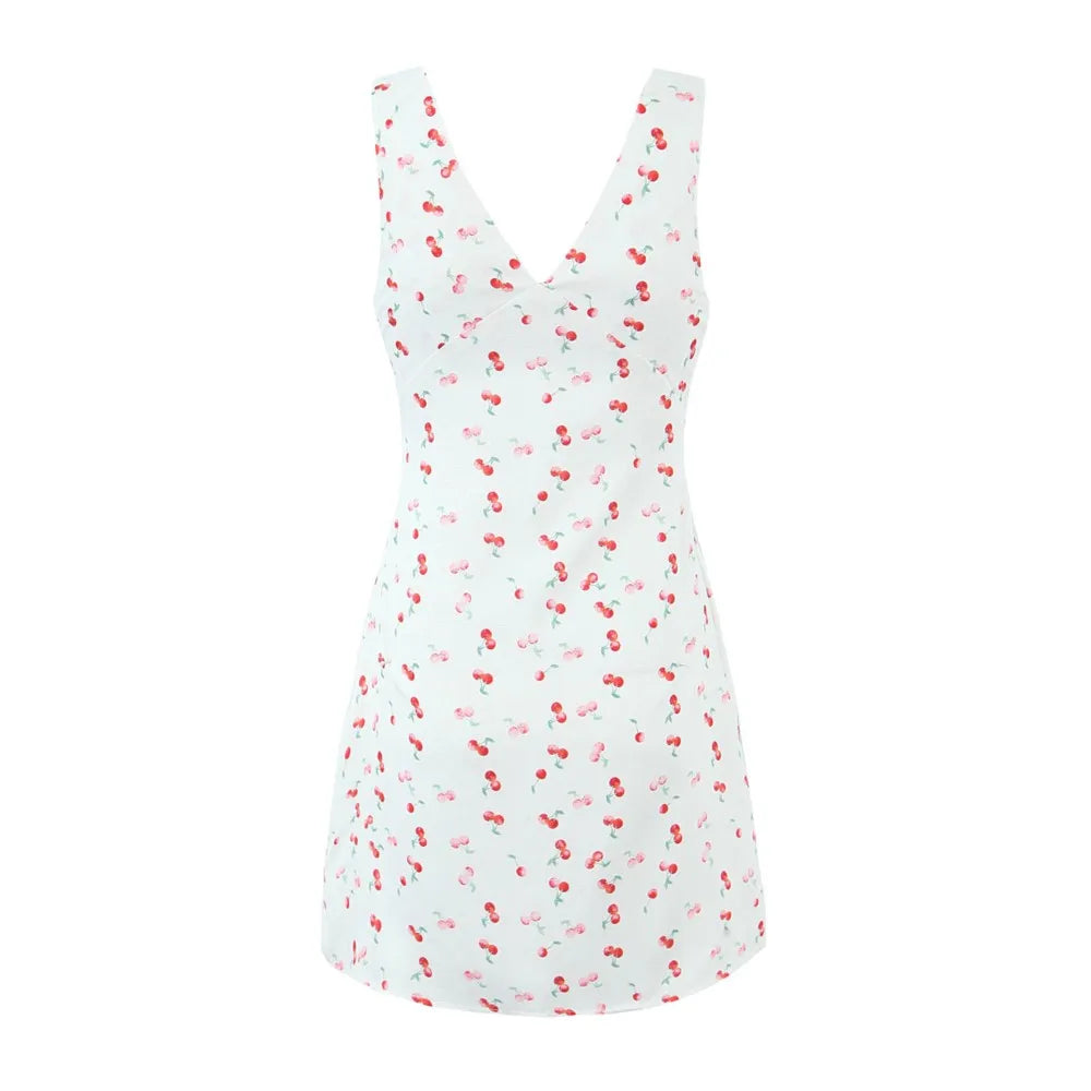 KYLETHOMASW - Sexy White With Red Cherry Print V neck Mini Tank Dress Women Slim Waist A-Lined Sleeveless Short Robe Holiday