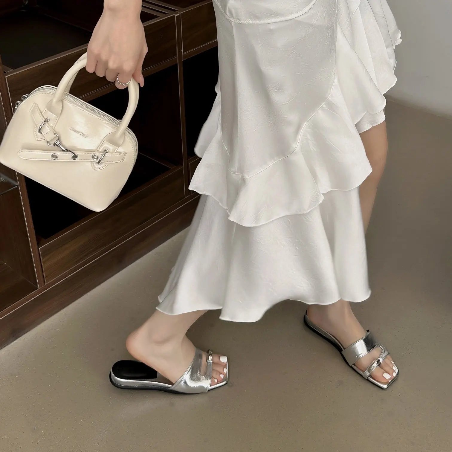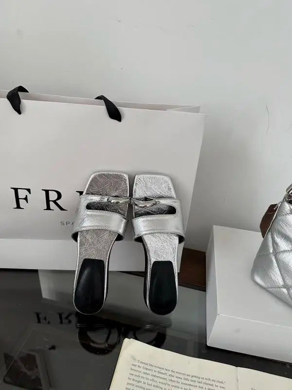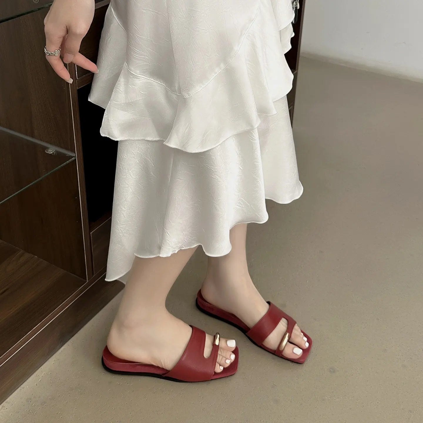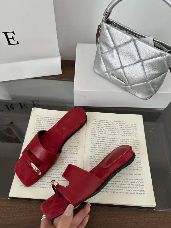 KYLETHOMASW - Shoes Woman 2025 Slippers Summer Square Toe Luxury Slides Rivet Pantofle Flat Designer New Rivet Shoes Slippers Women Summer Pan