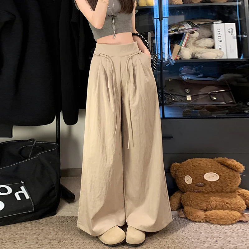 KYLETHOMASW - Summer High Waist Wide Leg Pants Women Clothing Japan Style Fashion Elastic Waist Bandage Baggy Black Khaki Long Pants