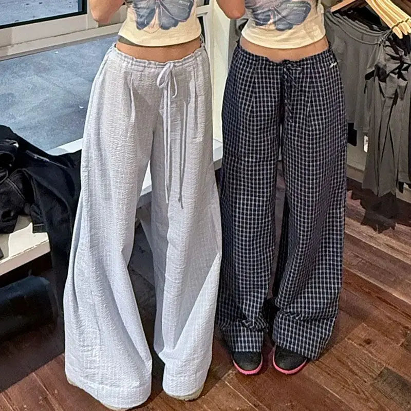KYLETHOMASW - Summer Hot Retro American Lazy Style Straight Tube Loose Mid Low Waist Drawstring Plaid Casual Pants Women