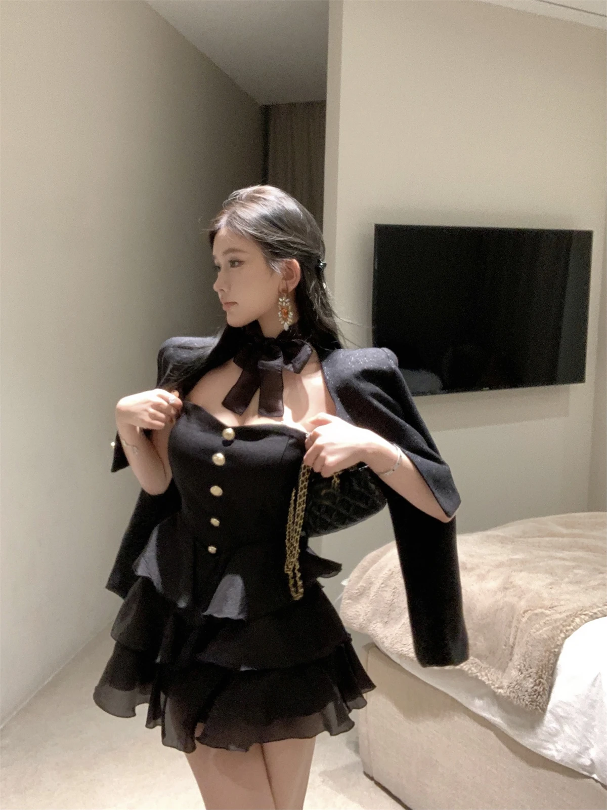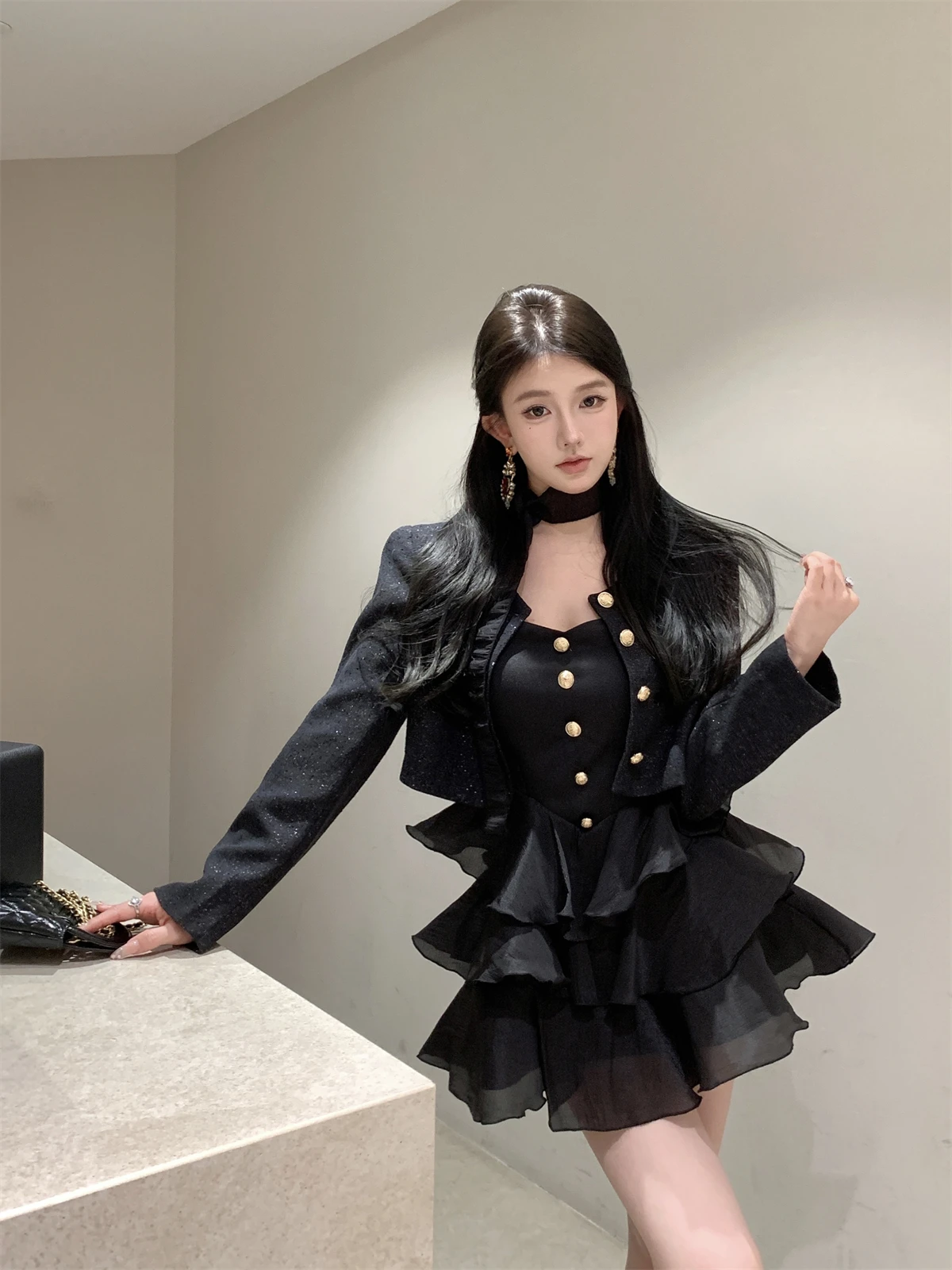 KYLETHOMASW - Sweet Hot Girl Sexy Suit Women's Autumn Winter Gold Buckle Short Coat Lace-up Slim A-line Dress Two-piece Set Female Clothes