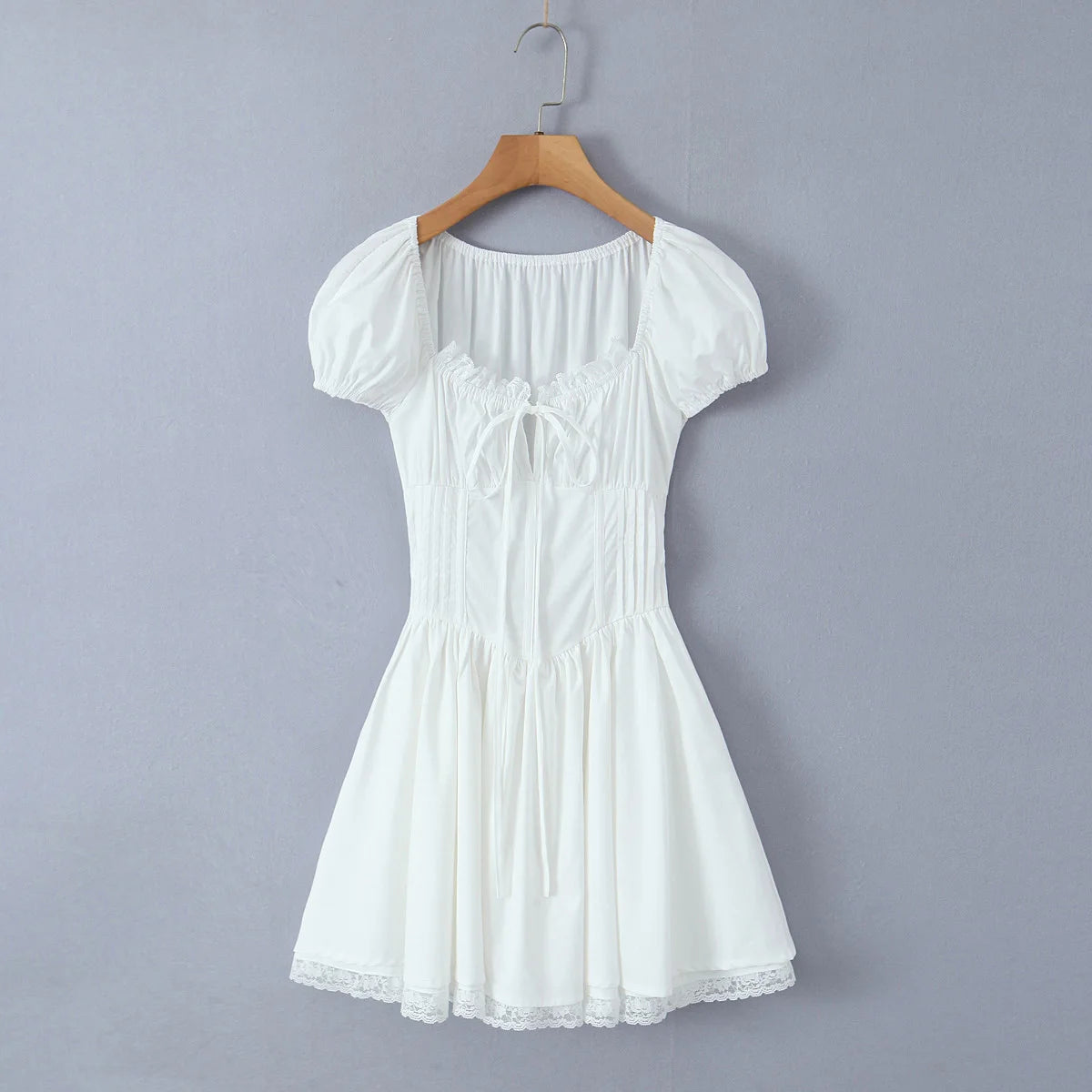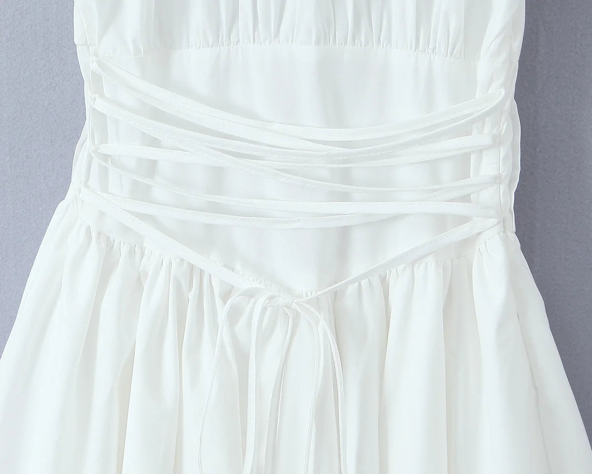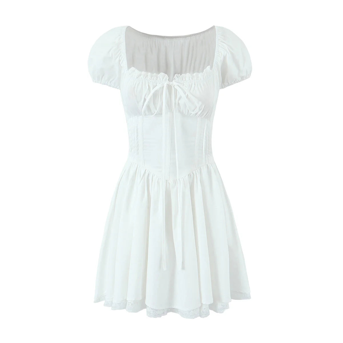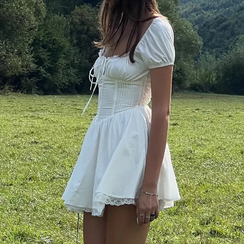 KYLETHOMASW - Sweet Women Ruched Chest Fish bow Waist Corset Style Dress Short Sleeve Cross Bandage Lacing up Back Bodycon Mini Party Robe