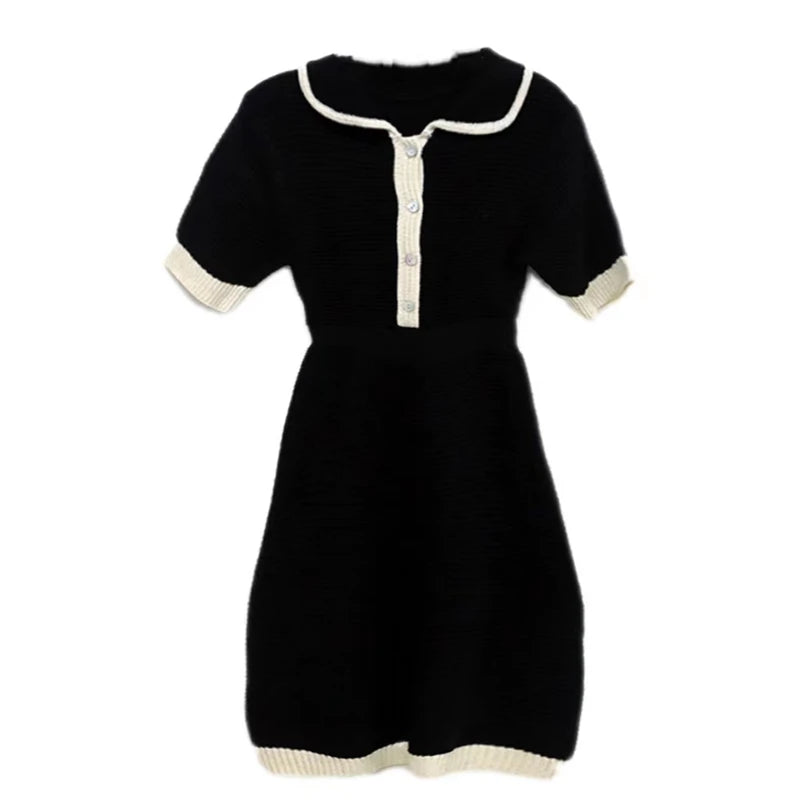KYLETHOMASW - Turn Down Collar Knitted Dress Women Short Sleeve Mini Dress High Waist Dresses Korean Elegant Office Lady Bodycon Vestidos N324