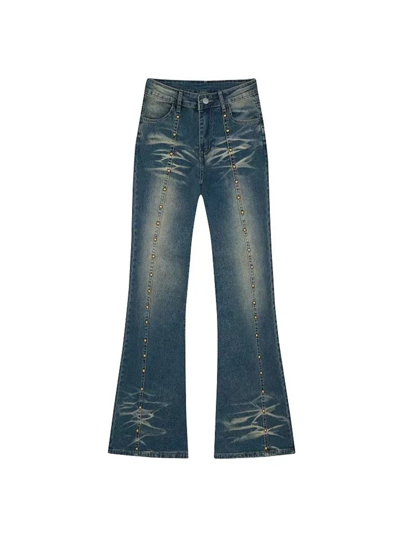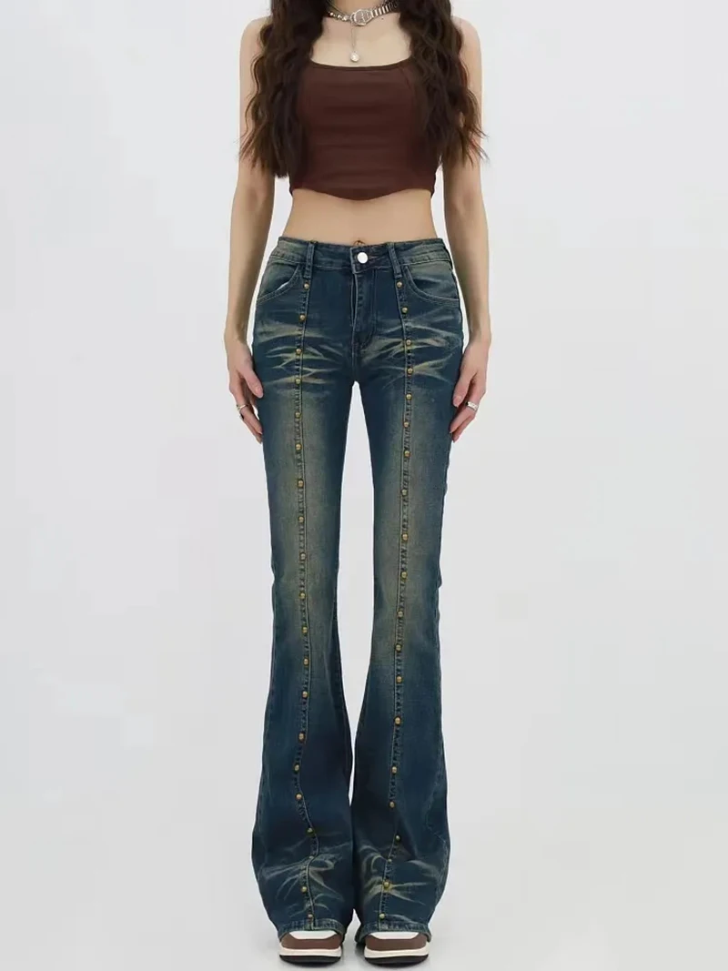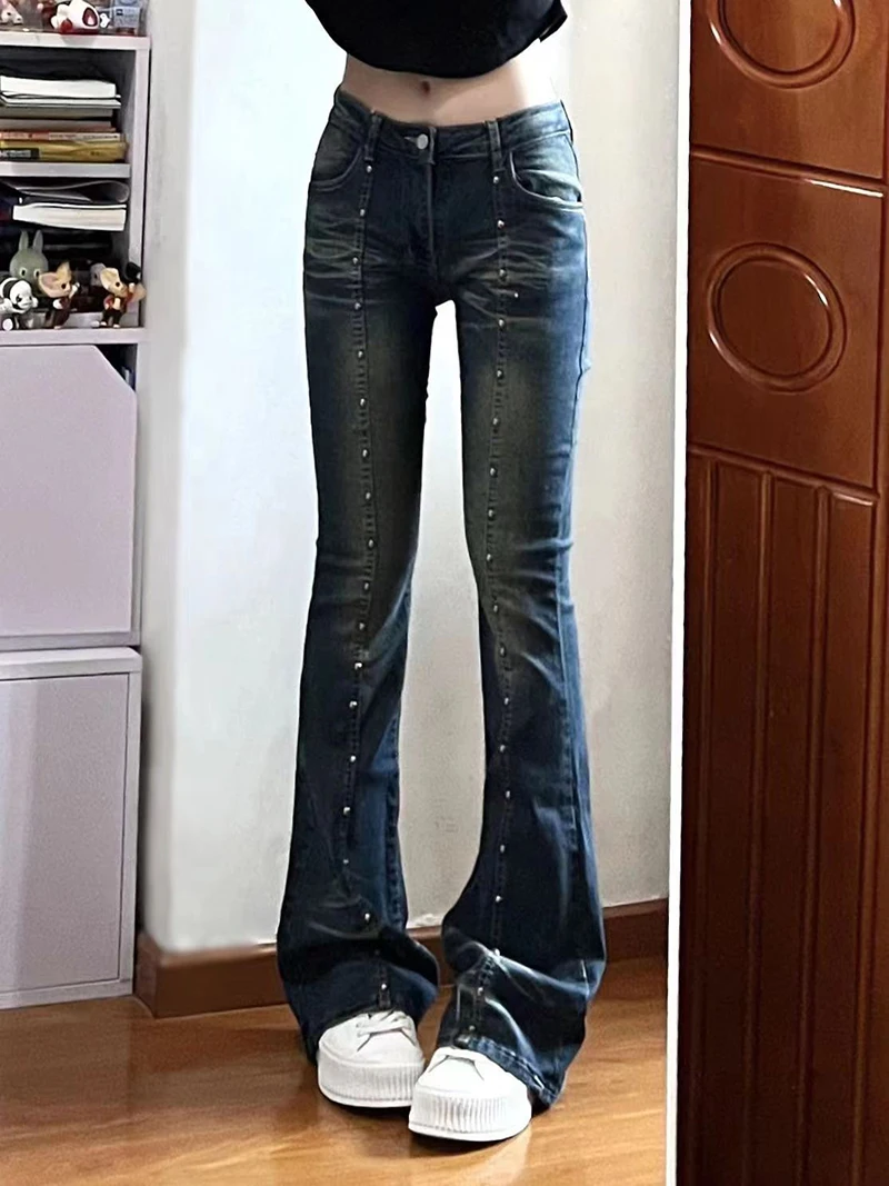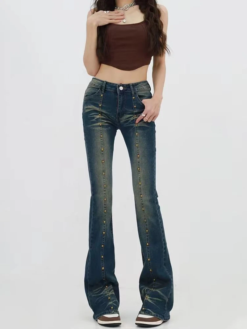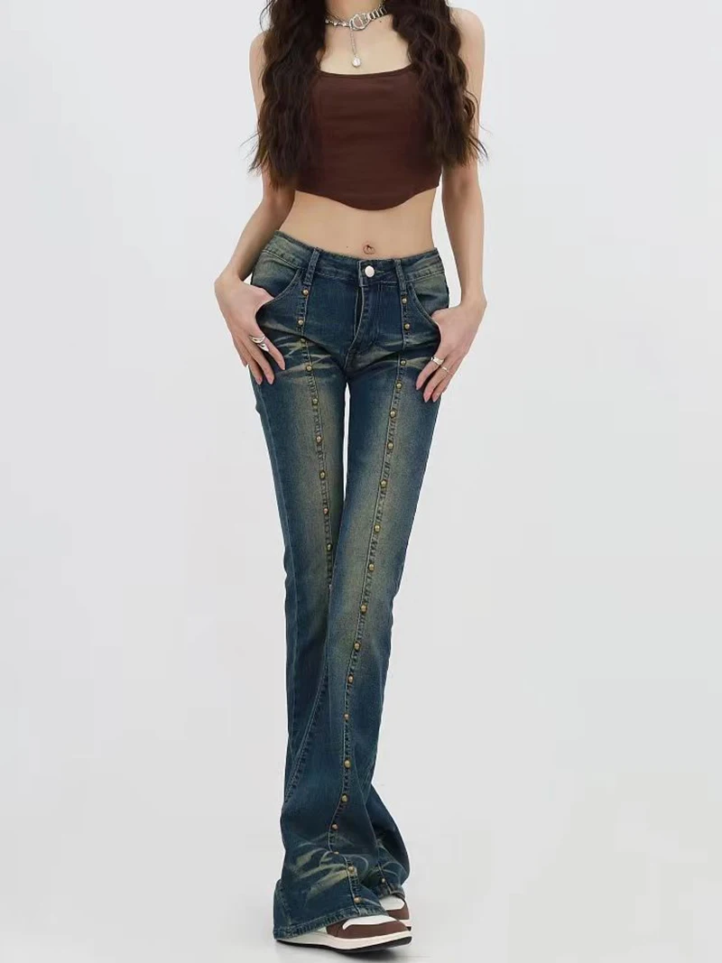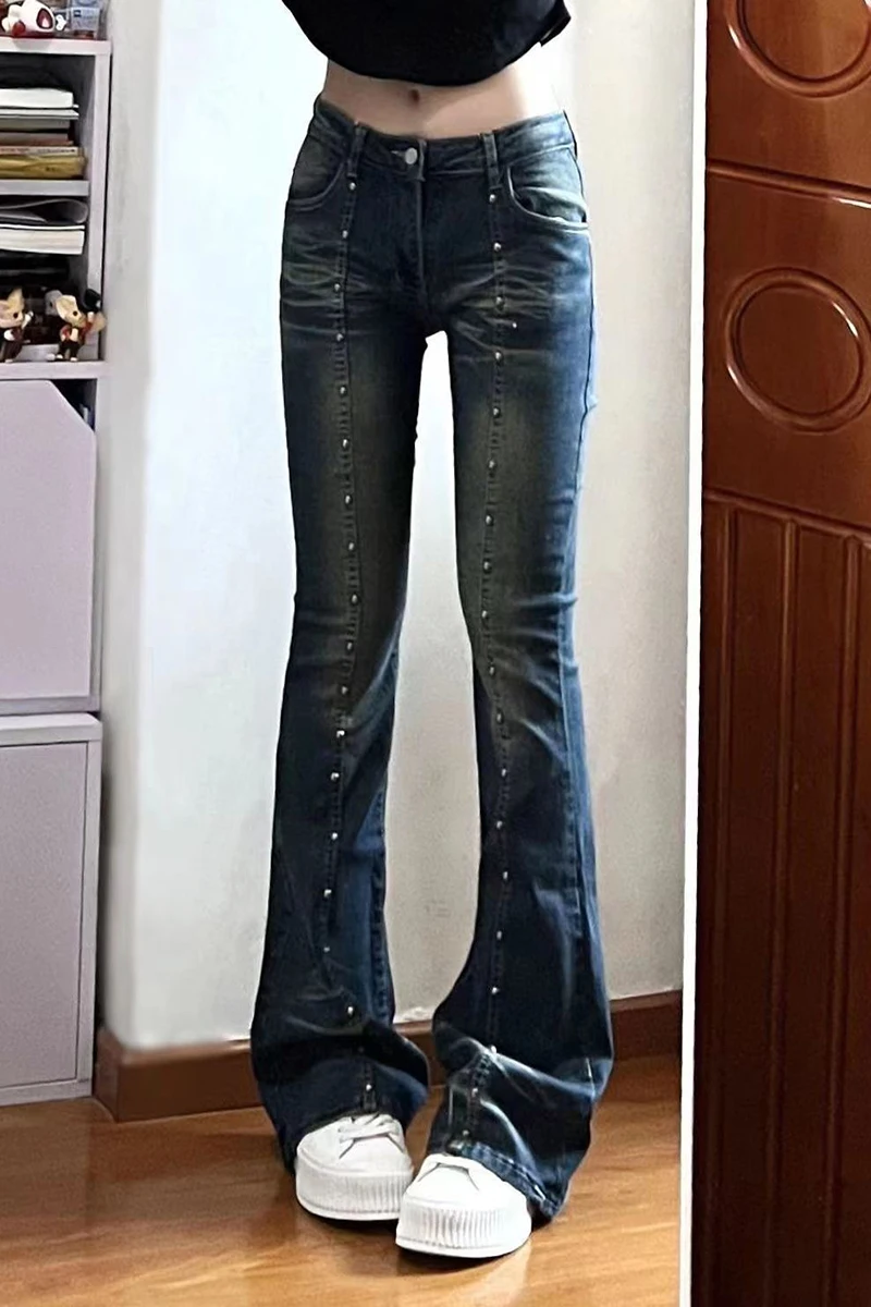 KYLETHOMASW - Vintage Americana Low Rise Flared Jeans Rivet Studs Distressed Washed Denim Pants Bootcut Slim Y2K Harajuku Street Denim Pants
