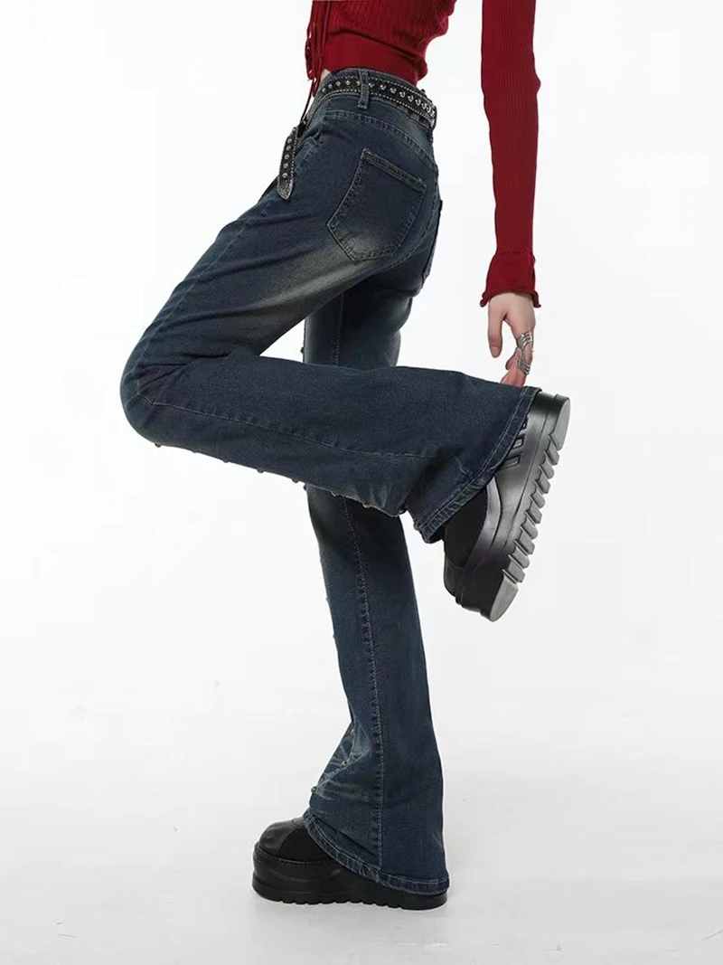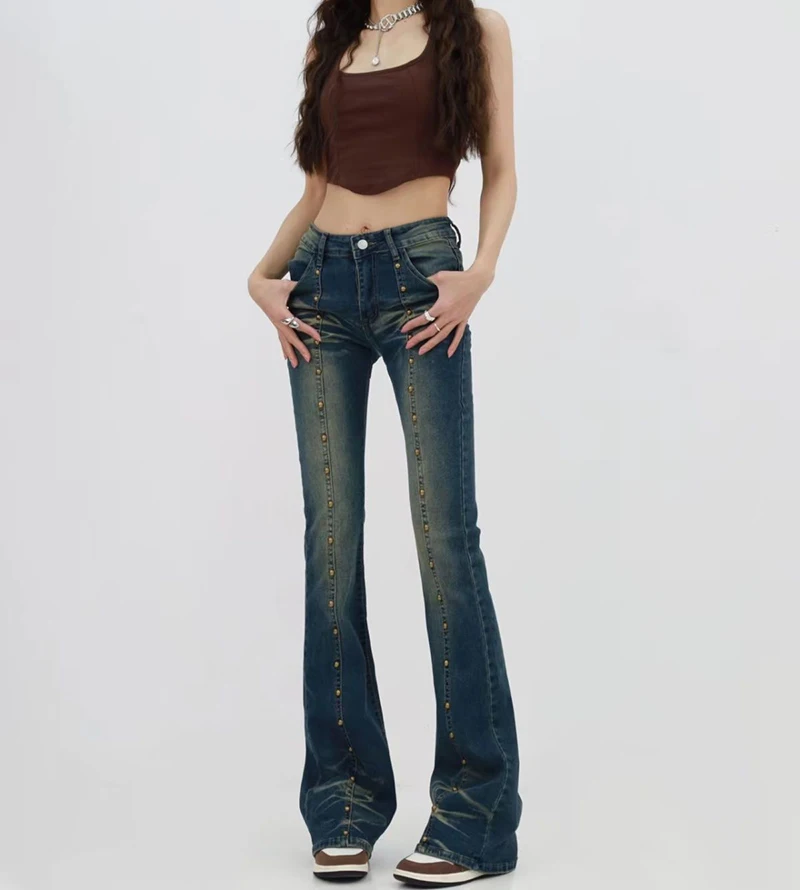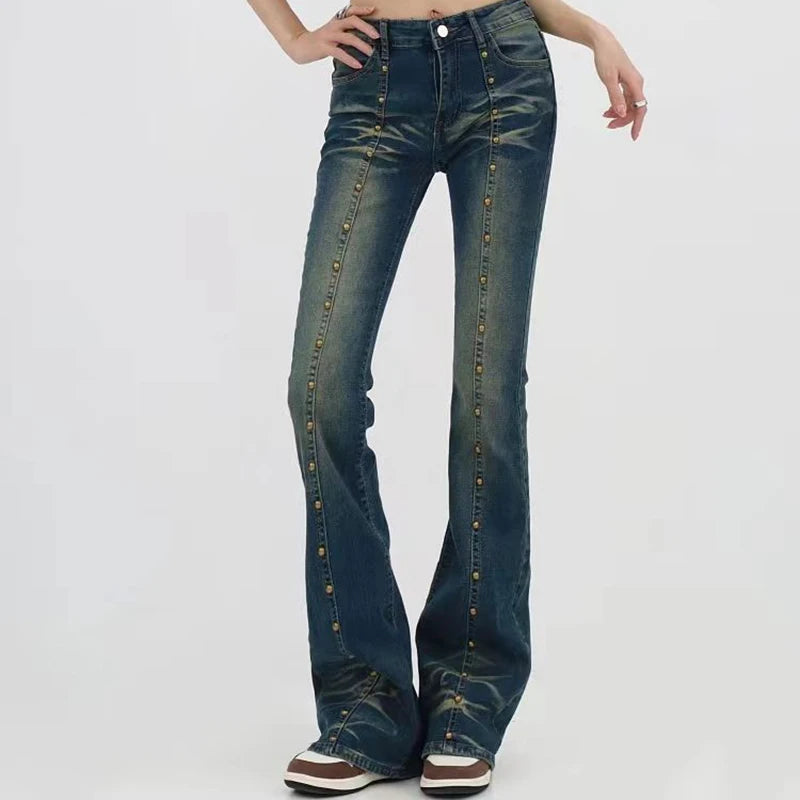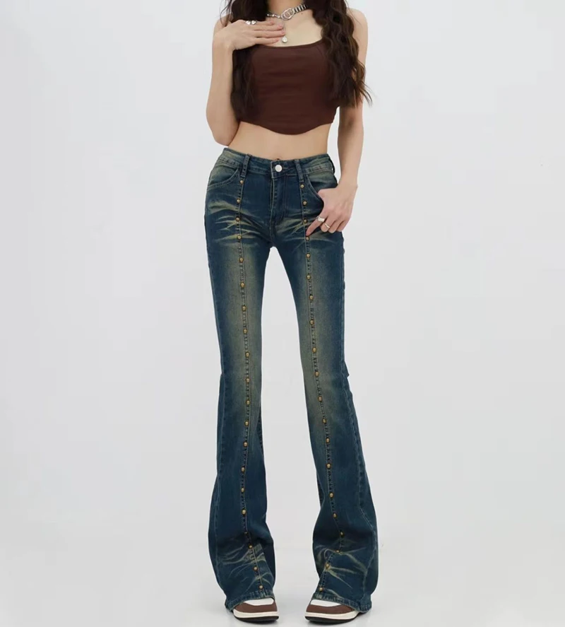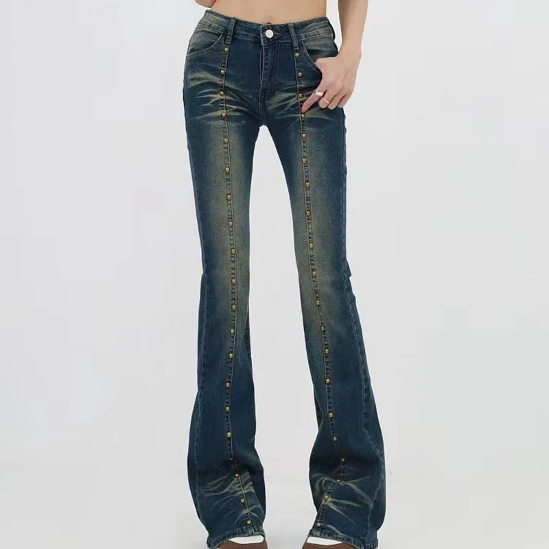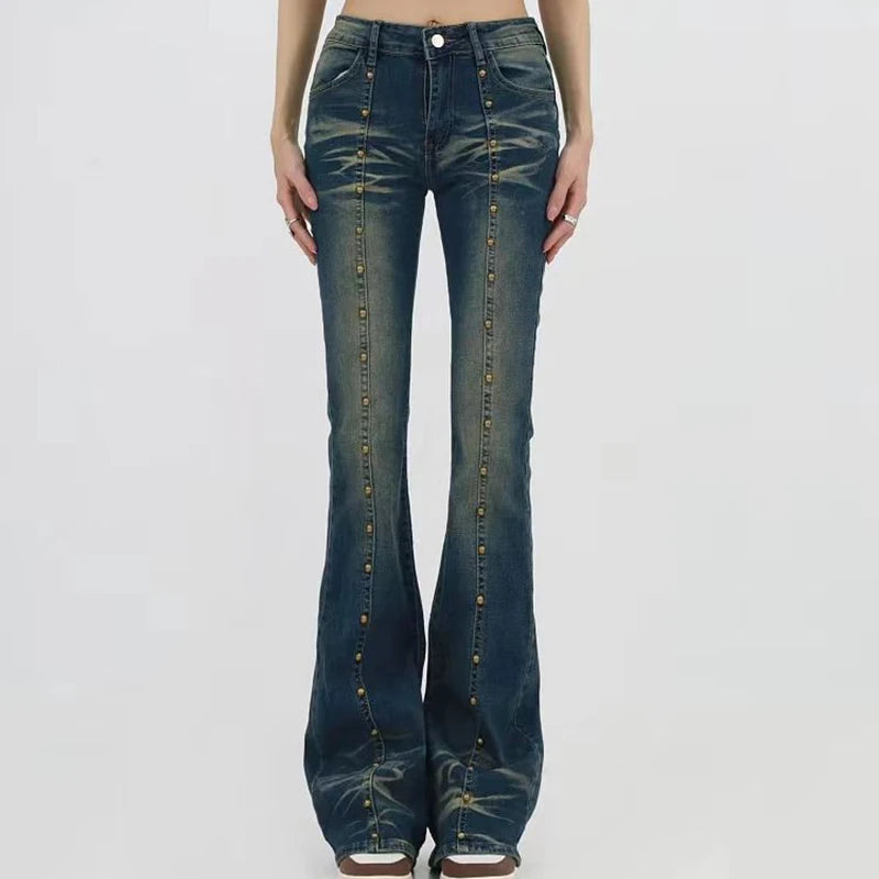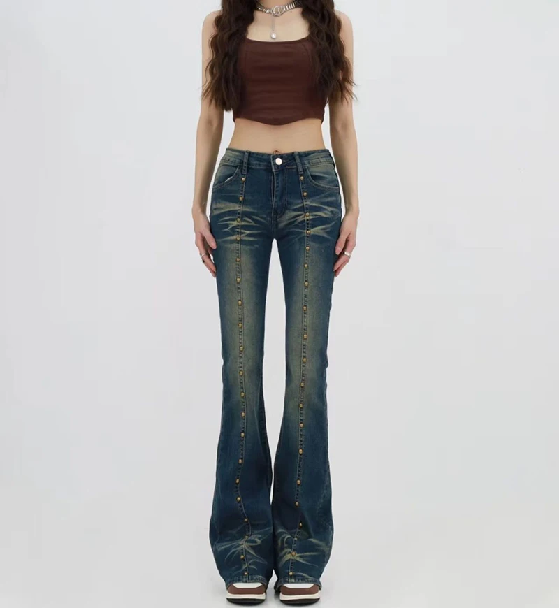 KYLETHOMASW - Vintage Americana Low Rise Flared Jeans Rivet Studs Distressed Washed Denim Pants Bootcut Slim Y2K Harajuku Street Denim Pants