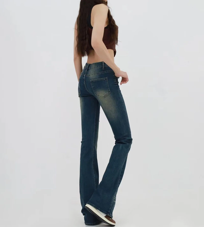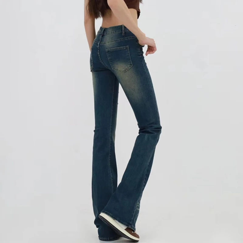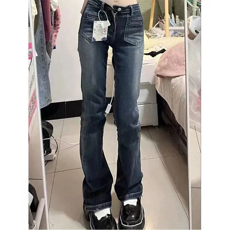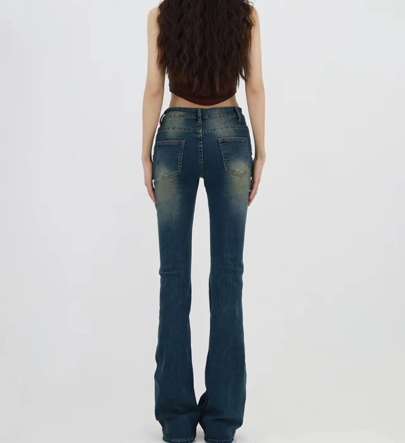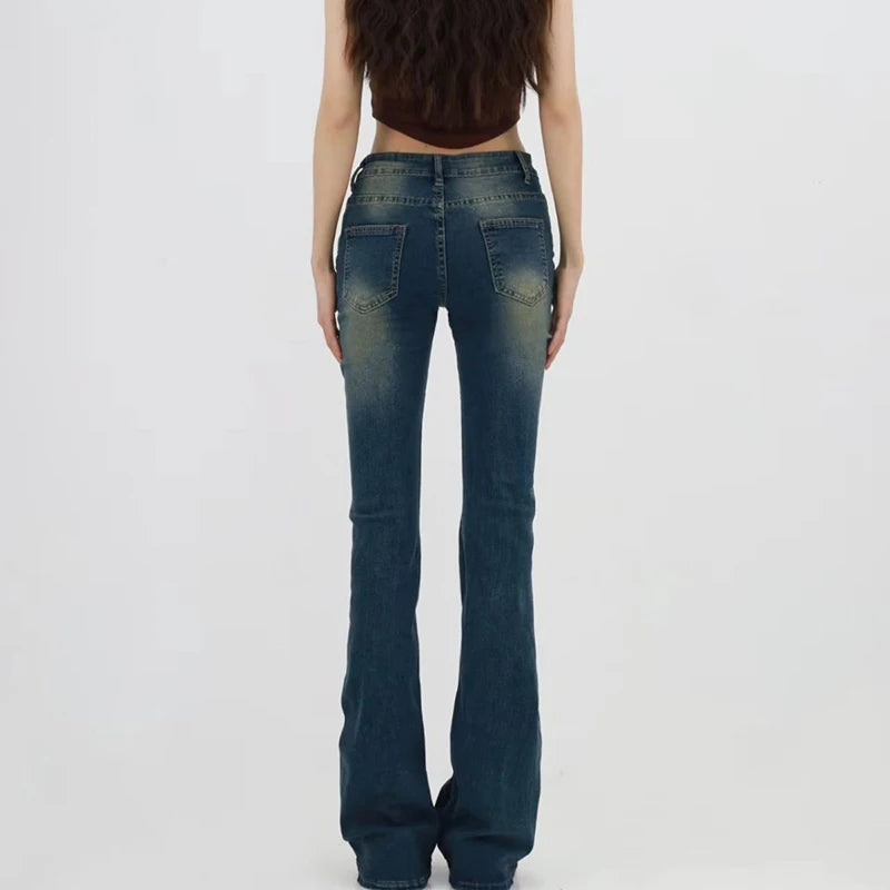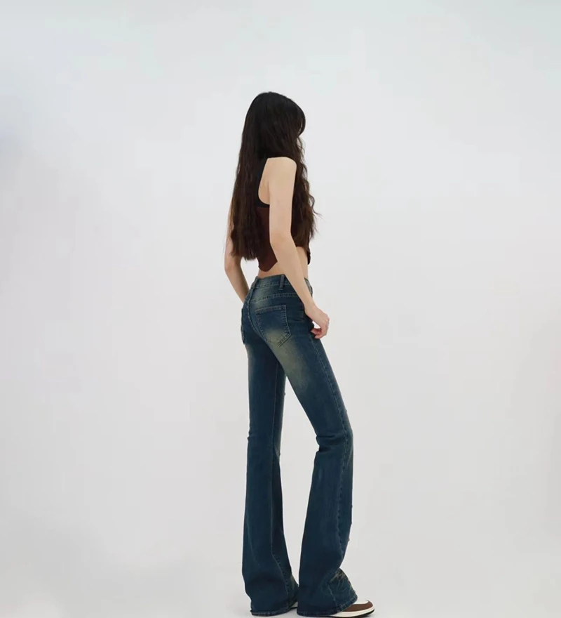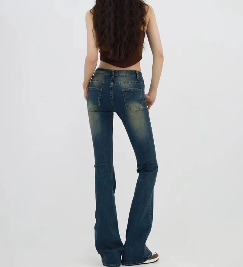 KYLETHOMASW - Vintage Americana Low Rise Flared Jeans Rivet Studs Distressed Washed Denim Pants Bootcut Slim Y2K Harajuku Street Denim Pants