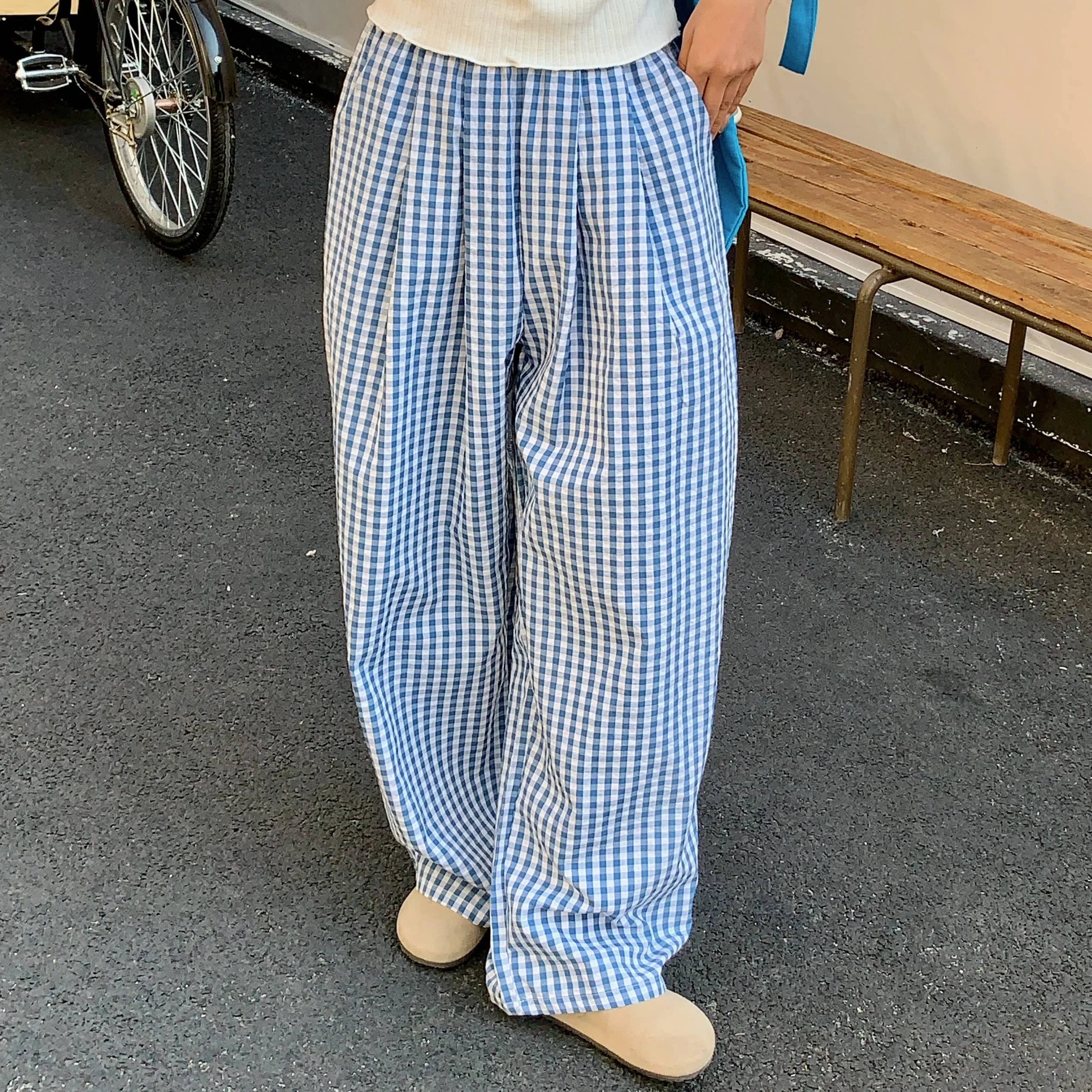 KYLETHOMASW - Vintage Plaid Women's Wide Leg Pants Pockets Sping Summer High Waist Casual Straight Loose Trousers Female