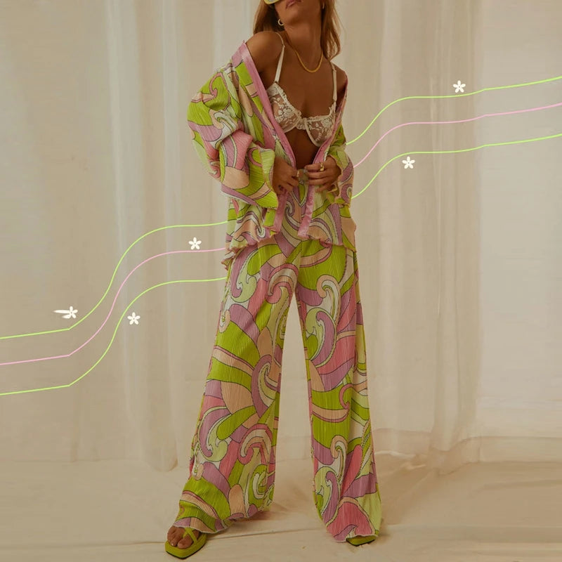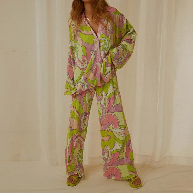 KYLETHOMASW - Y2K Graphic Print Long Sleeve Shirt Blouse + Wide Leg Pants Chic Women Two Piece Set Vintage Streetwear Boho Holiday Outfits