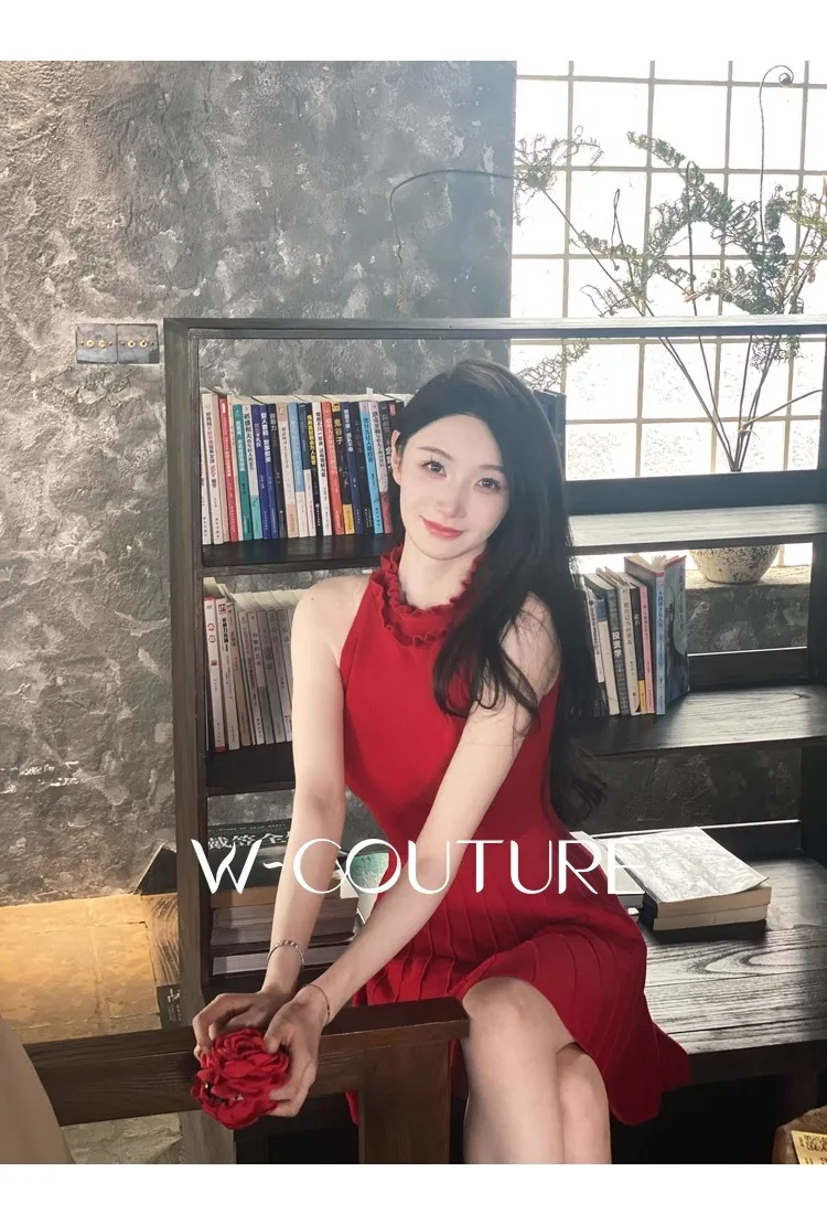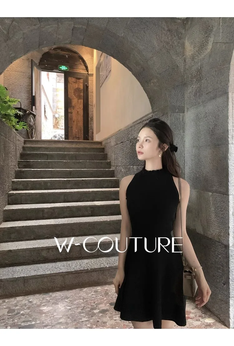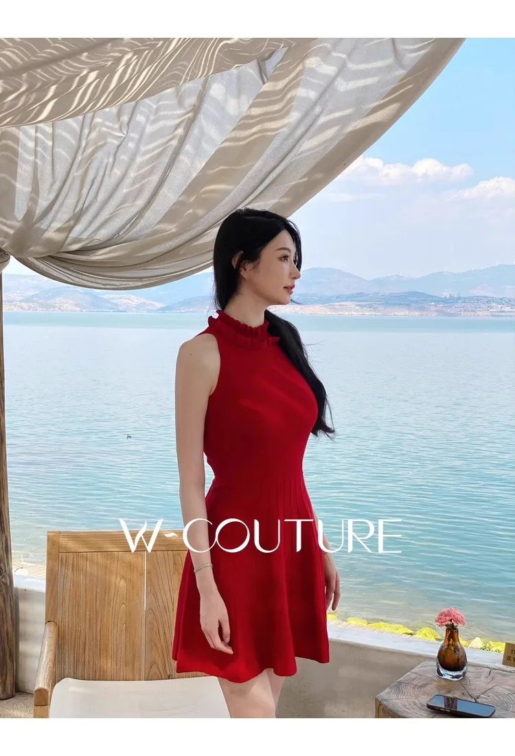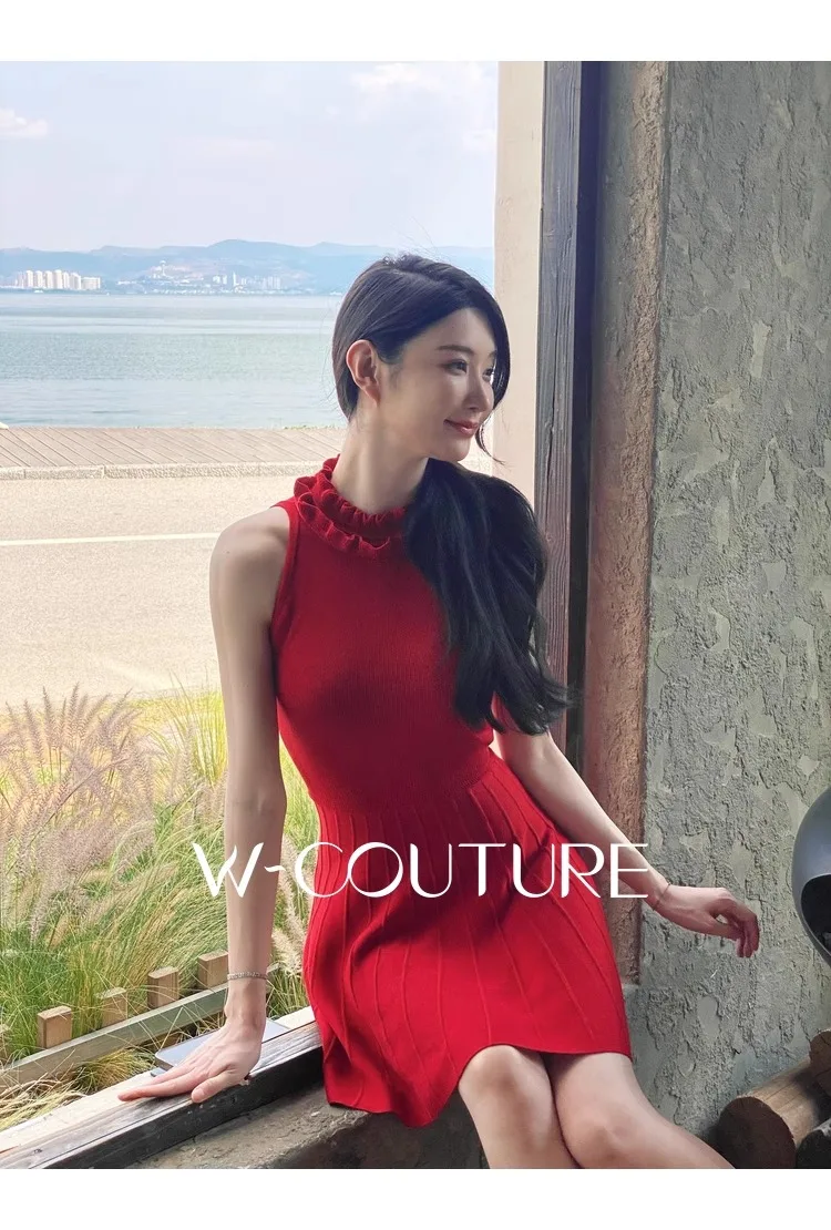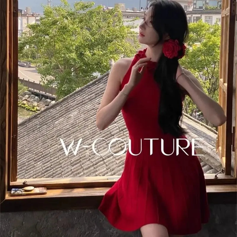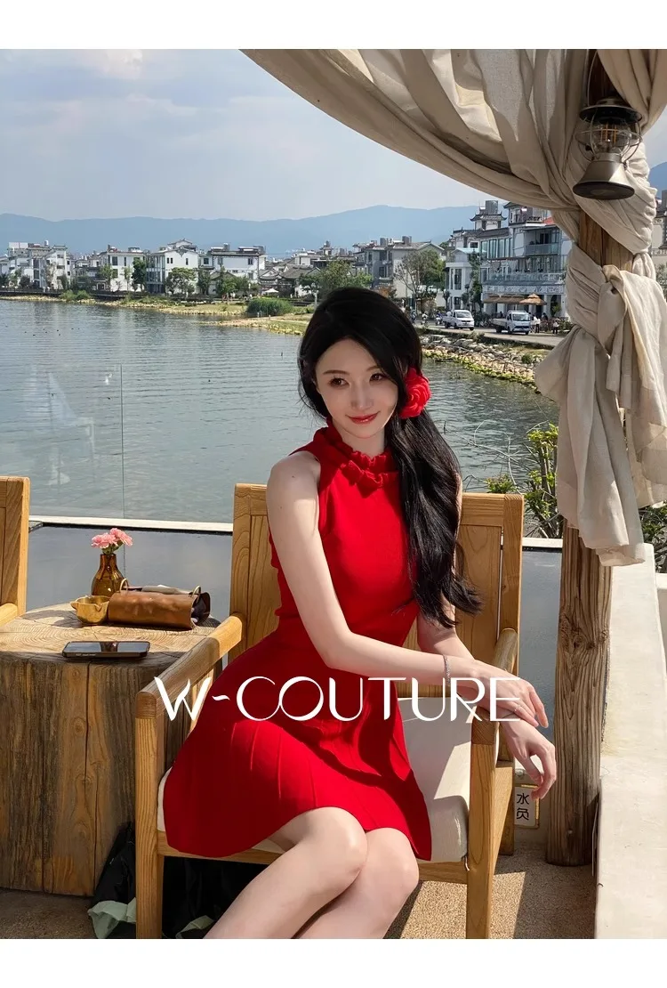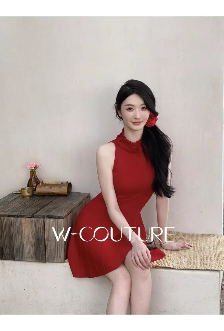 French Halter Neck Sleeveless Knitted Dress Summer Elegant Ruffle Slim Mini Dresses Women Solid Color A-Line Pleated Dress A026