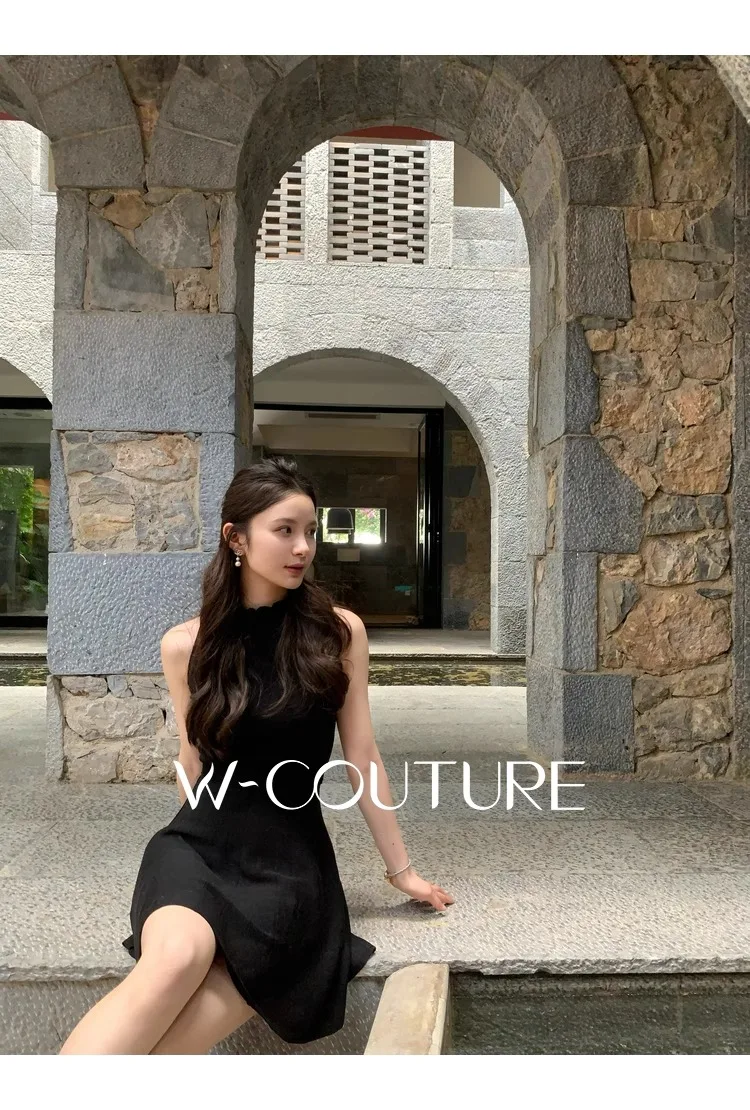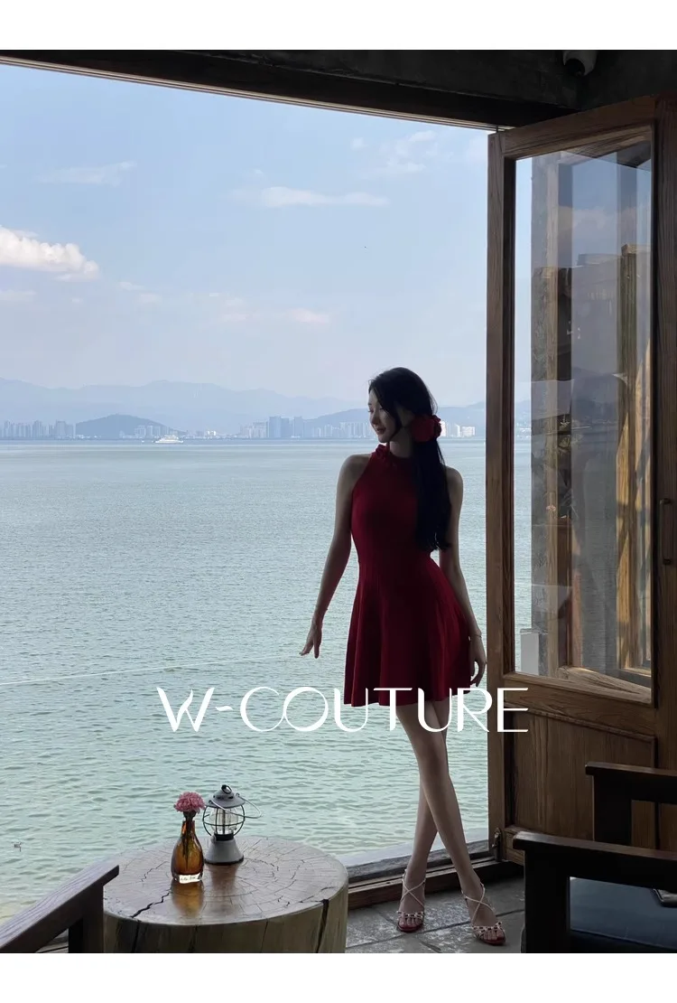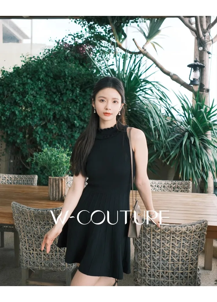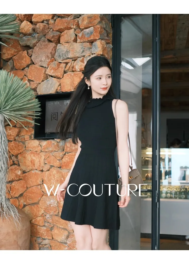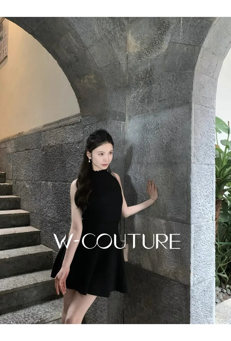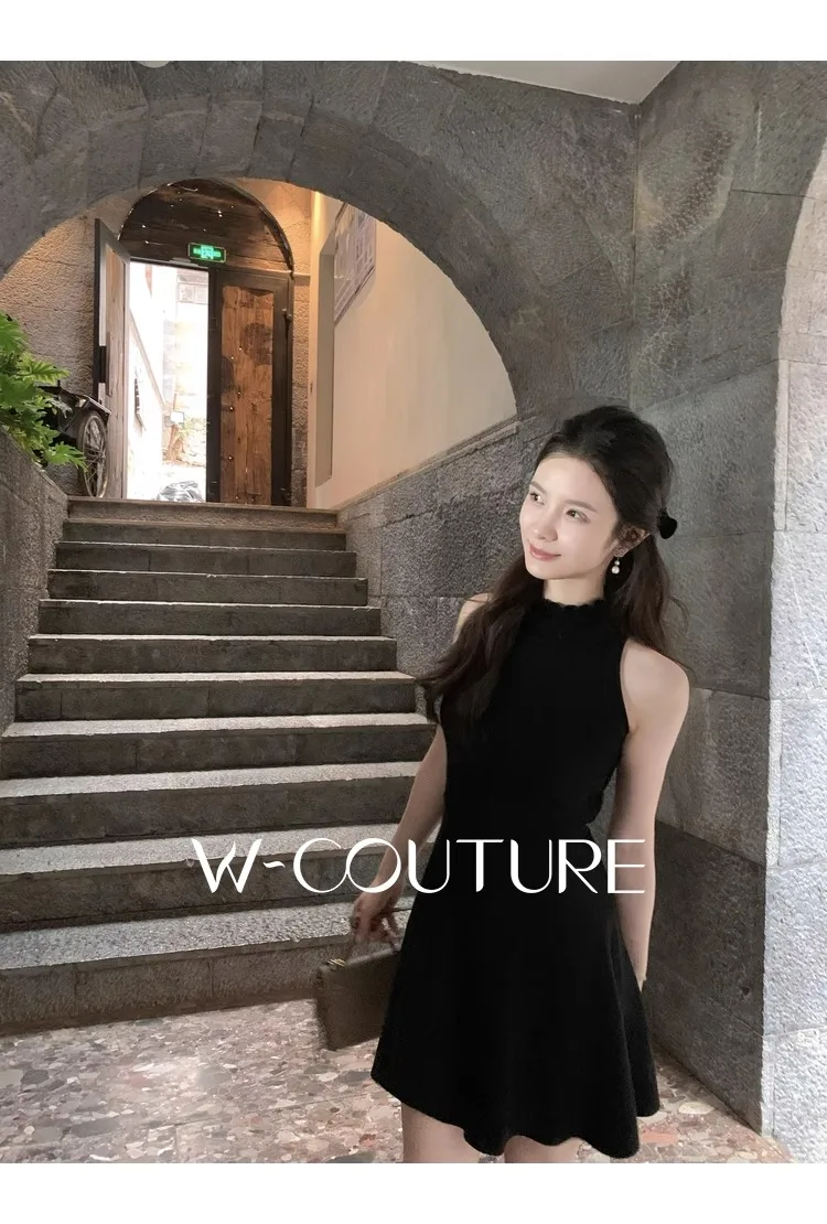 French Halter Neck Sleeveless Knitted Dress Summer Elegant Ruffle Slim Mini Dresses Women Solid Color A-Line Pleated Dress A026