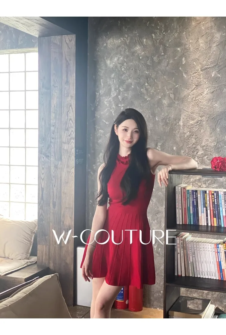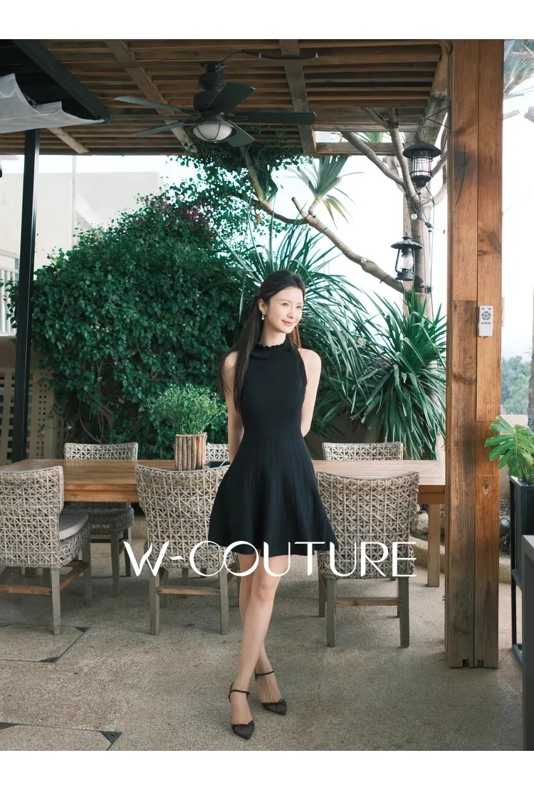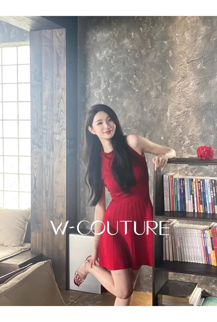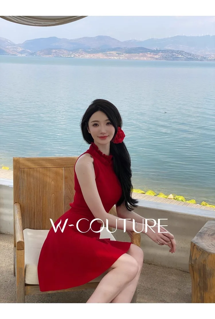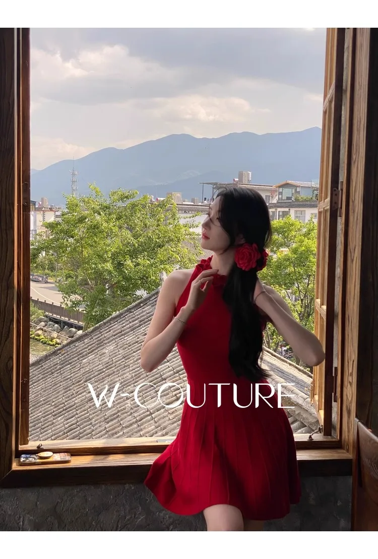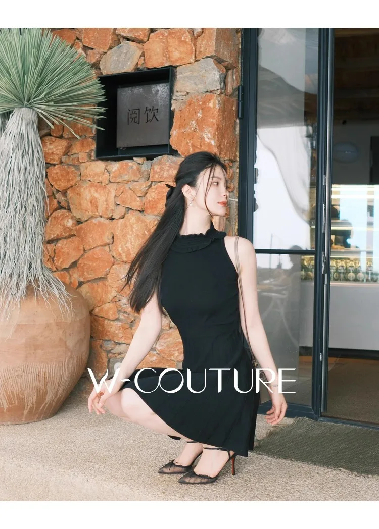 French Halter Neck Sleeveless Knitted Dress Summer Elegant Ruffle Slim Mini Dresses Women Solid Color A-Line Pleated Dress A026