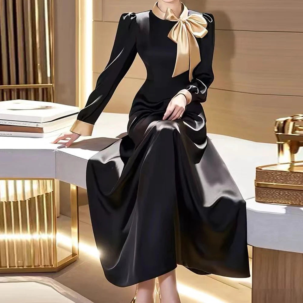 KYLETHOMASW - early autumn women's black satin long-sleeved dress formal settings high-end French waist bow dress