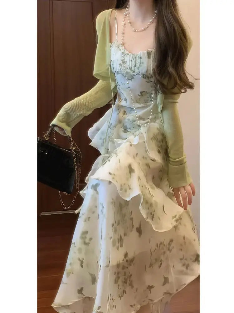 KYLETHOMASW - Elegant Floral Slim Waist Ruffles Camisole Cake Dress+ Summer Long Sleeve Cardigan Coat Women 2025 New Two Piece Sets