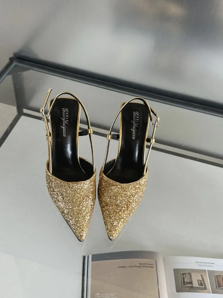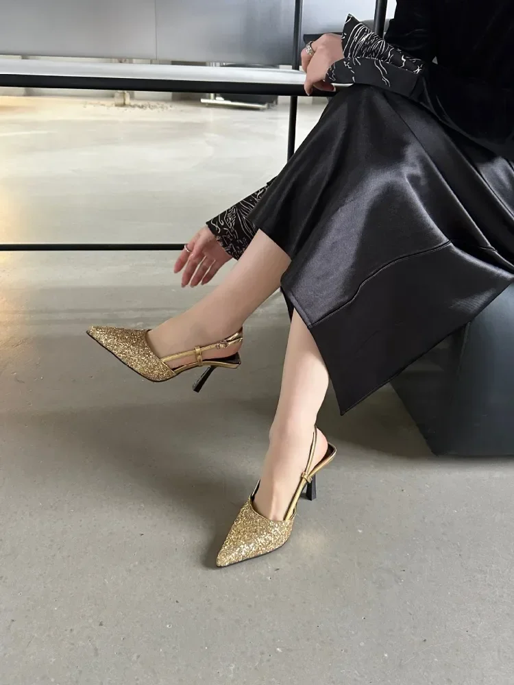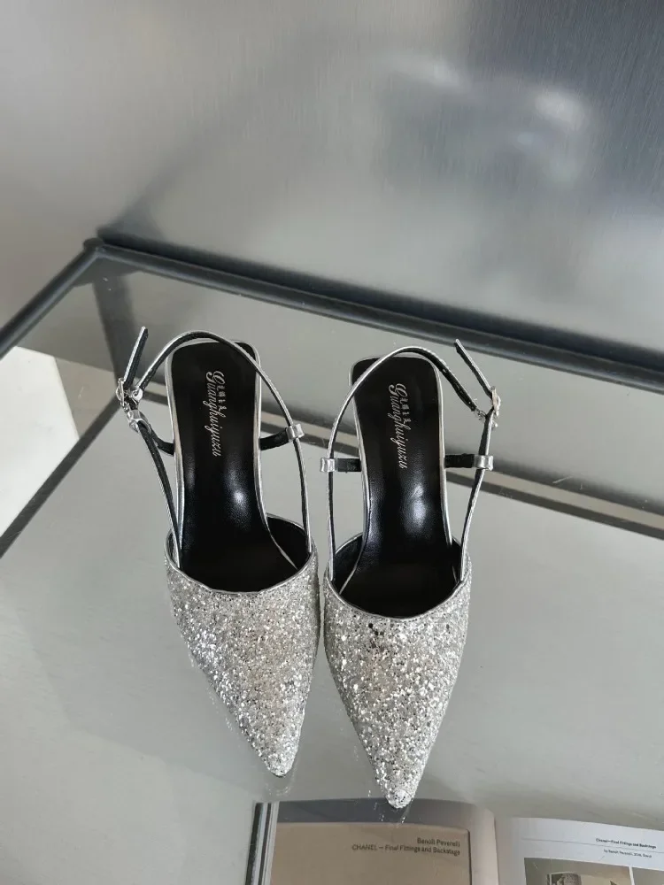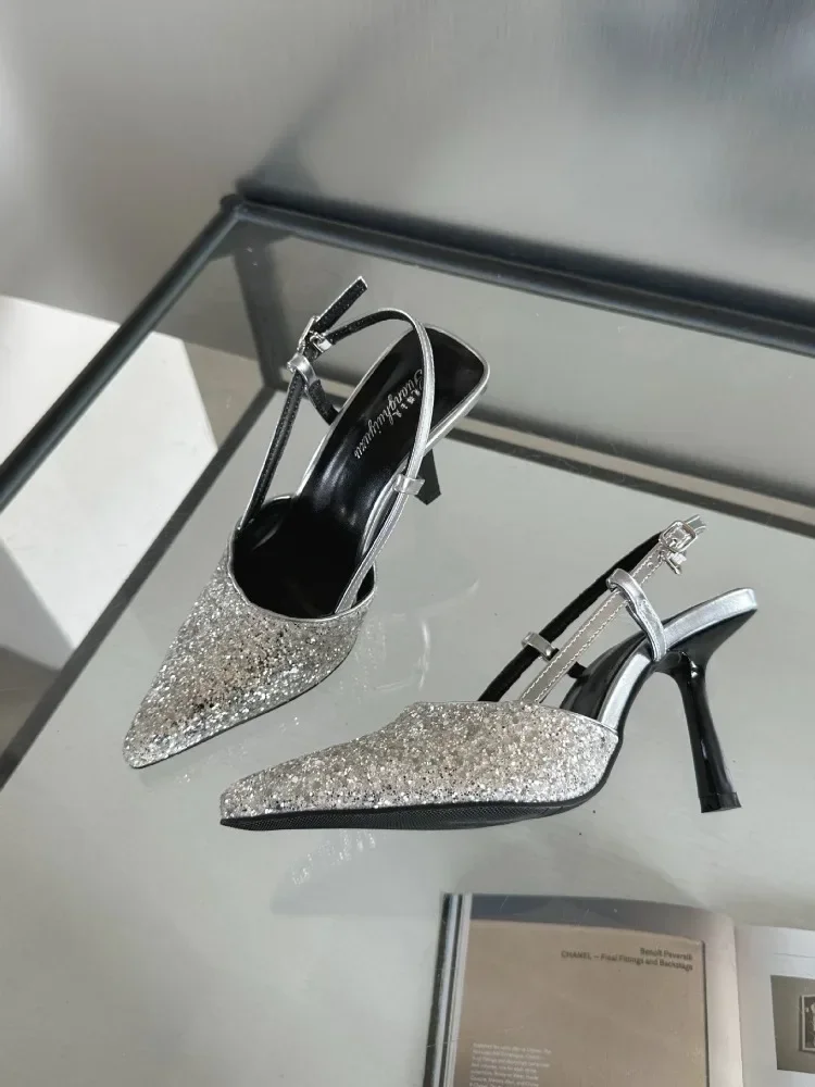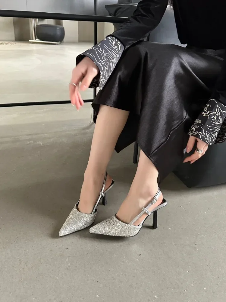 KYLETHOMASW - Luxury Bling Design Mules Sandals Women Sexy Pointed Toe Thin High Heels Summer Back Strap Banquet Dress Shoes Women Pums