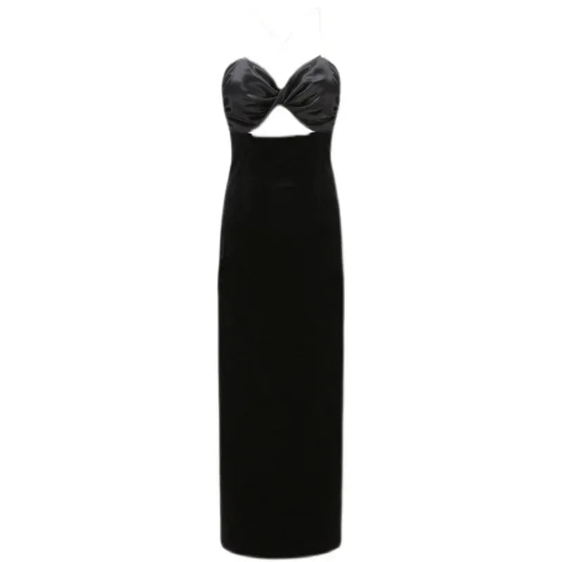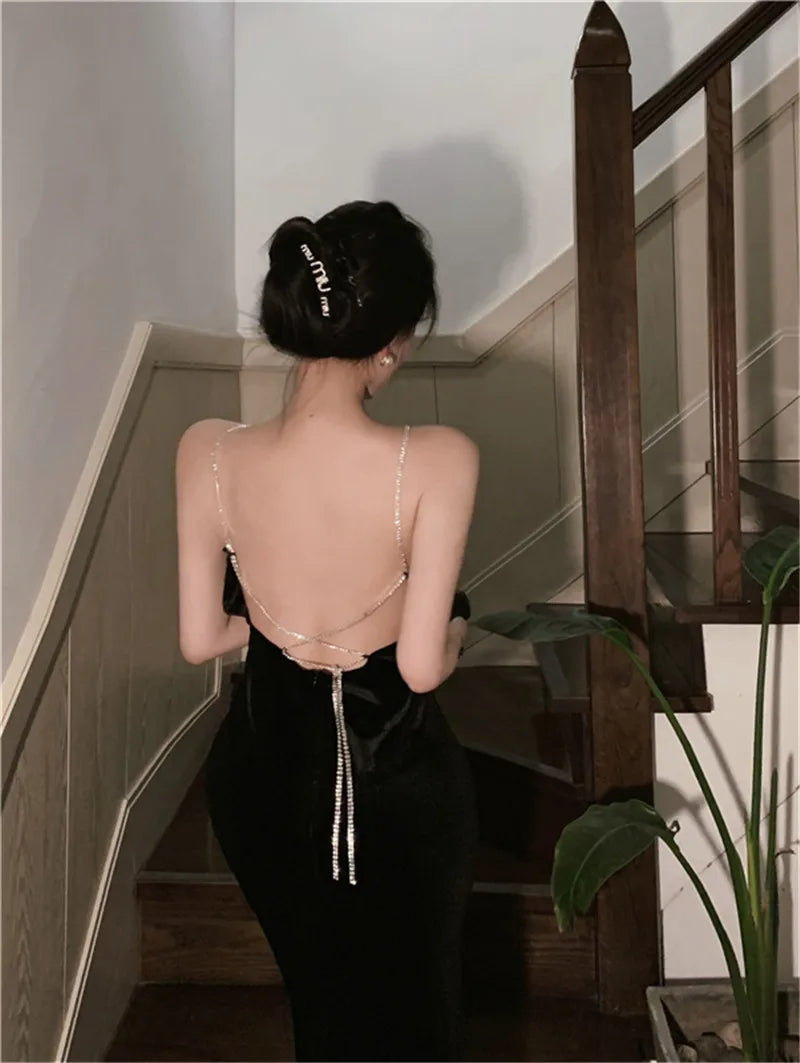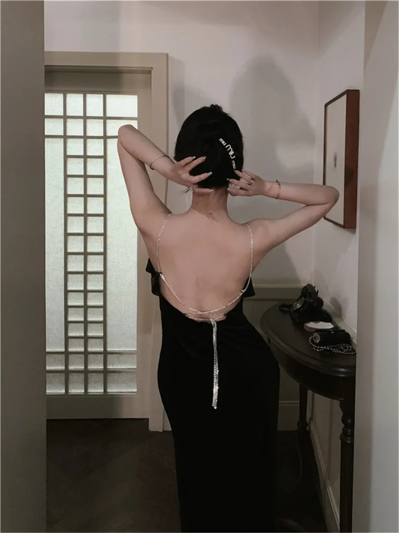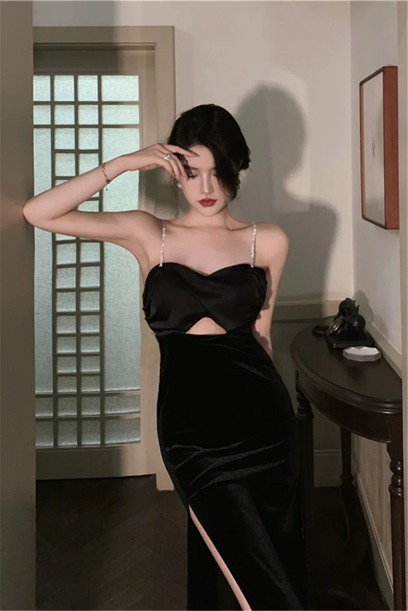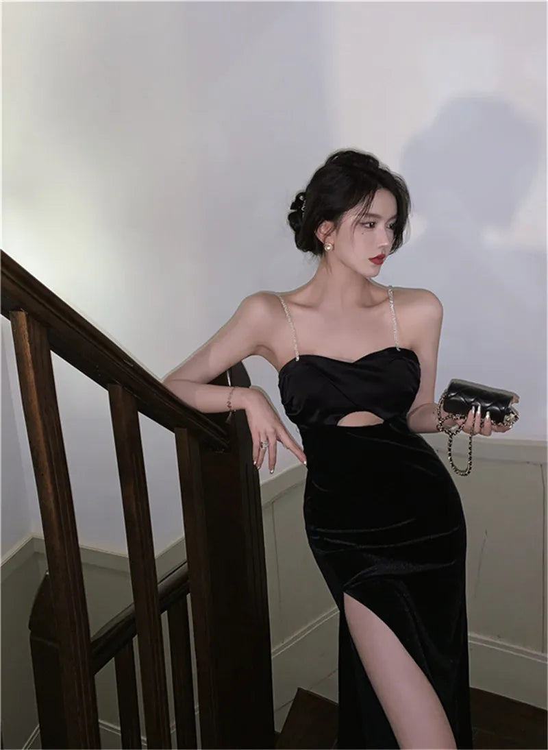 KYLETHOMASW  -  Sexy Backless Black Diamond Straps Dress Women French Hepburn High Split Velvet Dress Sleeveless Hollow Out Evening Party Dress