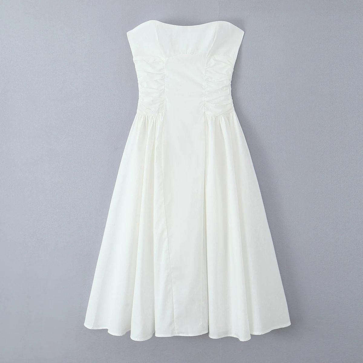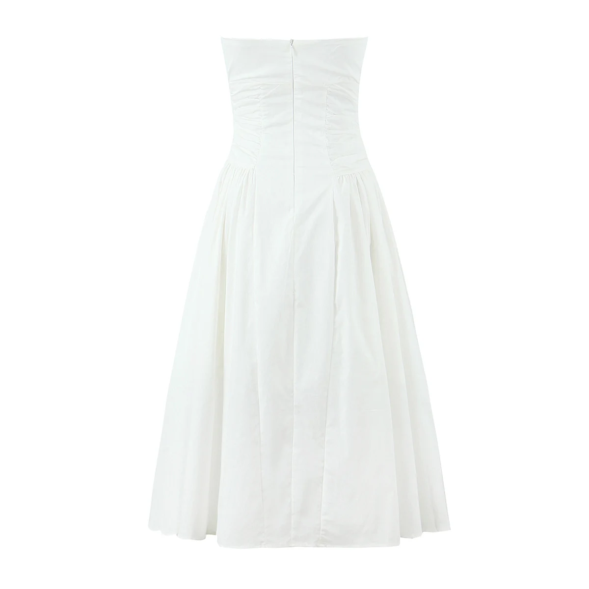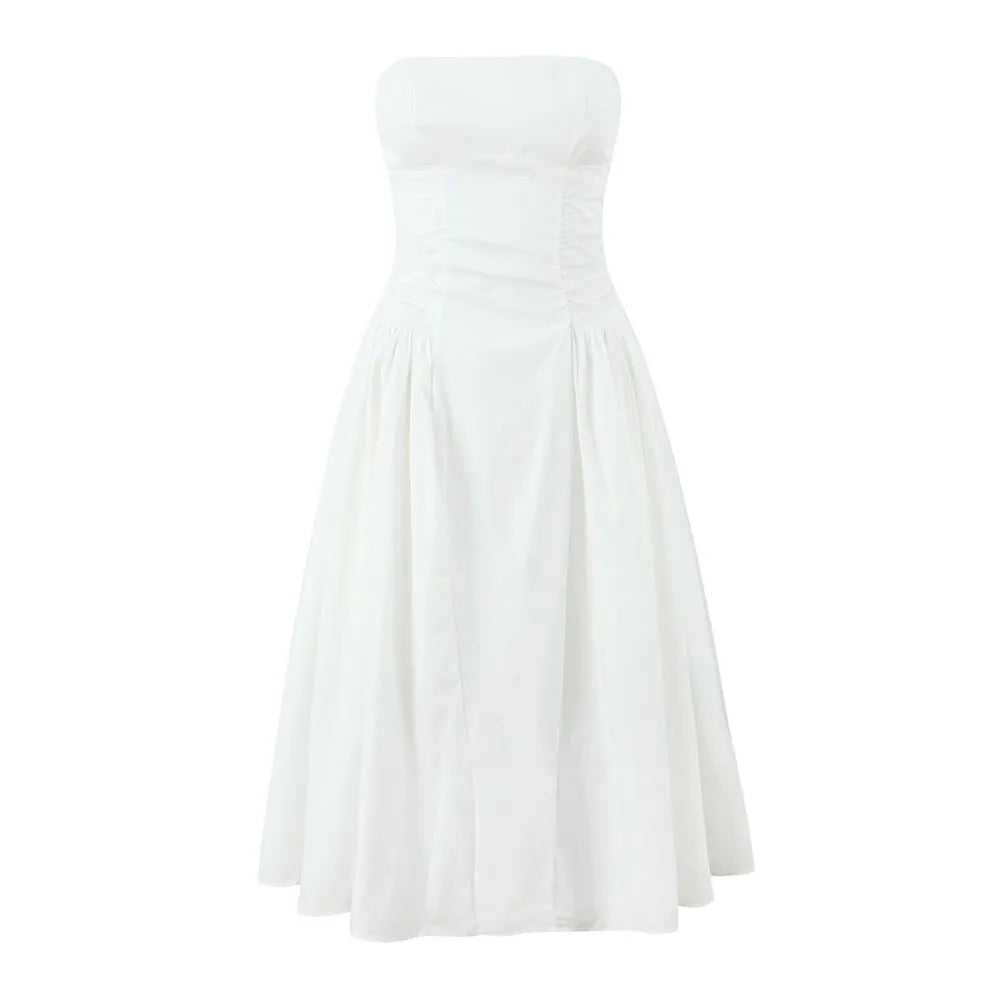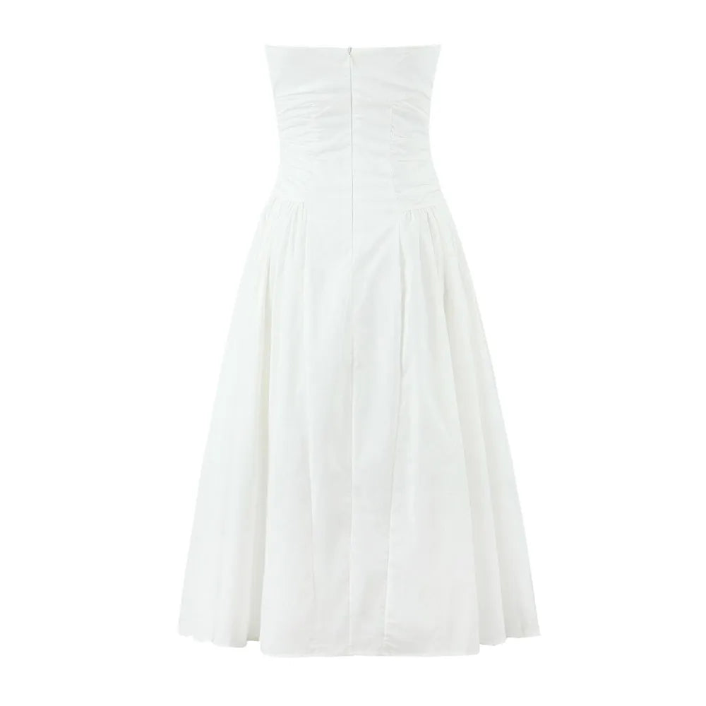 KYLETHOMASW - Sexy White Slash Collar Backless Midi Long Strapless Dress Women Pleated Folded Low Waist Pleated Ruched Hem Swing Party Robe