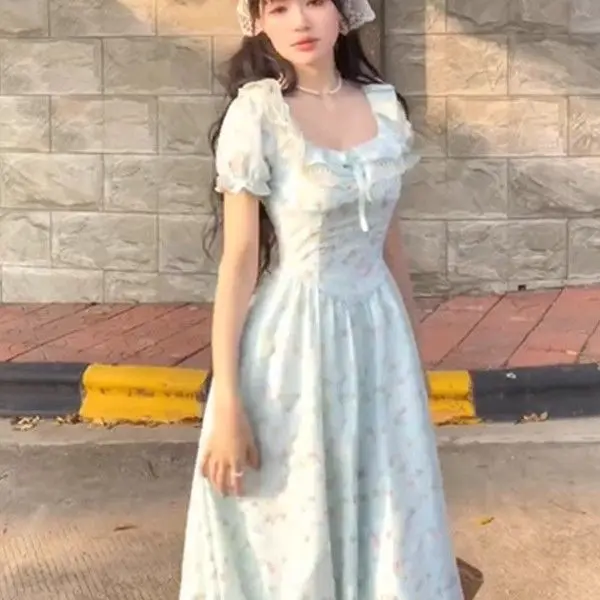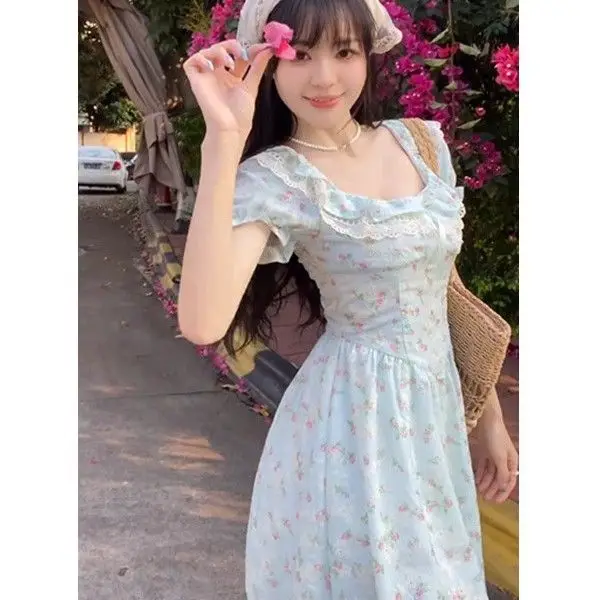 KYLETHOMASW - Summer French Sweet Floral Dress Women Puff Sleeve Slim Fit Lace Trim Waist Cinching Elegant Unique Design New Style Aesthetic