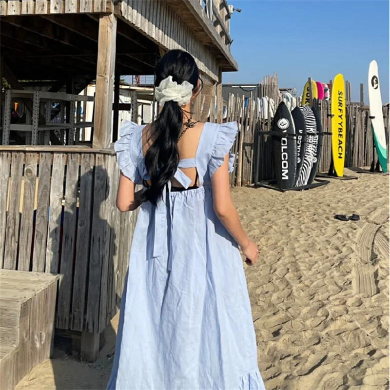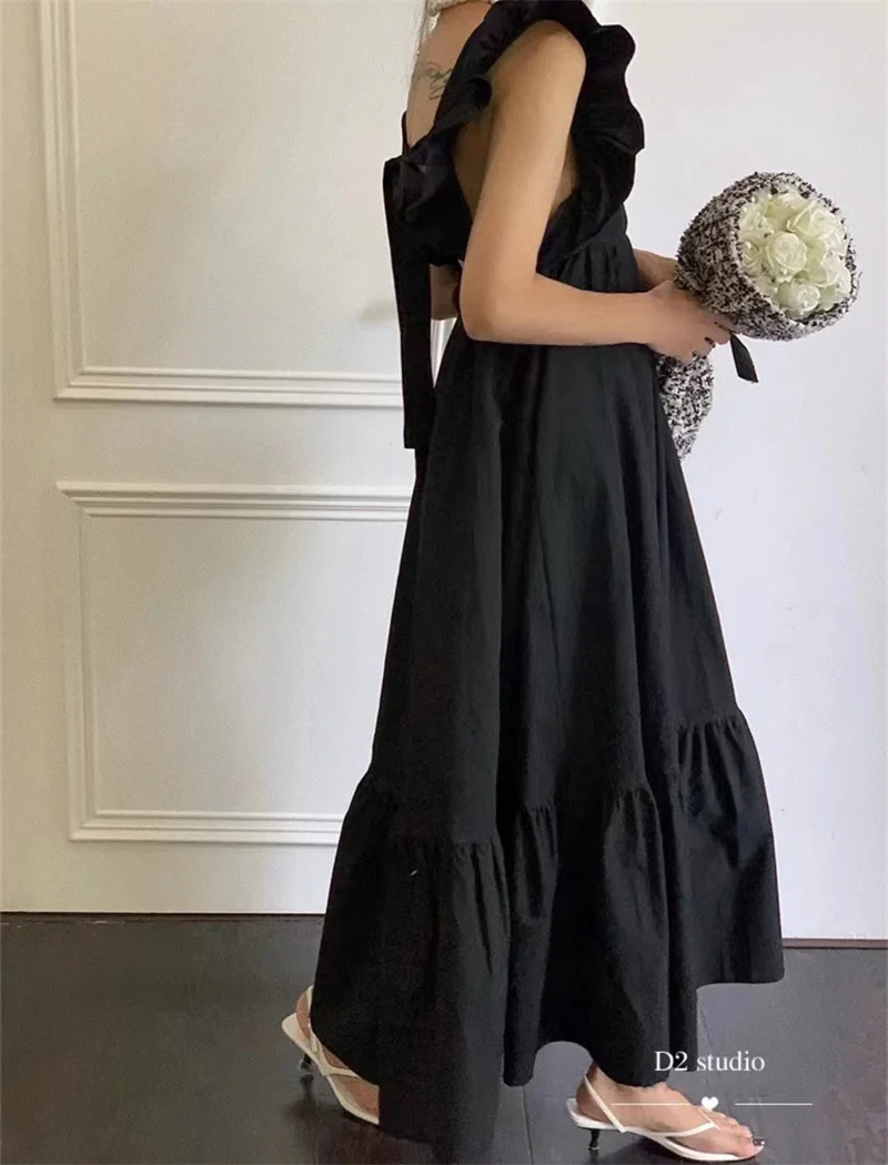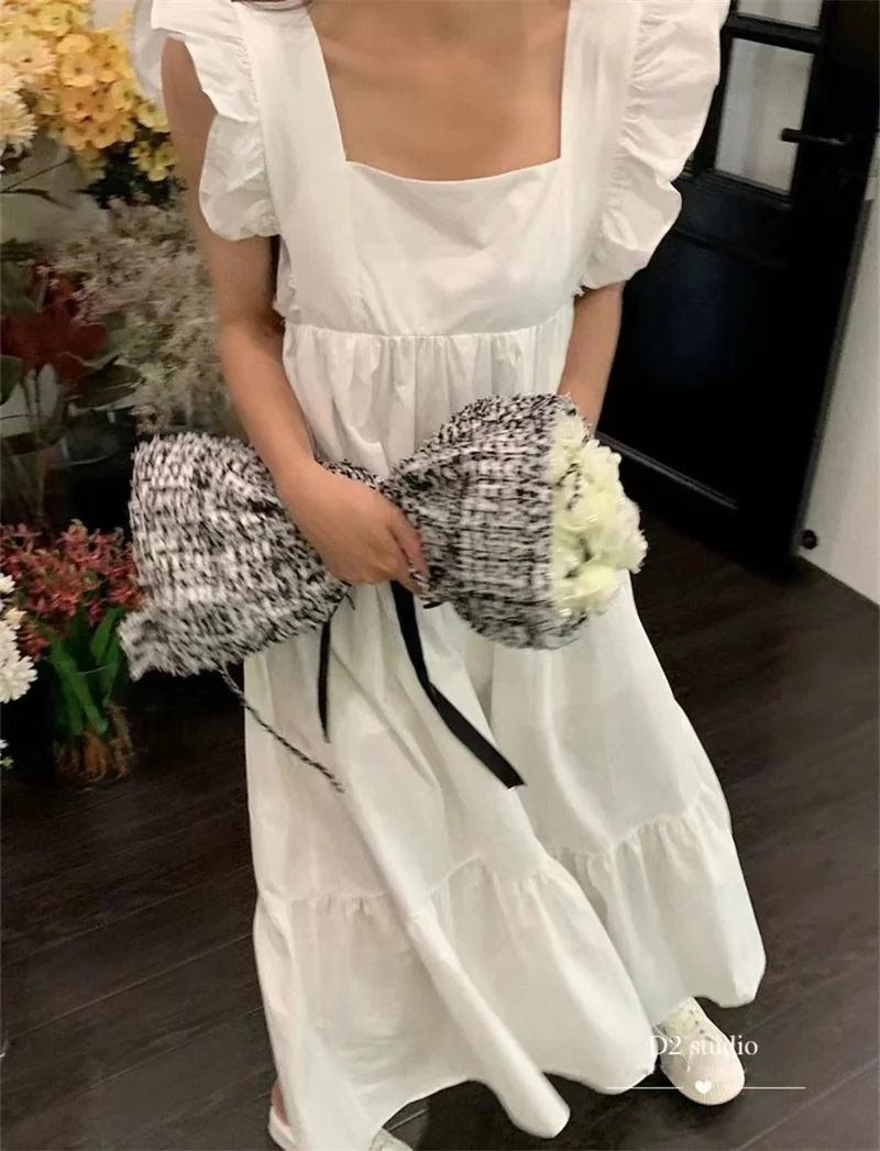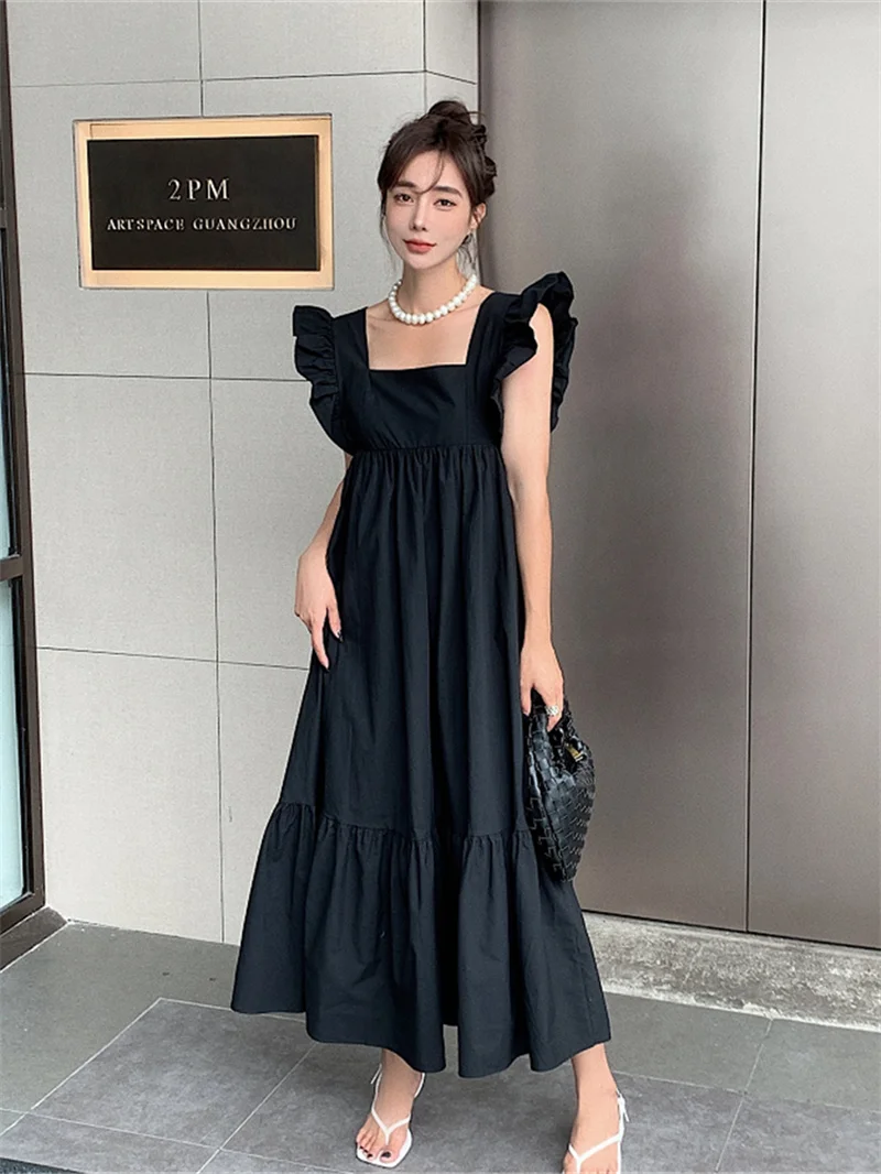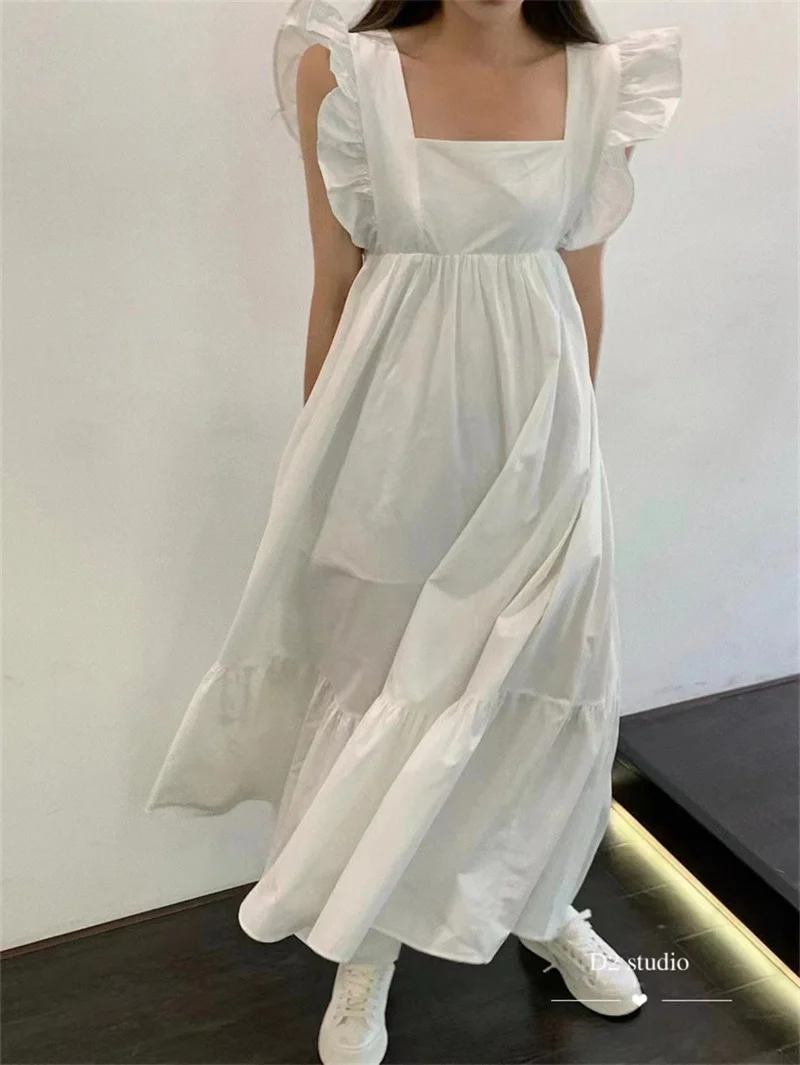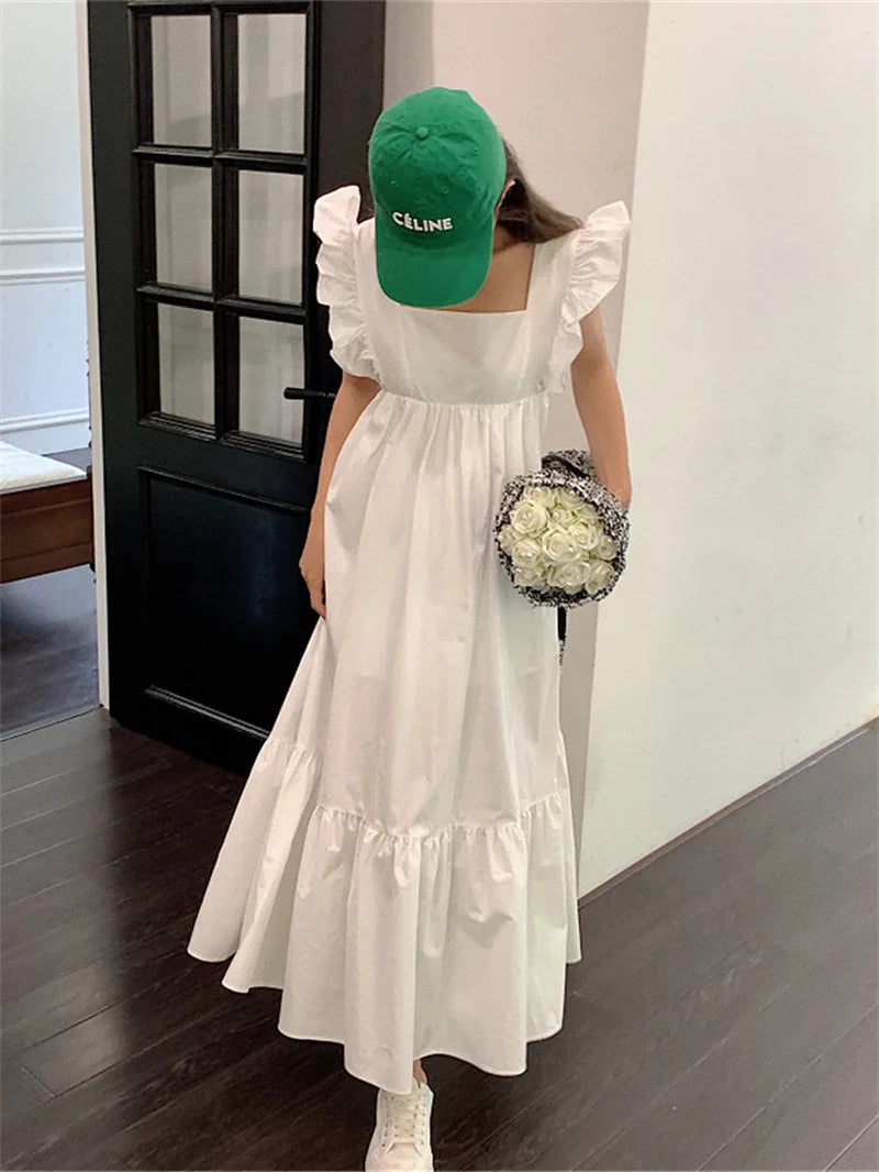 KYLETHOMASW - Summer Korean White Long Dress Women Ruffles Sweet Square Neck Backless A-Line Dress New Elegant Casual Women Clothes P739