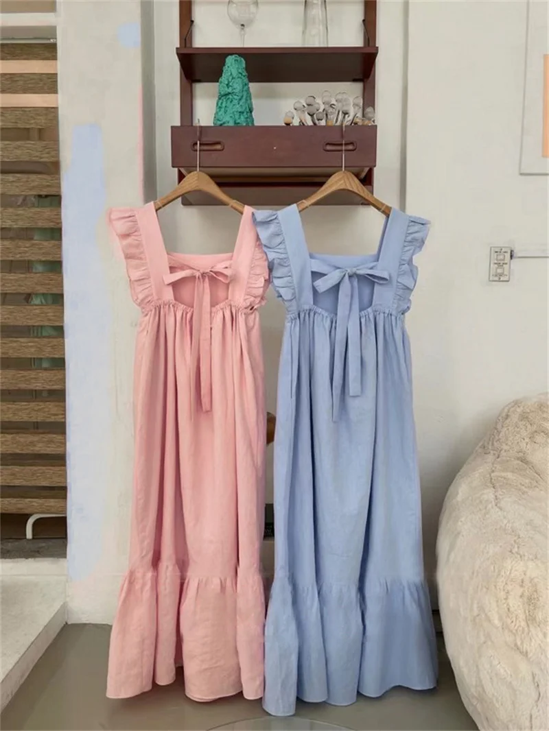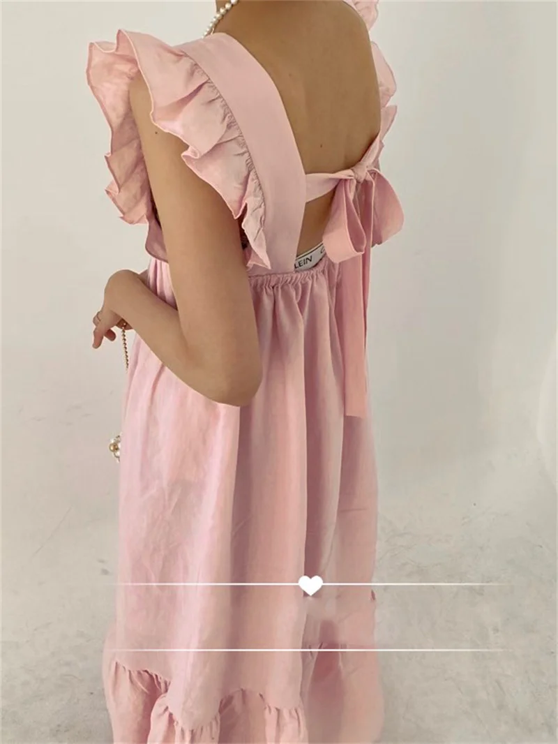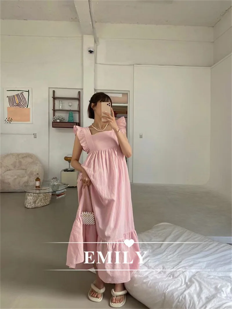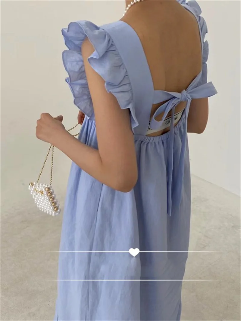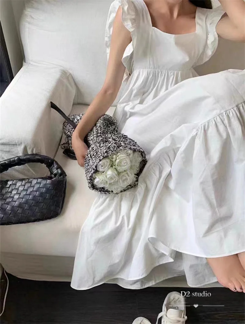 KYLETHOMASW - Summer Korean White Long Dress Women Ruffles Sweet Square Neck Backless A-Line Dress New Elegant Casual Women Clothes P739
