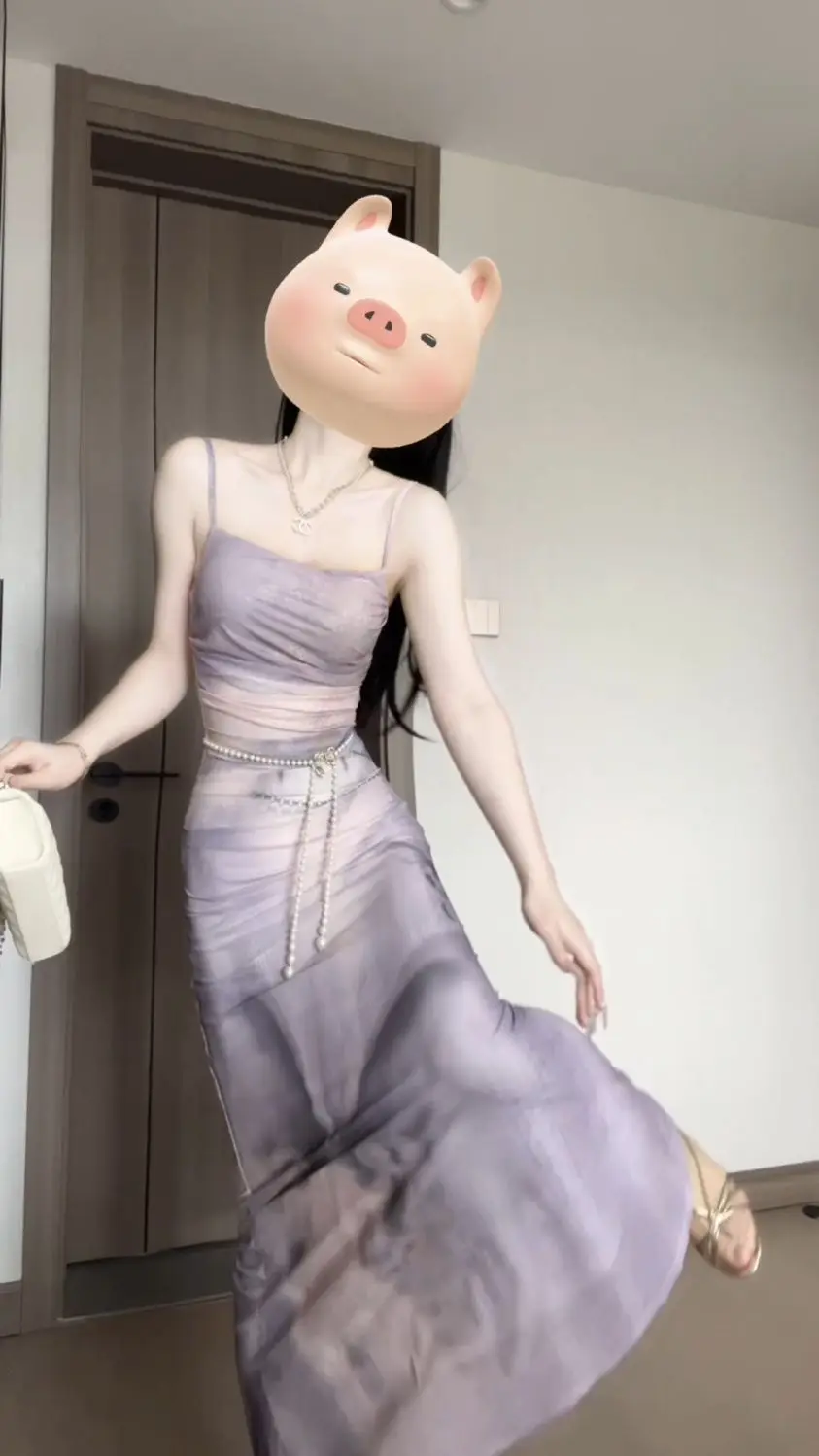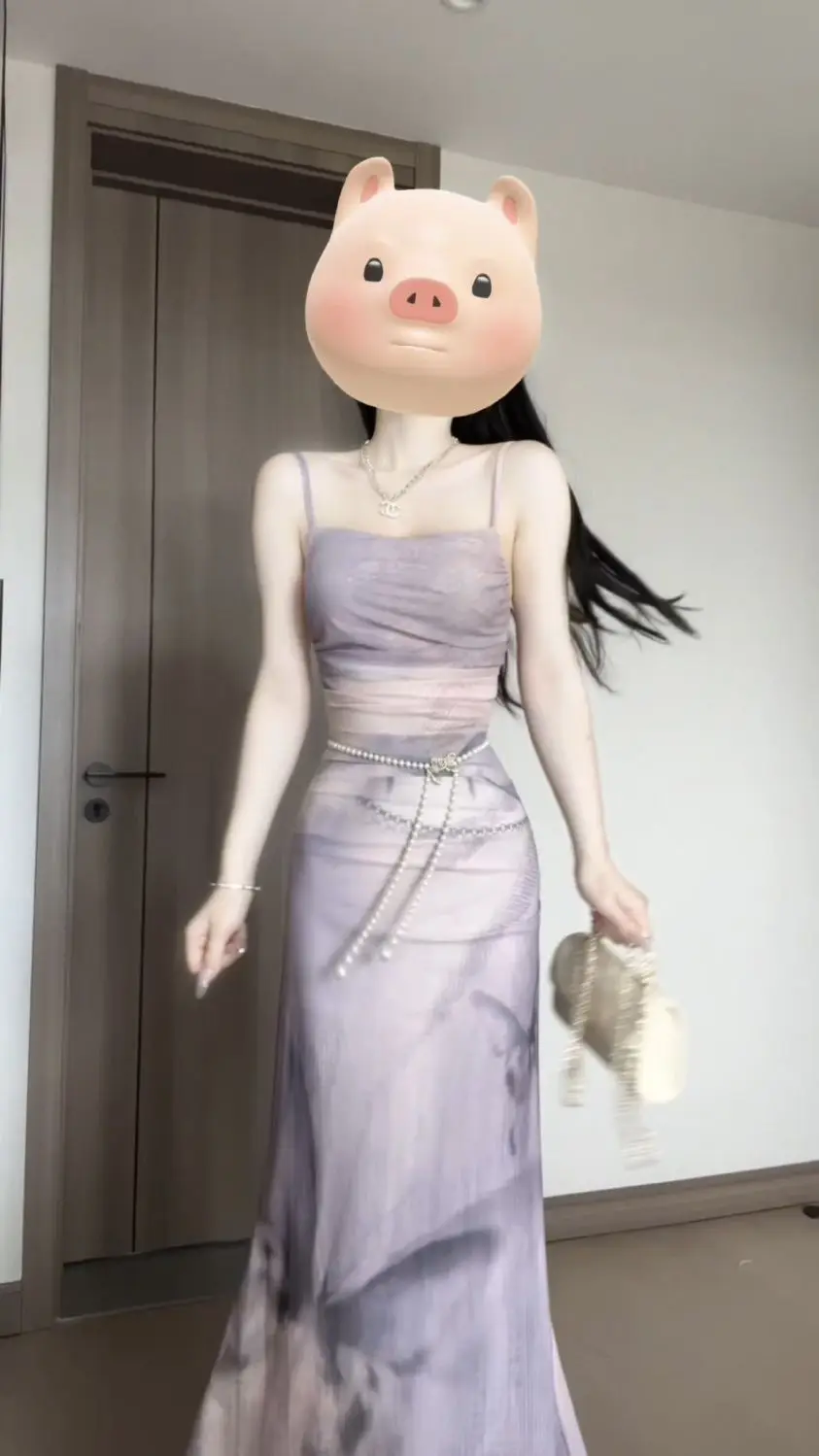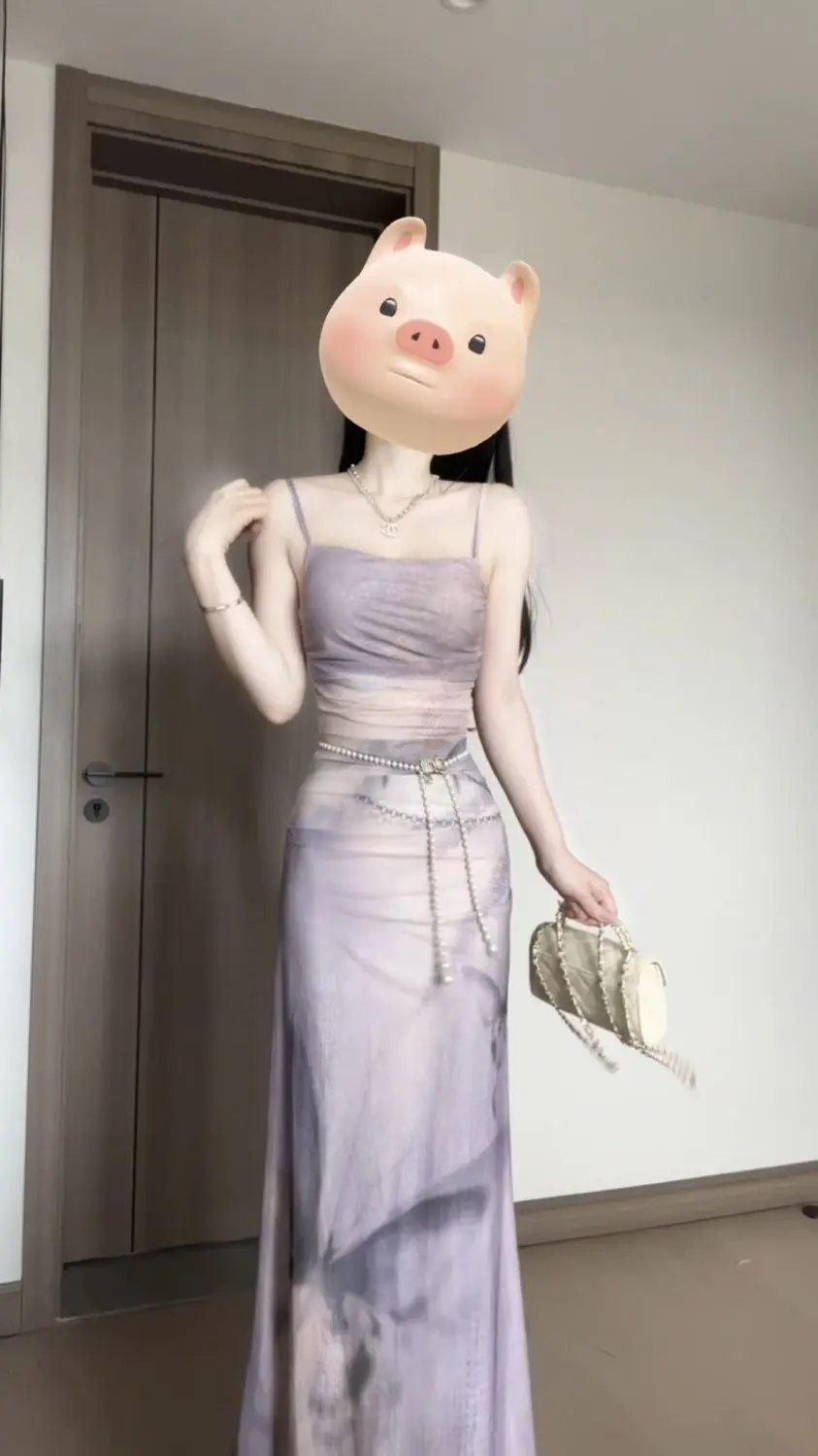 KYLETHOMASW - Sweet Purple Butterfly Printed Strap Camisole Dress for Women Summer Sexy Slim Fit Hip Wrapped Fishtail Long Dresses
