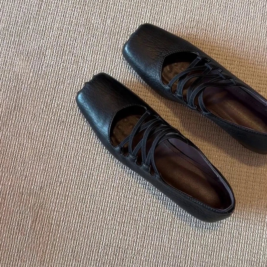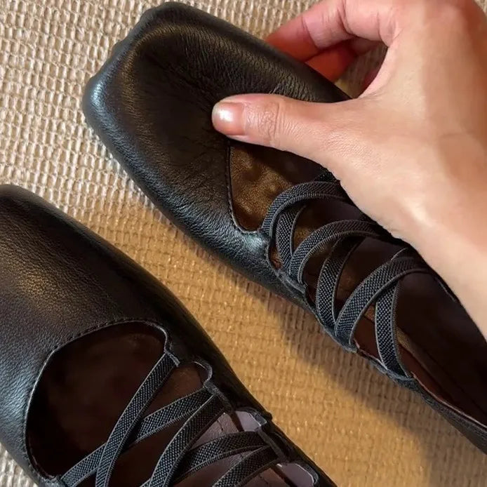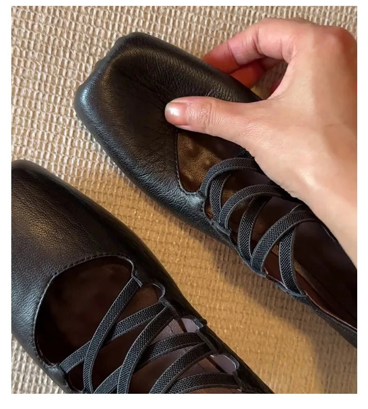 KYLETHOMASW - Women Sheepskin Square Toe Slip-on Pumps Elastic Band Cross Strap Wedge Med Heel Casual Female Daily Dress Heels Shoes Fashion