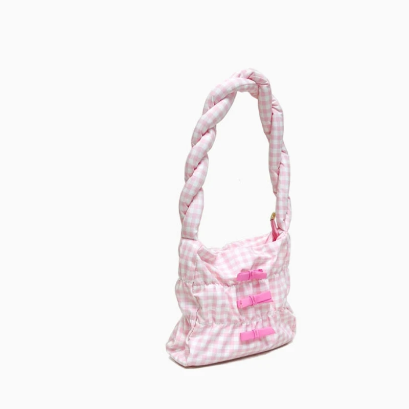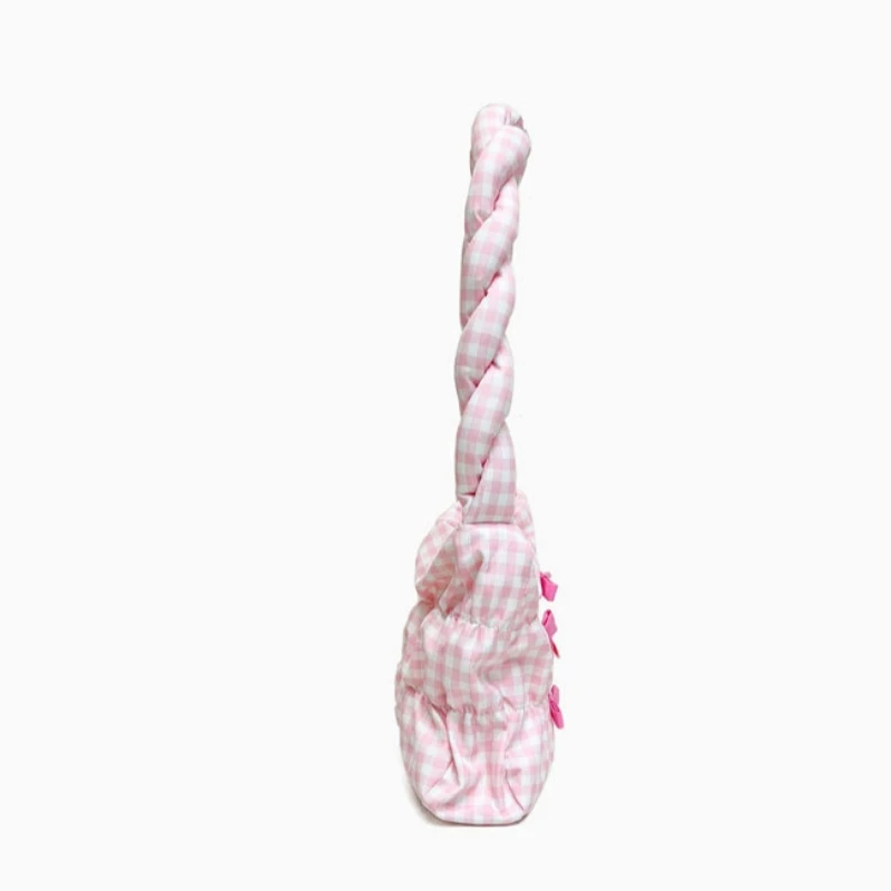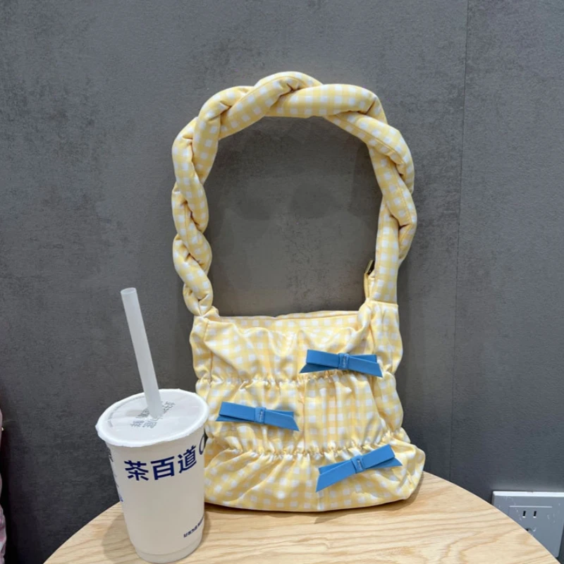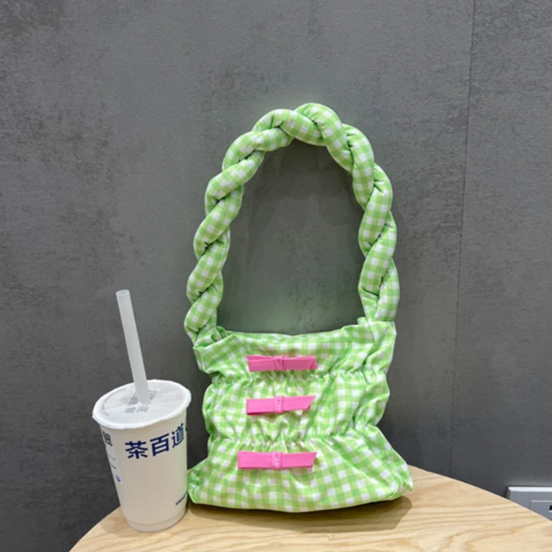 KYLETHOMASW - Sweet Girls Cute Bow Plaid Pattern Shoulder Bag Spring Summer Fashion Pleated Twist Handle Handbag Leisure Armpit Shopping Tote