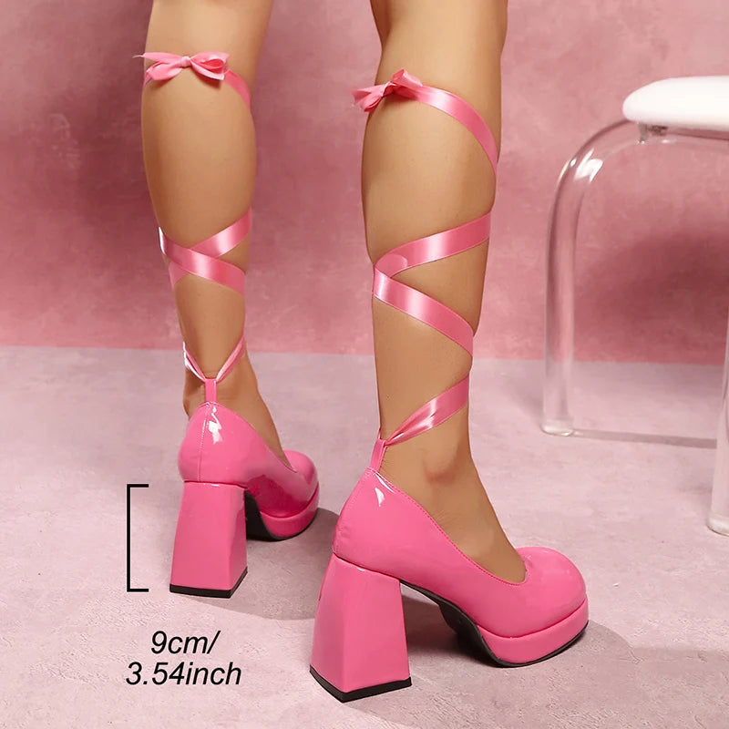 KYLETHOMASW  -  Elegant Wine Red Thick Heel Pumps Women Patent Leather High Heels Banquet Shoes Woman Lace Up Platform Mary Jane Shoes