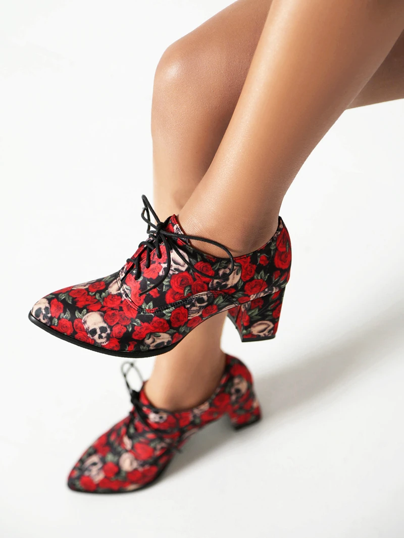 KIylethomasw Bohemian Style Printed Fabric Lace Up High Heeled Shoes Womens Round Toe Cross Tied Spring Autumn New Pumps Casual Oxfords 35-48