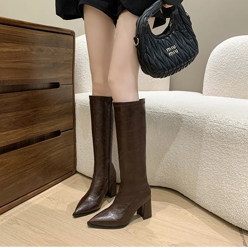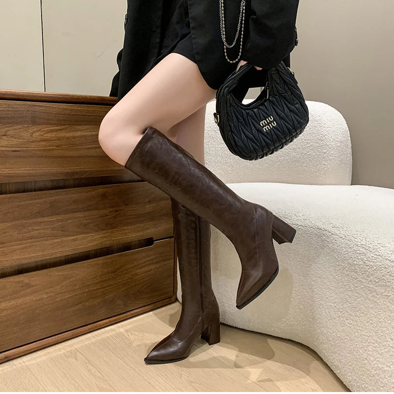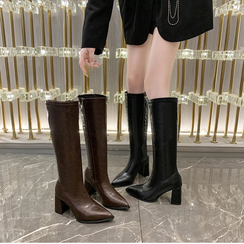 KYLETHOMASW - Autumn Winter Women Knee High Boots Fashion Knight Long Booties Square High Heels Shoes Botas Mujer